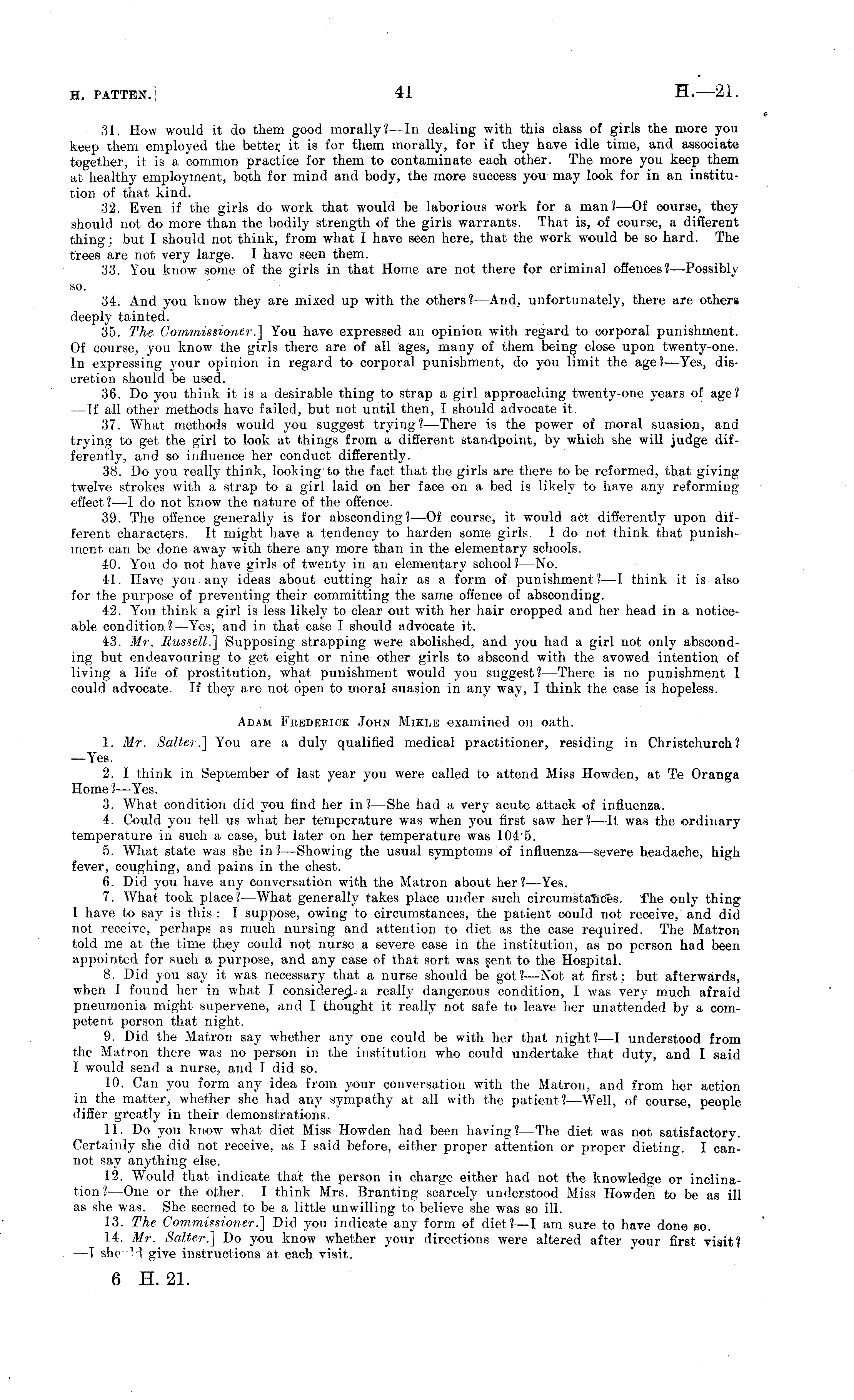 31. How would it do them good morally? —In dealing with this class of girls the more you keep them employed the better it is for them morally, for if they have idle time, and associate together, it is a common practice for them to contaminate each other. The more you keep them at healthy employment, both for mind and body, the more success you may look, for in an institution of that kind. 32. Even if the girls do work that would be laborious work for a man?—Of course, they should not do more than the bodily strength of the girls warrants. That is, of course, a different thing; but I should not think, from what I have seen here, that the work would be so hard. The trees are not very large. I have seen them. 33. You know some of the girls in that Home are not there for criminal offences? —Possibly so. 34. And you know they are mixed up with the others? —And, unfortunately, there are others deeply tainted. 35. The Commissioner.] You have expressed an opinion with regard to corporal punishment. Of course, you know the girls there are of all ages, many of them being close upon twenty-one. In expressing your opinion in regard to corporal punishment, do you limit the age?— Yes, discretion should be used. 36. Do you think it is a desirable thing to strap a girl approaching twenty-one years of age? —If all other methods have failed, but not until then, I should advocate it. 37. What methods would you suggest trying?— There is the power of moral suasion, and trying to get the girl to look at things from a different standpoint, by which she will judge differently, and so influence her conduct differently. 38. Do you really think, looking to the fact that the girls are there to be reformed, that giving twelve strokes with a strap to a girl laid on her face on a bed is likely to have any reforming effect ?—I do not know the nature of the offence. 39. The offence generally is for absconding?—Of course, it would act differently upon different characters. It might have a tendency to harden some girls. Ido not think that punishment can be done away with there any more than in the elementary schools. 40. You do not have girls of twenty in an elementary school? —No. 41. Have you any ideas about cutting hair as a form of punishment ?—I think it is also for the purpose of preventing their committing the same offence of absconding. 42. You think a girl is less likely to clear out with her hair cropped and her head in a noticeable condition ?—Yes, and in that case I should advocate it. 43. Mr. Russell.] Supposing strapping were abolished, and you had a girl not only absconding but endeavouring to get eight or nine other girls to abscond with the avowed intention of living a life of prostitution, what punishment would you suggest?— There is no punishment 1 could advocate. If they are not open to moral suasion in any way, I think the case is hopeless. Adam Frederick John Mikle examined on oath. 1. Mr. Salter.] You are a duly qualified medical practitioner, residing in Christchurch? —Yes. 2. I think in September of last year you were called to attend Miss Howden, at Te Oranga Home?— Yes. 3. What condition did you find her in?— She had a very acute attack of influenza. 4. Could you tell us what her temperature was when you first saw her ?—lt was the ordinary temperature in such a case, but later on her temperature was 1045. 5. What state was she in?— Showing the usual symptoms of influenza—severe headache, high fever, coughing, and pains in the chest. 6. Did you have any conversation with the Matron about her? —Yes. 7. What took place?— What generally takes place under such circumstances. The only thing I have to say is this : I suppose, owing to circumstances, the patient could not receive, and did not receive, perhaps as much nursing and attention to diet as the case required. The Matron told me at the time they could not nurse a severe case in the institution, as no person had been appointed for such a purpose, and any case of that sort was sent to the Hospital. 8. Did you say it was necessary that a nurse should be got?— Not at first; but afterwards, when I found her in what I consideretl. a really dangerous condition, I was very much afraid pneumonia might supervene, and I thought it really not safe to leave her unattended by a competent person that night. 9. Did the Matron say whether any one could be with her that night?—l understood from the Matron there was no person in the institution who could undertake that duty, and I said I would send a nurse, and I did so. 10. Can you form any idea from your conversation with the Matron, and from her action in the matter, whether she had any sympathy at all with the patient?— Well, of course, people differ greatly in their demonstrations. 11. Do you know what diet Miss Howden had been having? —The diet was not satisfactory. Certainly she did not receive, as I said before, either proper attention or proper dieting. I cannot say anything else. 12. Would that indicate that the person in charge either had not the knowledge or inclination?— One or the other. I think Mrs. Branting scarcely understood Miss Howden to be as ill as she was. She seemed to be a little unwilling to believe she was so ill. 13. The Commissioner.] Did you indicate any form of diet?—l am sure to have done so. 14. Mr. Salter.] Do you know whether your directions were altered after your first visit? —I she" 1 1 give instructions at each visit.