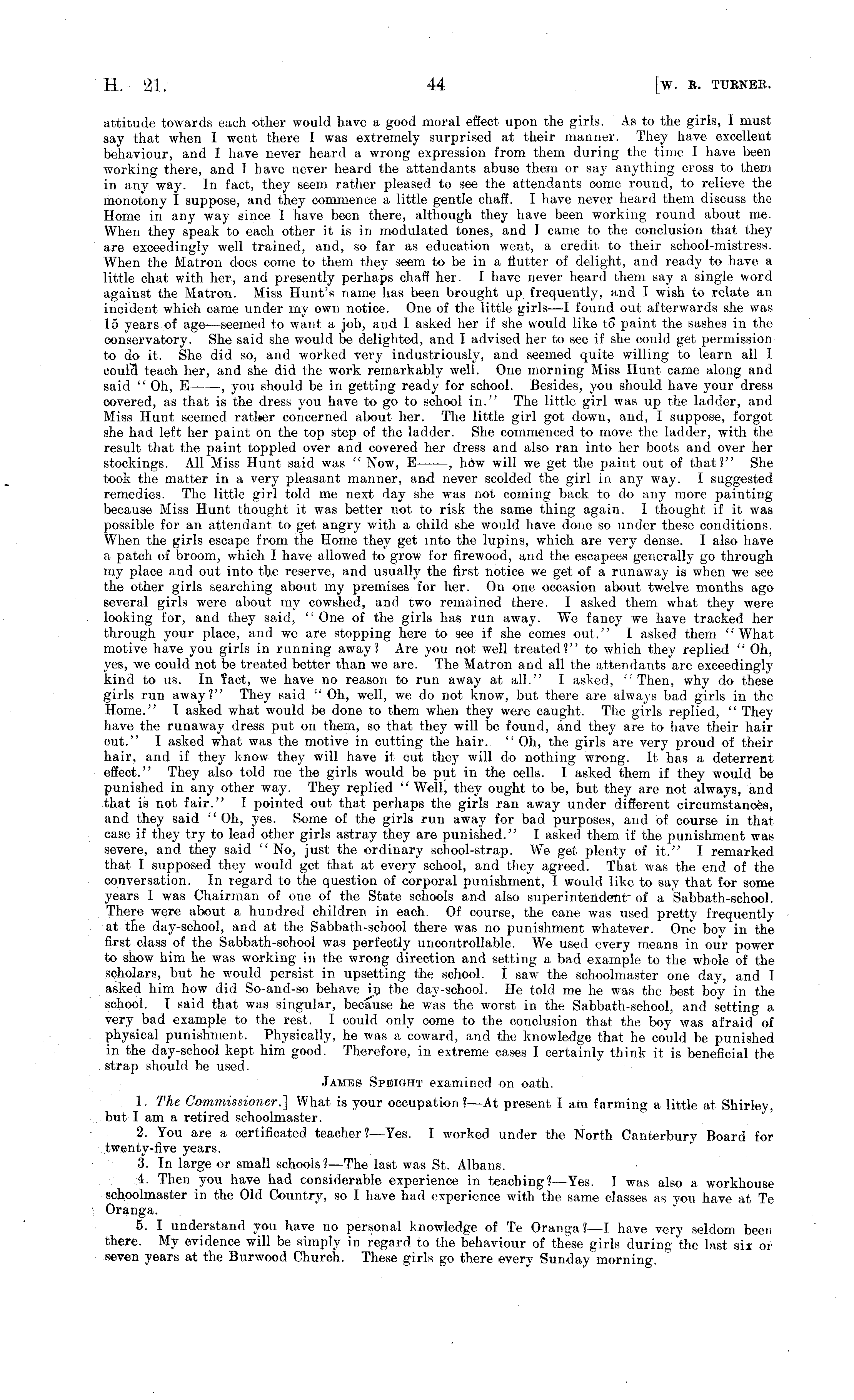 attitude towards each other would have a good moral effect upon the girls. As to the girls, I must say that when I went there I was extremely surprised at their manner. They have excellent behaviour, and I have never heard a wrong expression from them during the time I have been working there, and I have never heard the attendants abuse them or say anything cross to them in any way. In fact, they seem rather pleased to see the attendants come round, to relieve the monotony I suppose, and they commence a little gentle chaff. I have never heard them discuss the Home in any way since I have been there, although they have been working round about me. When they speak to each other it is in modulated tones, and I came to the conclusion that they are exceedingly well trained, and, so far as education went, a credit to their school-mistress. When the Matron does come to them they seem to be in a flutter of delight, and ready to have a little chat with her, and presently perhaps chaff her. I have never heard them say a single word against the Matron. Miss Hunt's name has been brought up frequently, and I wish to relate an incident which came under my own notice. One of the little girls—l found out afterwards she was 15 years of age- —seemed to want a job, and I asked her if she would like to paint the sashes in the conservatory. She said she would be delighted, and I advised her to see if she could get permission to do it. She did so, and worked very industriously, and seemed quite willing to learn all I could teach her, and she did the work remarkably well. One morning Miss Hunt came along and said " Oh, E , you should be in getting ready for school. Besides, you should have your dress covered, as that is the dress you have to go to school in." The little girl was up the ladder, and Miss Hunt seemed ratl*er concerned about her. The little girl got down, and, I suppose, forgot she had left her paint on the top step of the ladder. She commenced to move the ladder, with the result that the paint toppled over and covered her dress and also ran into her boots and over her stockings. All Miss Hunt said was " Now, E , how will we get the paint out of that?" She took the matter in a very pleasant maimer, and never scolded the girl in any way. I suggested remedies. The little girl told me next day she was not coming back to do any more painting because Miss Hunt thought it was better not to risk the same thing again. I thought if it was possible for an attendant to get angry with a child she would have done so under these conditions. When the girls escape from the Home they get into the lupins, which are very dense. I also have a patch of broom, which I have allowed to grow for firewood, and the escapees generally go through my place and out into the reserve, and usually the first notice we get of a runaway is when we see the other girls searching about my premises for her. On one occasion about twelve months ago several girls were about my cowshed, and two remained there. I asked them what they were looking for, and they said, "One of the girls has run away. We fancy we have tracked her through your place, and we are stopping here to see if she comes out," I asked them "What motive have you girls in running away? Are you not well treated?" to which they replied " Oh, yes, we could not be treated better than we are. The Matron and all the attendants are exceedingly kind to us. In Tact, we have no reason to run away at all." I asked, "Then, why do these girls run away?" They said " Oh, well, we do not know, but there are always bad girls in the Home." I asked what would be done to them when they were caught. The girls replied, " They have the runaway dress put on them, so that they will be found, and they are to have their hair cut." I asked what was the motive in cutting the hair. " Oh, the girls are very proud of their hair, and if they know they will have it cut they will do nothing wrong. It has a deterrent effect." They also told me the girls would be put in the cells. I asked them if they would be punished in any other way. They replied " Well, they ought to be, but they are not always, and that is not fair." I pointed out that perhaps the girls ran away under different circumstances, and they said "Oh, yes. Some of the girls run away for bad purposes, and of course in that case if they try to lead other girls astray they are punished," I asked them if the punishment was severe, and they said "No, just the ordinary school-strap. We get plenty of it." I remarked that I supposed they would get that at every school, and they agreed. That was the end of the conversation. In regard to the question of corporal punishment, I would like to say that for some years I was Chairman of one of the State schools and also superintendent" of a Sabbath-school. There were about a hundred children in each. Of course, the cane was used pretty frequently at the day-school, and at the Sabbath-school there was no punishment whatever. One boy in the first class of the Sabbath-school was perfectly uncontrollable. We used every means in our power to show him he was working in the wrong direction and setting a bad example to the whole of the scholars, but he would persist in upsetting the school. I saw the schoolmaster one day, and I asked him how did So-and-so behave to the day-school. He told me he was the best boy in the school. I said that was singular, because he was the worst in the Sabbath-school, and setting a very bad example to the rest. I could only come to the conclusion that the boy was afraid of physical punishment. Physically, he was a coward, and the knowledge that he could be punished in the day-school kept him good. Therefore, in extreme cases I certainly think it is beneficial the strap should be used. James Speight examined on oath. 1. The Commissioner.] What is your occupation?—At present I am farming a little at Shirley, but I am a retired schoolmaster. 2. You are a certificated teacher?— Yes. I w