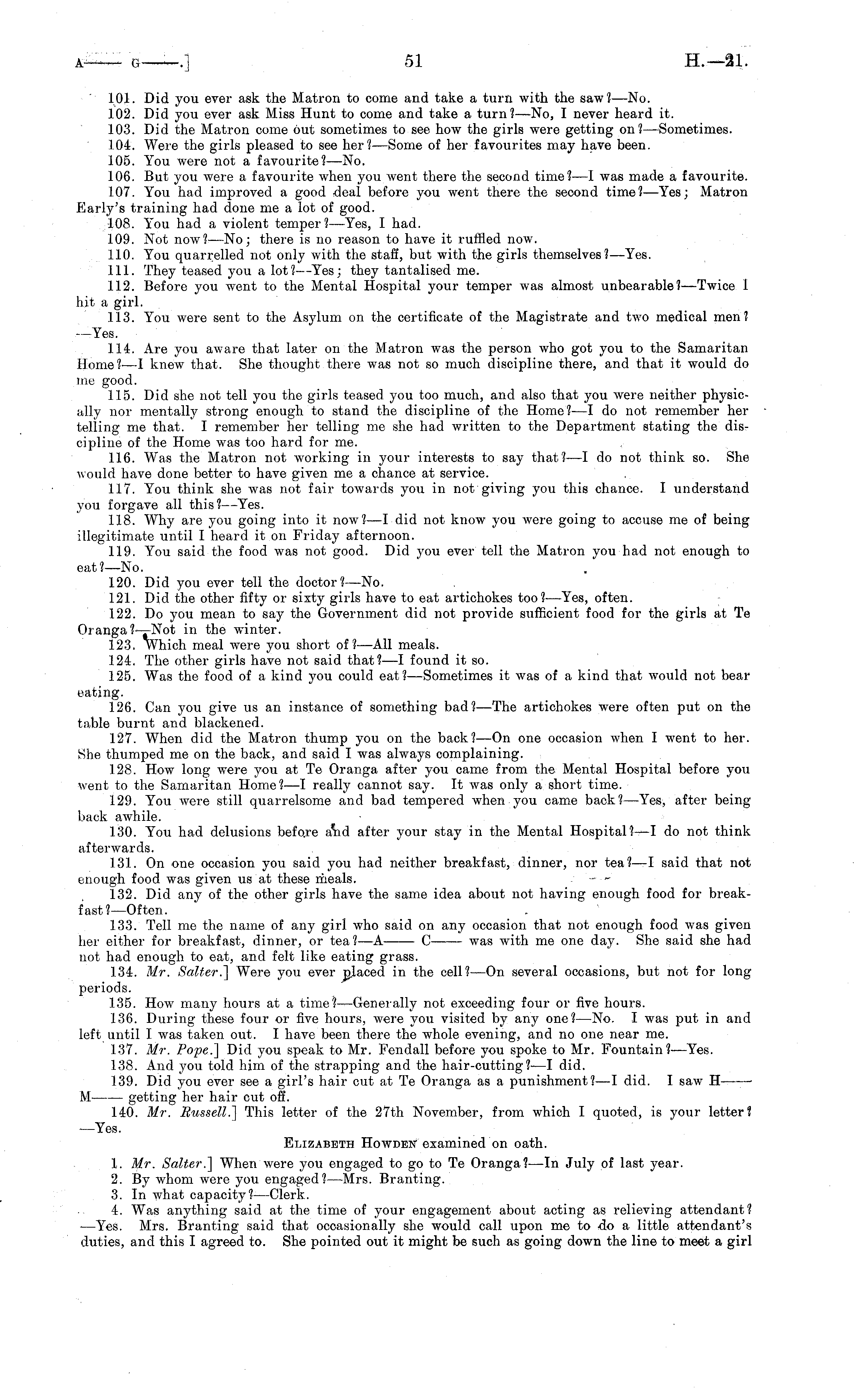 101. Did you ever ask the Matron to come and take a turn with the saw?— No. 102. Did you ever ask Miss Hunt to come and take a turn? —No, I never heard it. 103. Did the Matron come out sometimes to see how the girls were getting on? —Sometimes. 104. Were the girls pleased to see her?— Some of her favourites may have been. 105. You were not a favourite? —No. 106. But you were a favourite when you went there the second time? —I was made a favourite. 107. You had improved a good deal before you went there the second time? —Yes; Matron Early's training had done me a lot of good. 108. You had a violent temper? —Yes, I had. 109. Not now?—No; there is no reason to have it ruffled now. 110. You quarrelled not only with the staff, but with the girls themselves?— Yes. 111. They teased you a lot?— Yes; they tantalised me. 112. Before you went to the Mental Hospital your temper was almost unbearable? —Twice 1 hit a girl. 113. You were sent to the Asylum on the certificate of the Magistrate and two medical men? —Yes. 114. Are you aware that later on the Matron was the person who got you to the Samaritan Home?-—I knew that. She thought there was not so much discipline there, and that it would do me good. 115. Did she not tell you the girls teased, you too much, and also that you were neither physically nor mentally strong enough to stand the discipline of the Home?—l do not remember her telling me that. I remember her telling me she had written to the Department stating the discipline of the Home was too hard for me. 116. Was the Matron not working in your interests to say that? —I do not think so. She ■would have done better to have given me a chance at service. 117. You think she was not fair towards you in not giving you this chance. I understand you forgave all this? —Yes. 118. Why are you going into it now?—l did not know you were going to accuse me of being illegitimate until I heard it on Friday afternoon. 119. You said the food was not good. Did you ever tell the Matron you had not enough to eat?— No. 120. Did you ever tell the doctor? —No. 121. Did the other fifty or sixty girls have to eat artichokes too?-—Yes, often. 122. Do you mean to say the Government did not provide sufficient food for the girls at Te Oranga ?—Not in the winter. 123. Which meal were you short of?— All meals. 124. The other girls have not said that? —I found it so. 125. Was the food of a kind you could eat?— Sometimes it was of a kind that would not bear eating. 126. Can you give us an instance of something bad?— The artichokes were often put on the table burnt and blackened. 127. When did the Matron thump you on the back? —On one occasion when I went to her. She thumped me on the back, and said I was always complaining. 128. How long were you at Te Oranga after you came from the Mental Hospital before you went to the Samaritan Home?—l really cannot say. It was only a short time. 129. You were still quarrelsome and bad tempered when you came back?— Yes, after being back awhile. 130. You had delusions before a\id after your stay in the Mental Hospital?—l do not think afterwards. 131. On one occasion you said you had neither breakfast, dinner, nor tea?—l said that not enough food was given us at these meals. 132. Did any of the other girls have the same idea about not having enough food for breakfast?— Often. 133. Tell me the name of any girl who said on any occasion that not enough food was given her either for breakfast, dinner, or tea ?—A C was with me one day. She said she had not had enough to eat, and felt like eating grass. 134. Mr. Salter.] Were you ever placed in the cell? —On several occasions, but not for long periods. 135. How many hours at a time?— Generally not exceeding four or five hours. 136. During these four or five hours, were you visited by any one?— No. I was put in and left until I was taken out. I have been there the whole evening, and no one near me. 137. Mr. Pope.] Did you speak to Mr. Fendall before you spoke to Mr. Fountain?— Yes. 138. And you told him of the strapping and the hair-cutting?—l did. 139. Did you ever see a girl's hair cut at Te Oranga as a punishment?—l did. I saw H——• M getting her hair cut off. 140. Mr. Russell.] This letter of the 27th November, from which I quoted, is your letter? —Yes. Elizabeth Howden examined on oath. 1. Mr. Salter.] When were you engaged to go to Te Oranga?—ln July of last year. 2. By whom were you engaged? —Mrs. Branting. 3. In what capacity? —Clerk. 4. Was anything said at the time of your engagement about acting as relieving attendant? —Yes. Mrs. Branting said that occasionally she would call upon me to do a little attendant's duties, and this I agreed to. She pointed out it might be such as going down the line to meet a girl