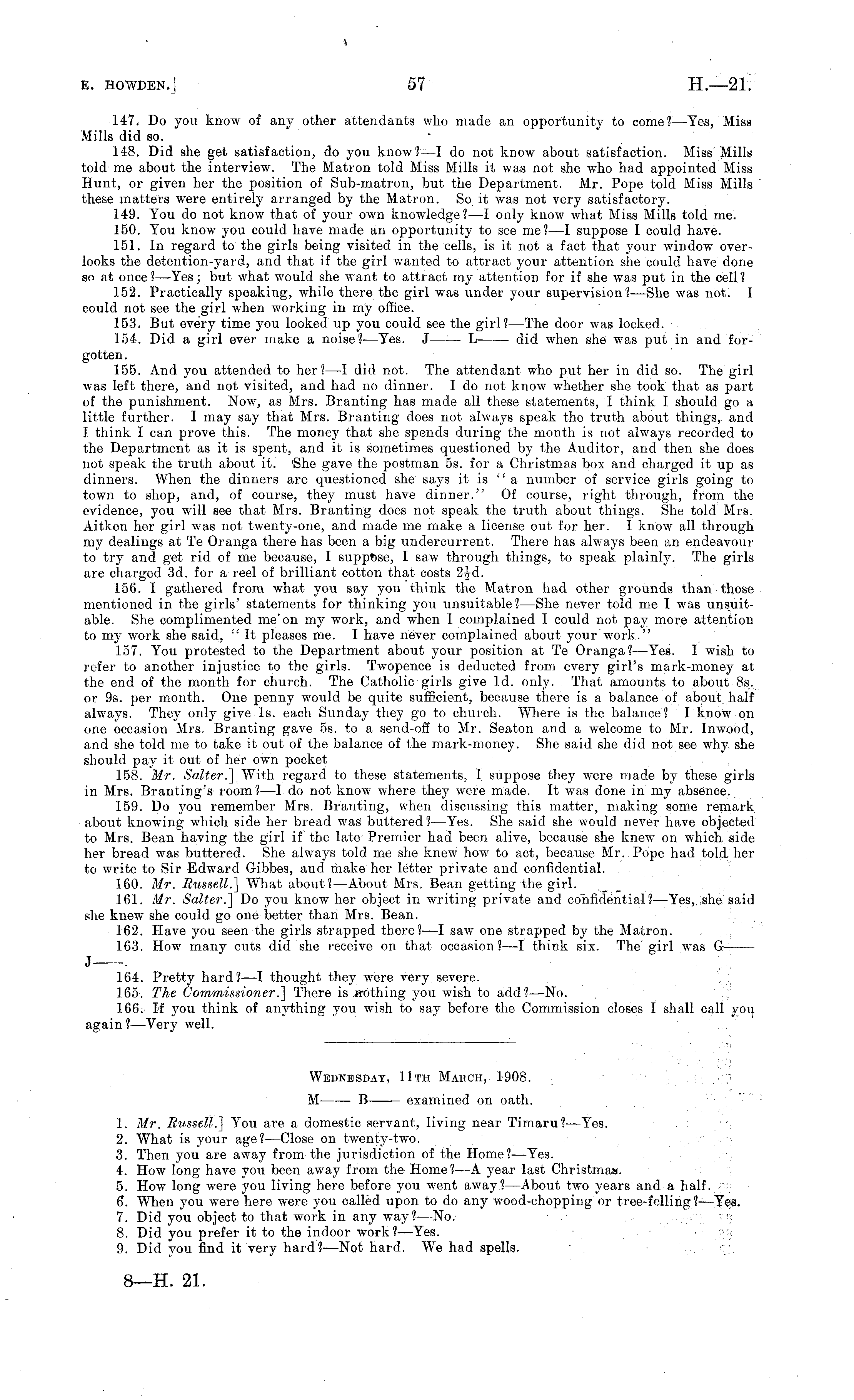 147. Do you know of any other attendants who made an opportunity to come?— Yes, Miss Mills did so. 148. Did she get satisfaction, do you know?—l do not know about satisfaction. Miss Mills told me about the interview. The Matron told Miss Mills it was not she who had appointed Miss Hunt, or given her the position of Sub-matron, but the Department. Mr. Pope told Miss Mills these matters were entirely arranged by the Matron. So. it was not very satisfactory. 149. You do not know that of your own knowledge? —I only know what Miss Mills told me. 150. You know you could have made an opportunity to see me?—l suppose I could have. 151. In regard to the girls being visited in the cells, is it not a fact that your window overlooks the detention-yard, and that if the girl wanted to attract your attention she could have done so at once? —Yes; but what would she want to attract my attention for if she was put in the cell? 152. Practically speaking, while there the girl was under your supervision?— She was not. I could not see the girl when working in my office. 153. But every time you looked up you could see the girl?— The door was locked. 154. Did a girl ever make a noise?— Yes. J —-— L did when she was put in and forgotten. 155. And you attended to her? —I did not. The attendant who put her in did so. The girl was left there, and not visited, and had no dinner. Ido not know whether she took that as part of the punishment. Now, as Mrs. Branting has made all these statements, I think I should go a little further. I may say that Mrs. Branting does not always speak the truth about things, and I think I can prove this. The money that she spends during the month is not always recorded to the Department as it is spent, and it is sometimes questioned by the Auditor, and then she does not speak the truth about it. She gave the postman ss. for a Christmas box and charged it up as dinners. When the dinners are questioned she says it is "a number of service girls going to town to shop, and, of course, they must have dinner." Of course, right through, from the evidence, you will see that Mrs. Branting does not speak the truth about things. She told Mrs. Aitken her girl was not twenty-one, and made me make a license out for her. I know all through my dealings at Te Oranga there has been a big undercurrent. There has always been an endeavour to try and get rid of me because, I suppose, I saw through things, to speak plainly. The girls are charged 3d. for a reel of brilliant cotton that costs 2^d. 156. I gathered from what you say you think the Matron had other grounds than those mentioned in the girls' statements for thinking you unsuitable? —She never told me I was unsuitable. She complimented me*on my work, and when I complained I could not pay more attention to my work she said, "It pleases me. I have never complained about your work." 157. You protested to the Department about your position at Te Oranga?—Yes. I wish to refer to another injustice to the girls. Twopence is deducted from every girl's mark-money at the end of the month for church. The Catholic girls give Id. only. That amounts to about Bs. or 9s. per month. One penny would be quite sufficient, because there is a balance of about half always. They only give Is. each Sunday they go to church. Where is the balance? I know on one occasion Mrs. Branting gave ss. to a send-off to Mr. Seaton and a welcome to Mr. Inwood, and she told me to take it out of the balance of the mark-money. She said she did not see why she should pay it out of her own pocket 158. Mr. Salter.] With regard to these statements, I suppose they were made by these girls in Mrs. Branting's room? —I do not know where they were made. It was done in my absence. 159. Do you remember Mrs. Branting, when discussing this matter, making some remark about knowing which side her bread was buttered? —Yes. She said she would never have objected to Mrs. Bean having the girl if the late Premier had been alive, because she knew on which side her bread was buttered. She always told me she knew how to act, because Mr. Pope had told, her to write to Sir Edward Gibbes, and make her letter private and confidential. 160. Mr. Russell.] What about? —About Mrs. Bean getting the girl. 161. Mr. Salter.] Do you know her object in writing private and confidential?— Yes, she said she knew she could go one better than Mrs. Bean. 162. Have you seen the girls strapped there?—l saw one strapped by the Matron. 163. How many cuts did she receive on that occasion?—l think six. The girl was G J . 164. Pretty hard?—l thought they were very severe. 165. The Commissioner.] There is .nothing you wish to add?— No. 166. If you think of anything you wish to say before the Commission closes I shall call you again ? —Very well. Wednesday, 11th March, 1908. M B examined on oath. 1. Mr. Russell.] You are a domestic servant, living near Timaru? —Yes. 2. What is your age?— Close on twenty-two. 3. Then you are away from the jurisdiction of the Home?— Yes. 4. How long have you been away from the Home?—A year last Christmas. 5. How long were you living here before you went away?— About two years and a half. 6. When you were here were you called upon to do any wood-chopping or tree-felling ?—Yes. 7. Did you object to that work in any way?— No. 8. Did you prefer it to the indoor work?— Yes. 9. Did you find it very hard? —Not hard. We had spells.