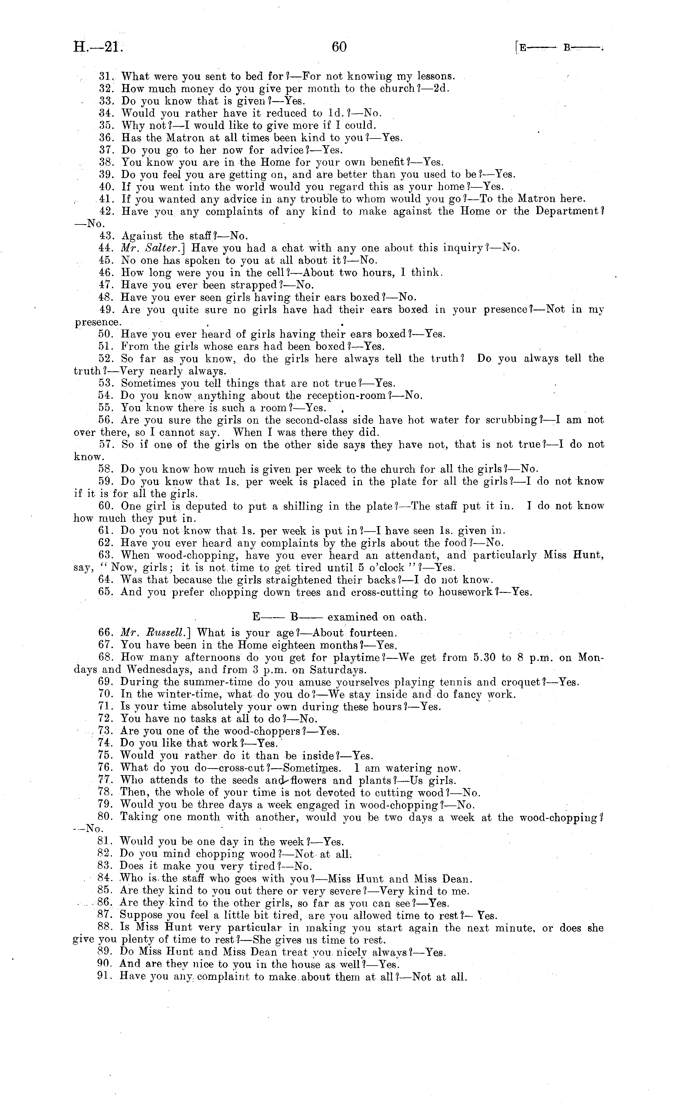 31. What were you sent to bed for?— For not knowing my lessons. 32. How much money do you give per month to the church? —2d. 33. Do you know that is given?— Yes. <34. Would you rather have it reduced to Id.?— No. 35. Why not?—l would like to give more if I could. 36. Has the Matron at all times been kind to you?— Yes. 37. Do you go to her now for advice? —Yes. 38. You know you are in the Home for your own benefit? —Yes. 39. Do you feel you are getting on, and are better than you used to be?— Yes. 40. If you went into the world would you regard this as your home?— Yes. 41. If you wanted any advice in any trouble to whom would you go?—To the Matron here. 42. Have you any complaints of any kind to make against the Home or the Department? —No. 43. Against the staff? —No. 44. Mr. Salter.] Have you had a chat with any one about this inquiry?— No. 45. No one has spoken to you at all about it? —No. 46. How long were you in the cell? —About two hours, 1 think. 47. Have you ever been strapped?— No. 48. Have you ever seen girls having their ears boxed? —No. 49. Are you quite sure no girls have had their ears boxed in your presence?— Not in my presence. 50. Have you ever heard of girls having their ears boxed? —Yes. 51. From the girls whose ears had been boxed?— Yes. 52. So far as you know, do the girls here always tell the truth? Do you always tell the truth ?—Very nearly always. 53. Sometimes you tell things that are not true? —Yes. 54. Do you know anything about the reception-room?— No. 55. You know there is such a room?— Yes. . 56. Are you sure the girls on the second-class side have hot water for scrubbing?—l am not over there, so I cannot say. When I was there they did. 57. So if one of the girls on the other side says they have not, that is not true? —I do not know. 58. Do you know how much is given per week to the church for all the girls? —No. 59. Do you know that Is. per week is placed in the plate for all the girls? —I do not know if it is for all the girls. 60. One girl is deputed to put a shilling in the plate?— The staff put it in. Ido not know how much they put in. 61. Do you not know that Is. per week is put in?—l have seen Is. given in. 62. Have you ever heard any complaints by the girls about the food?— No. 63. When wood-chopping, have you ever heard an attendant, and particularly Miss Hunt, say, "Now, girls; it is not time to get tired until 5 o'clock"? —Yes. 64. Was that because the girls straightened their backs ?—I do not know. 65. And you prefer chopping down trees and cross-cutting to housework? —Yes. E B examined on oath. 66. Mr. Russell.] What is your age?— About fourteen. 67. You have been in the Home eighteen months?— Yes. 68. How many afternoons do you get for playtime?—We get from 5.30 to 8 p.m. on Mondays and Wednesdays, and from 3 p.m. on Saturdays. 69. During the summer-time do you amuse yourselves playing tennis and croquet? —Yes. 70. In the winter-time, what do you do? —We stay inside and do fancy work. 71. Is your time absolutely your own during these hours?— Yes. 72. You have no tasks at all to do?— No. 73. Are you one of the wood-choppers?— Yes. 74. Do you like that work? —Yes.' 75. Would you rather do it than be inside?— Yes. 76. What do you do—cross-cut? — Sometimes. I am watering now. 77. Who attends to the seeds and'Howers and plants?—Us girls. 78. Then, the whole of your time is not devoted to cutting wood?— No. 79. Would you be three days a week engaged in wood-chopping?— No. 80. Taking one month with another, would you be two days a week at the wood-chopping? —No. 81. Would you be one day in the week?— Yes. 82. Do you mind chopping wood? —Not at all. 83. Does it make you very tired? —No. 84. Who is the staff who goes with you?— Miss Hunt and Miss Dean. 85. Are they kind to you out there or very severe?— Very kind to me. . , 86. Are they kind to the other girls, so far as you can see?— Yes. 87. Suppose you feel a little bit tired, are you allowed time to rest?— Yes. 88. Is Miss Hunt very particular in making you start again the next minute, or does she give you plenty of time to rest ? —She gives us time to rest. 89. Do Miss Hunt and Miss Dean treat you nicely always?— Yes. 90. And are they nice to you in the house as well?— Yes. 91. Have you any complaint to make.about them at all?— Not at all.