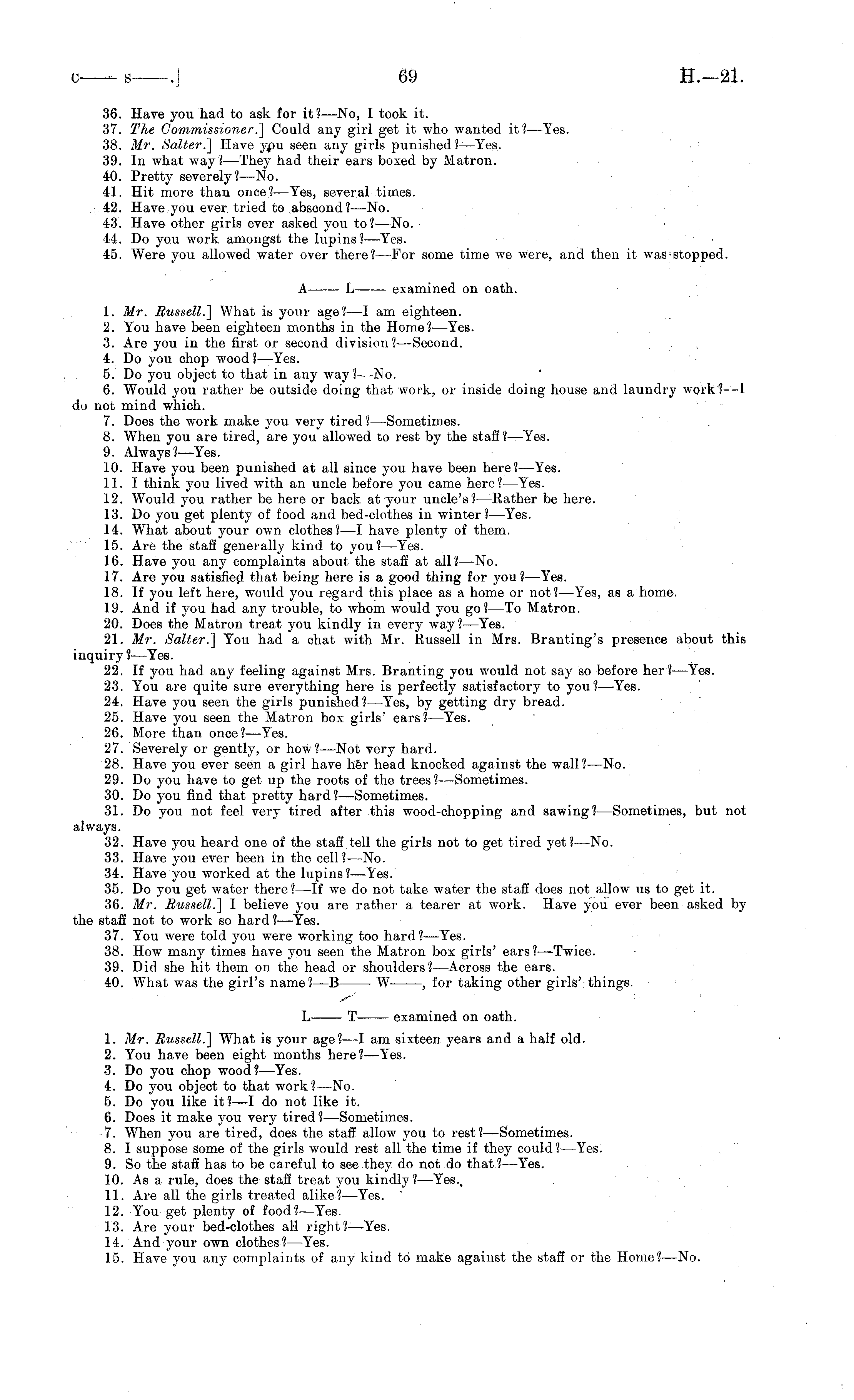 36. Have you had to ask for it?—No, I took it. 37. The Commissioner.] Could any girl get it who wanted it? —Yes. 38. Mr. Salter.] Have ypu seen any girls punished?— Yes. 39. In what way?— They had their ears boxed by Matron. 40. Pretty severely? —No. 41. Hit more than once?— Yes, several times, 42. Have you ever tried to abscond? —No. 43. Have other girls ever asked you to? —No. 44. Do you work amongst the lupins?—-Yes. 45. Were you allowed water over there? —For some time we were, and then it was stopped. A L examined on oath. 1. Mr. Russell.] What is your age? —I am eighteen. 2. You have been eighteen months in the Home?— Yes. 3. Are you in the first or second division I —Second. 4. Do you chop wood ? —Yes. 5. Do you object to that in any way?- -No. 6. Would you rather be outside doing that work, or inside doing house and laundry work? —I do not mind which. 7. Does the work make you very tired?— Sometimes. 8. When you are tired, are you allowed to rest by the staff ?—Yes. 9. Always?— Yes. 10. Have you been punished at all since you have been here?— Yes. 11. I think you lived with an uncle before you came here? —Yes. 12. Would you rather be here or back at your uncle's? —Rather be here. 13. Do you get plenty of food and bed-clothes in winter? —Yes. 14. What about your own clothes?—l have plenty of them. 15. Are the staff generally kind to you? —Yes. 16. Have you any complaints about the staff at all? —No. 17. Are you satisfied that being here is a good thing for you?— Yes. 18. If you left here, would you regard this place as a home or not? —Yes, as a home. 19. And if you had any trouble, to whom would you go? —To Matron. 20. Does the Matron treat you kindly in every way?— Yes. 21. Mr. Salter.] You had a chat with Mr. Russell in Mrs. Branting's presence about this inquiry?— Yes. 22. If you had any feeling against Mrs. Branting you would not say so before her? —Yes. 23. You are quite sure everything here is perfectly satisfactory to you? —Yes. 24. Have you seen the girls punished? —Yes, by getting dry bread. 25. Have you seen the Matron box girls' ears? —Yes. 26. More than once?— Yes. 27. Severely or gently, or how?— Not very hard. 28. Have you ever seen a girl have her head knocked against the wall?— No. 29. Do you have to get up the roots of the trees?— Sometimes. 30. Do you find that pretty hard ?—Sometimes. 31. Do you not feel very tired after this wood-chopping and sawing? —Sometimes, but not always. 32. Have you heard one of the staff.tell the girls not to get tired yet? —No. 33. Have you ever been in the cell? —No. 34. Have you worked at the lupins ?—Yes. 35. Do you get water there ?—lf we do not take water the staff does not allow us to get it. 36. Mr. Russell.] I believe you are rather a tearer at work. Have you ever been asked by the staff not to work so hard? —Yes. 37. You were told you were working too hard? —Yes. 38. How many times have you seen the Matron box girls' ears? —Twice. 39. Did she hit them on the head or shoulders?— Across the ears. 40. What was the girl's name ?—B W , for taking other girls' things. L T examined on oath. 1. Mr. Russell.] What is your age?—l am sixteen years and a half old. 2. You have been eight months here?— Yes. 3. Do you chop wood?— Yes. 4. Do you object to that work?— No. 5. Do you like it?—l do not like it. 6. Does it make you very tired ?—Sometimes. 7. When you are tired, does the staff allow you to rest?— Sometimes. 8. I suppose some of the girls would rest all the time if they could? —Yes. 9. So the staff has to be careful to see they do not do that? —Yes. 10. As a rule, does the staff treat you kindly?— Yes., 11. Are all the girls treated alike?— Yes. 12. You get plenty of food? —Yes. 13. Are your bed-clothes all right?— Yes. 14. And your own clothes? —Yes. 15. Have you any complaints of any kind to make against the staff or the Home?— No.