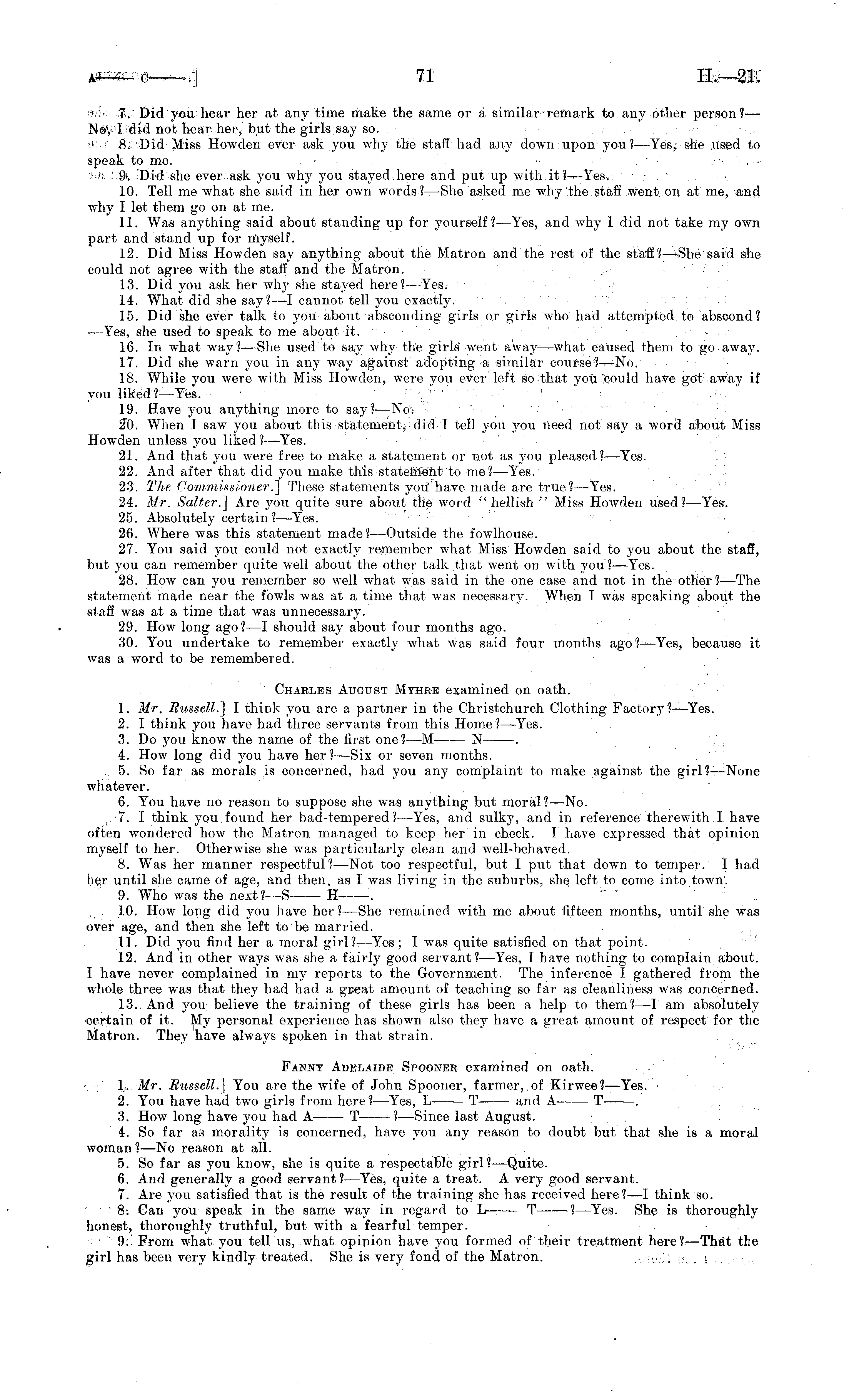 Bit 7, Did you hear her at any time make the same or a similar remark to any other person?— No, I did not hear her, but the girls say so. 8, Did Miss Howden ever ask you why the staff had any down upon you?— Yes, she used to speak to me. -'-■■' 9. Did she ever ask you why you stayed here and put up with it?---Yes, 10. Tell me what she said in her own words? —She asked me why the, staff went on at me,, and why I let them go on at me. 11. Was anything said about standing up for yourself?— Yes, and why I did not take my own part and stand up for myself. 12. Did Miss Howden say anything about the Matron and the rest of the staff?—-She said she could not agree with the staff and the Matron. 13. Did you ask her why she stayed here?— Yes. 14. What did she say?—l cannot tell you exactly. 15. Did she ever talk to you about absconding girls or girls who had attempted to abscond? - —Yes, she used to speak to me about it. 16. In what way?— She used to say why the girls went away —what caused them to go-away. 17. Did she warn you in any way against adopting a similar coufse?-r-No. 18. While you were with Miss Howden, were you ever left so that you could have got away if you liked?— Yes. 19. Have you anything more to say?— No. 2"0. When I saw you about this statement, did I tell you you need not say a word about Miss Howden unless you liked ?—Yes. 21. And that you were free to make a statement or not as you pleased?— Yes. 22. And after that did you make this statement to me?— Yes. 23. The Commissioner .] These statements yotf'have made are true? —Yes. 24. Mr. Salter.] Are you quite sure about tile word " hellish " Miss Howden used? —Yes. 25. Absolutely certain ? —Yes. 26. Where was this statement made? —Outside the fowlhouse. 27. You said you could not exactly remember what Miss Howden said to you about the staff, but you can remember quite well about the other talk that went on with you?— Yes. 28. How can you remember so well what was said in the one case and not in the other ?—The statement made near the fowls was at a time that was necessary. When I was speaking about the staff was at a time that was unnecessary. 29. How long ago?—l should say about four months ago. 30. You undertake to remember exactly what was said four months ago?— Yes, because it was a word to be remembered. Charles August Myhre examined on oath. 1. Mr. Russell.] I think you are a partner in the Christchurch Clothing Factory?— Yes. 2. I think you have had three servants from this Home?— Yes. 3. Do you know the name of the first one?—M N . 4. How long did you have her ?—Six or seven months. 5. So far as morals is concerned, had you any complaint to make against the girl? —None whatever. 6. You have no reason to suppose she was anything but moral?— No. 7. I think you found her bad-tempered?— Yes, and sulky, and in reference therewith I have often wondered how the Matron managed to keep her in check. I have expressed that opinion myself to her. Otherwise she was particularly clean and well-behaved. 8. Was her manner respectful?— Not too respectful, but I put that down to temper. I had her until she came of age, and then, as 1 was living in the suburbs, she left to come into town. 9. Who was the next?—S H . 10. How long did you have her?— She remained with me about fifteen months, until she was over age, and then she left to be married. 11. Did you find her a moral girl?— Yes; I was quite satisfied on that point, 12. And in other ways was she a fairly good servant?— Yes, I have nothing to complain about. I have never complained in my reports to the Government. The inference I gathered from the whole three was that they had had a great amount of teaching so far as cleanliness was concerned. 13. And you believe the training of these girls has been a help to them?—l am absolutely certain of it. My personal experience has shown also they have a great amount of respect for the Matron. They have always spoken in that strain. Fanny Adelaide Spooner examined on oath. L. Mr. Russell.] You are the wife of John Spooner, farmer, of Kirwee?—Yes. 2. You have had two girls from here?— Yes, L T and A T . 3. How long have you had A T ?—Since last August. 4. So far as morality is concerned, have you any reason to doubt but that she is a moral woman?—No reason at all. 5. So far as you know, she is quite a respectable girl?— Quite. 6. And generally a good servant?— Yes, quite a treat. A very good servant. 7. Are you satisfied that is the result of the training she has received here?—l think so. 8. Can you speak in the same way in regard to L — T ?—Yes. She is thoroughly honest, thoroughly truthful, but with a fearful temper. 9: From what you tell us, what opinion have you formed of their treatment here?— That the girl has been very kindly treated. She is very fond of the Matron.