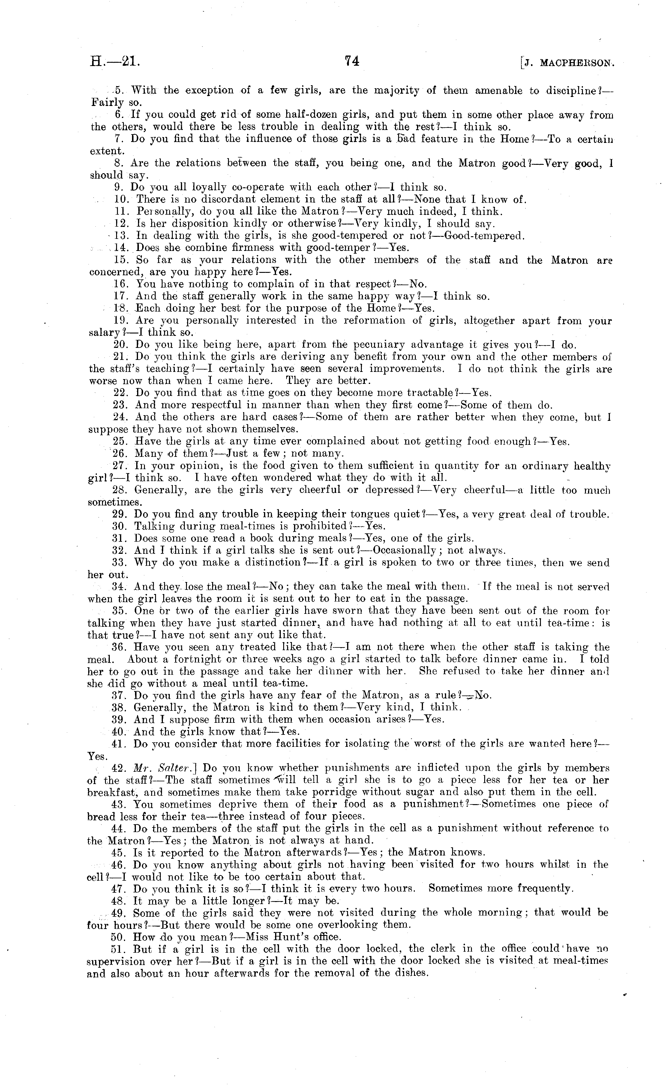 5. With the exception of a few girls, are the majority of them amenable to discipline?— Fairly so. 6. If you could get rid of some half-dozen girls, and put them in some other place away from the others, would there be less trouble in dealing with the rest?—-I think so. 7. Do you find that the influence of those girls is a Bad feature in the Home? —To a certain extent. 8. Are the relations between the staff, you being one, and the Matron good?— Very good, I should say. 9. Do you all loyally co-operate with each other?—l think so. 10. There is no discordant element in the staff at all?— None that I know of. 11. Personally, do you all like the Matron?— Very much indeed, I think. . 12. Is her disposition kindly or otherwise? —Very kindly, I should say. - 13. In dealing with the girls, is she good-tempered or not? —Good-tempered. ,14. Does she combine firmness with good-temper? —Yes. 15. So far as your relations with the other members of the staff and the Matron are concerned, are you happy here ?—Yes. 16. You have nothing to complain of in that respect?— No. 17. And the staff generally work in the same happy way? —1 think so. 18. Each doing her best for the purpose of the Home?— Yes. 19. Are you personally interested in the reformation of girls, altogether apart from your salary ?—I think so. 20. Do you like being here, apart from the pecuniary advantage it gives you?—l do. 21. Do you think the girls are deriving any benefit from your own and the other members of the staff's teaching? —I certainly have seen several improvements. I do not think the girls are worse now than when I came here. They are better. 22. Do you find that as time goes on they become more tractable? —Yes. 23. And more respectful in manner than when they first come?— Some of them do. 24. And the others are hard cases?— Some of them are rather better when they come, but I suppose they have not shown themselves. 25. Have the girls at any time ever complained about not getting food enough?— Yes. 26. Many of them? —Just a few; not many. 27. In your opinion, is the food given to them sufficient in quantity for an ordinary healthy girl? —I think so. I have often wondered what they do with it all. 28. Generally, are the girls very cheerful or depressed?— Very cheerful—a little too much sometimes. 29. Do you find any trouble in keeping their tongues quiet?— Yes, a very great deal of trouble. 30. Talking during meal-times is prohibited?— Yes. 31. Does some one read a book during meals?—-Yes, one of the girls. 32. And I think if a girl talks she is sent out?— Occasionally; not always. 33. Why do you make a distinction? —If a girl is spoken to two or three times, then we send her out, 34. And they lose the meal?—No; they can take the meal with them. If the meal is not served when the girl leaves the room it is sent out to her to eat in the passage. 35. One or two of the earlier girls have sworn that they have been sent out of the room for talking when they have just started dinner, and have had nothing at all to eat until tea-time: is that true? —I have not sent any out like that. 36. Have you seen any treated like that? —I am not there when the other staff is taking the meal. About a fortnight or three weeks ago a girl started to talk before dinner came in. I told her to go out in the passage and take her dinner with her. She refused to take her dinner and she did go without a meal until tea-time. 37. Do you find the girls have any fear of the Matron, as a rule?— No. 38. Generally, the Matron is kind to them? —Very kind, I think. 39. And I suppose firm with them when occasion arises?— Yes. 40. And the girls know that? —Yes. 41. Do you consider that more facilities for isolating the worst of the girls are wanted here?— Yes. 42. Mr. Salter.] Do you know whether punishments are inflicted upon the girls by members of the staff? —The staff sometimes ■"will tell a girl she is to go a piece less for her tea or her breakfast, and sometimes make them take porridge without sugar and also put them in the cell. 43. You sometimes deprive them of their food as a punishment?— Sometimes one piece of bread less for their tea —three instead of four pieces. 44. Do the members of the staff put the girls in the cell as a punishment without reference to the Matron?— Yes; the Matron is not always at hand. 45. Is it reported to the Matron afterwards? —Yes; the Matron knows. 46. Do you know anything about girls not having been visited for two hours whilst in the cell? —I would not like to be too certain about that. 47. Do you think it is so?- —I think it is every two hours. Sometimes more frequently. 48. It may be a little longer? —It may be. 49. Some of the girls said they were not visited during the whole morning; that would be four hours? —But there would be some one overlooking them. 50. How do you mean? —Miss Hunt's office. 51. But if a girl is in the cell with the door locked, the clerk in the office could'have no supervision over her? —But if a girl is in the cell with the door locked she is visited at meal-times and also about an hour afterwards for the removal of the dishes.