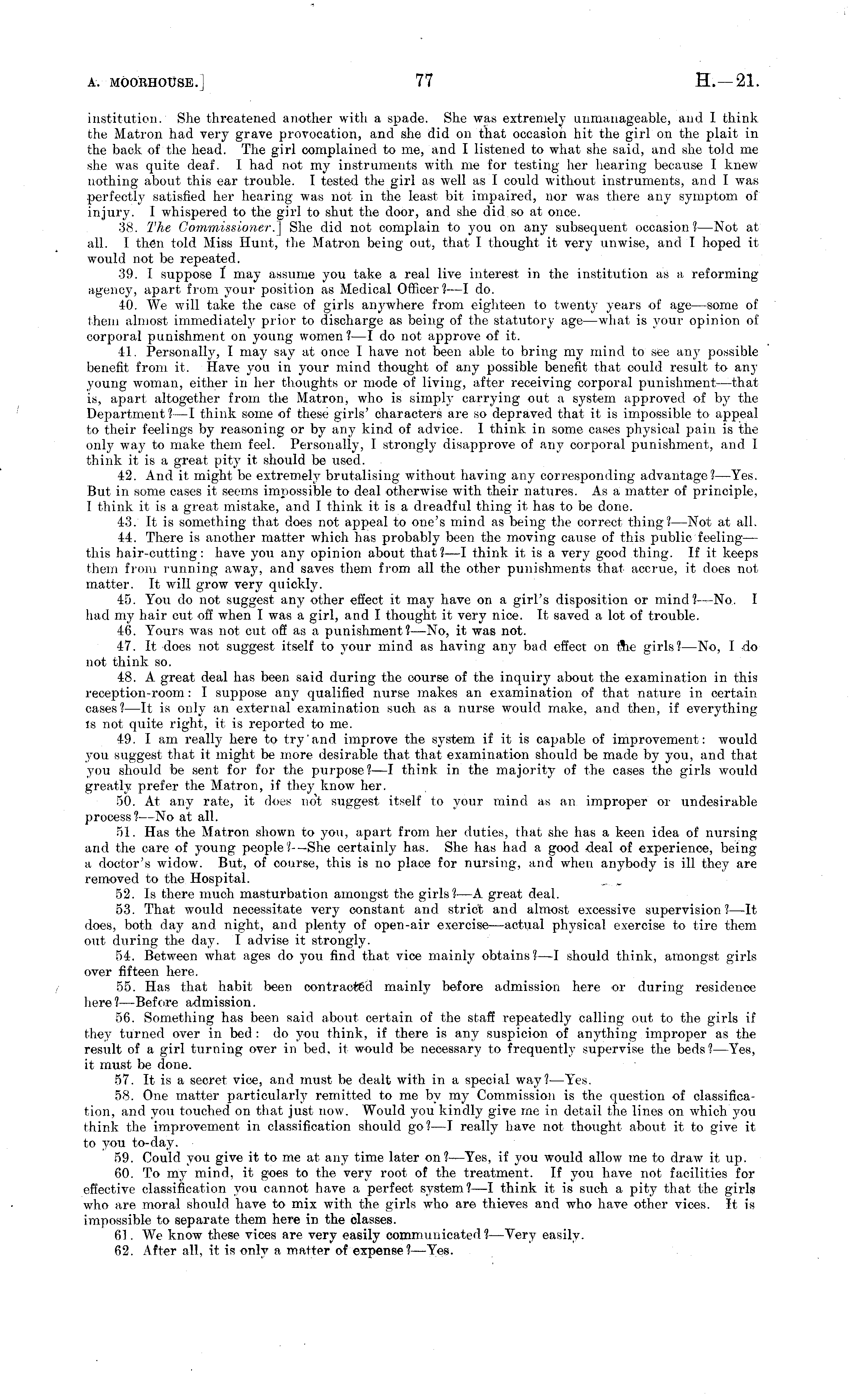 institution. She threatened another with a spade. She was extremely unmanageable, and I think the Matron had very grave provocation, and she did on that occasion hit the girl on the plait in the back of the head. The girl complained to me, and I listened to what she said, and she told me she was quite deaf. I had not my instruments with me for testing her hearing because I knew nothing about this ear trouble. I tested the girl as well as I could without instruments, and I was -perfectly satisfied her hearing was not in the least bit impaired, nor was there any symjjtom of injury. I whispered to the girl to shut the door, and she did so at once. 38. The Commissioner.] She did not complain to you on any subsequent occasion? —Not at all. I then told Miss Hunt, the Matron being out, that I thought it very unwise, and T hoped it would not be repeated. 39. I suppose I may assume you take a real live interest in the institution as a reforming agency, apart from your position as Medical Officer?—l do. 40. We will take the case of girls anywhere from eighteen to twenty years of age —some of them almost immediately prior to discharge as being of the statutory age —what is your opinion of corporal punishment on young women? —I do not approve of it. 41. Personally, I may say at once I have not been able to bring my mind to see an}' possible benefit from it. Have you in your mind thought of any possible benefit that could result to any young woman, either in her thoughts or mode of living, after receiving corporal punishment,—that is, apart altogether from the Matron, who is simply carrying out a system approved of by the Department ?—I think some of these girls' characters are so depraved that it is impossible to appeal to their feelings by reasoning or by any kind of advice. I think, in some cases physical pain is the only way to make them feel. Personally, I strongly disapprove of any corporal punishment, and I think it is a great pity it should be used, 42. And it might be extremely brutalising without having any corresponding advantage?— Yes. But in some cases it seems impossible to deal otherwise with their natures. As a matter of principle, 1 think it is a great mistake, and I think it is a dreadful thing it has to be done. 43. It is something that does not appeal to one's mind as being the correct thing?— Not at all. 44. There is another matter which has probably been the moving cause of this public feeling— this hair-cutting: have you any opinion about that?—l think it is a very good thing. If it keeps them from running away, and saves them from all the other punishments that accrue, it does not matter. It will grow very quickly. 45. You do not suggest any other effect it may have on a girl's disposition or mind?— No. 1 had my hair cut off when I was a girl, and I thought it very nice. It saved a lot of trouble. 46. Yours was not cut off as a punishment? —No, it was not. 47. It does not suggest itself to your mind as having any bad effect on tSie girls? —No, I do not think so. 48. A great deal has been said during the course of the inquiry about the examination in this reception-room: I suppose any qualified nurse makes an examination of that nature in certain cases?—lt is only an external examination such as a nurse would make, and then, if everything is not quite right, it is reported to me. 49. I am really here to try'and improve the system if it is capable of improvement: would you suggest that it might be more desirable that that examination should be made by you, and that you should be sent for for the purpose I —l think in the majority of the cases the girls would greatly prefer the Matron, if they know her. 50. At any rate, it does not suggest itself to your mind as an improper or undesirable process?—No at all. 51. Has the Matron shown to you, apart from her duties, that she has a keen idea of nursing and the care of young people?-—She certainly has. She has had a good deal of experience, being a doctor's widow. But, of course, this is no place for nursing, and when anybody is ill they are removed to the Hospital. 52. Is there much masturbation amongst the girls?—A great deal. 53. That would necessitate very constant and strict and almost excessive supervision?—lt does, both day and night, and plenty of open-air exercise—actual physical exercise to tire them out during the day. I advise it. strongly. 54. Between what ages do you find that vice mainly obtains ?—I should think, amongst girls over fifteen here. 55. Has that habit been contracted mainly before admission here or during residence here? —Before admission. 56. Something has been said about certain of the staff repeatedly calling out to the girls if they turned over in bed : do you think, if there is any suspicion of anything improper as the result of a girl turning over in bed, it would be necessary to frequently supervise the beds ?—Yes, it must be done. 57. It is a secret vice, and must be dealt with in a special way?— Yes. 58. One matter particularly remitted to me by my Commission is the question of classification, and you touched on that just now. Would you kindly give me in detail the lines on which you think the improvement in classification should go?—I really have not thought about it to give it to you to-day. 59. Could you give it to me at- any time later on?— Yes, if you would allow me to draw it up. 60. To my mind, it goes to the very root of the treatment. If you have not facilities for effective classification you cannot have a perfect system?—l think it is such a pity that the girls who are moral should have to mix with, the girls who are thieves and who have other vices. It is impossible to separate them here in the classes. 61. We know these vices are very easily communicated? —Very easily. 62. After all, it is only a matter of expense?— Yes.