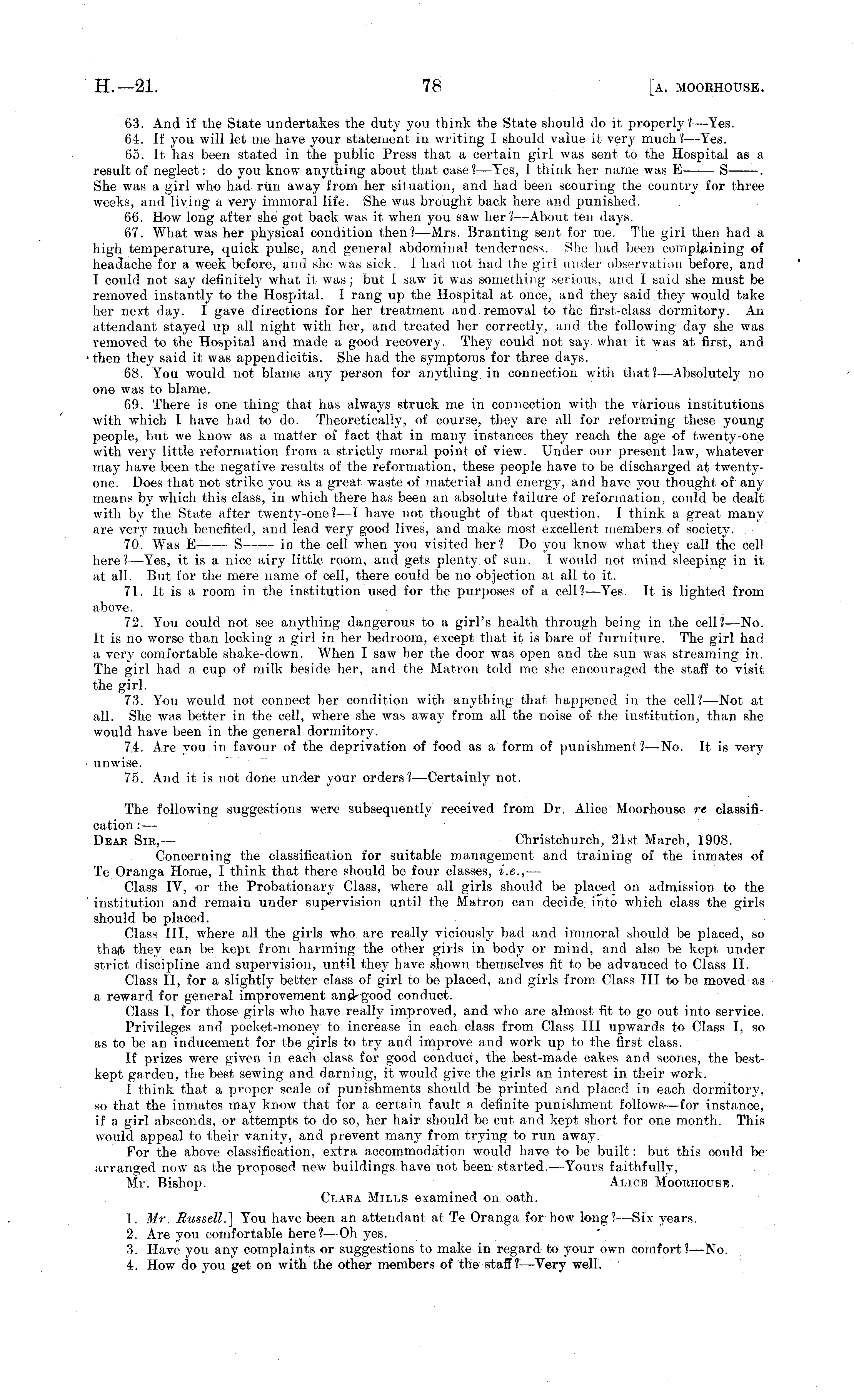 63. And if the State undertakes the duty you think the State should do it. properly?— Yes. 64. If you will let me have your statement in writing 1 should value it very much? —Yes. 65. It has been stated in the public Press that a certain girl was sent to the Hospital as a result of neglect: do you know anything about that case? —Yes, I think her name was E S . She was a girl who had run away from her situation, and had been scouring the country for three weeks, and living a very immoral life. She was brought back, here and punished. 66. How long after she got back was it when you saw her? —About ten days. 67. What was her physical condition then? —Mrs. Branting sent for me. The girl then had a high temperature, quick pulse, and general abdominal tenderness. She had been complaining of headache for a week before, and she was sick. J had not had the girl under observation before, and I could not say definitely what it was; but I saw it was something serious, and I said she must be removed instantly to the Hospital. I rang up the Hospital at once, and they said they would take her next day. I gave directions for her treatment and. removal to the first-class dormitory. An attendant stayed up all night with her, and treated her correctly, and the following day she was removed to the Hospital and made a good recovery. They could not say what it was at first, and then they said it was appendicitis. She had the symptoms for three days. 68. You would not blame any person for anything in connection with that?— Absolutely no one was to blame. 69. There is one thing that has always struck me in connection with the various institutions with which I have had to do. Theoretically, of course, they are all for reforming these young people, but we know as a matter of fact that in many instances they reach the age of twenty-one with very little reformation from a strictly moral point of view. Under our present law, whatever may have been the negative results of the reformation, these people have to be discharged at twentyone. Does that not strike you as a great waste of material and energy, and have you thought of any means by which this class, in which there has been an absolute failure of reformation, could be dealt with by the State after twenty-one? —I have not thought of that question. I think a great many are very much benefited, and lead very good lives, and make most excellent members of society. 70. Was E S in the cell when you visited her? Do you know what they call the cell here? —Yes, it is a nice airy little room, and gets plenty of sun. I would not mind sleeping in it at all. But for the mere name of cell, there could be no objection at all to it. 71. It is a room in the institution used for the purposes of a cell? —Yes. It is lighted from above. 72. You could not see anything dangerous to a girl's health through being in the cell?— No. It is no worse than locking a girl in her bedroom, except that it is bare of furniture. The girl had a very comfortable shake-down. When I saw her the door was open and the sun was streaming in. The girl had a cup of milk beside her, and the Matron told me she encouraged the staff to visit the girl. 73. You would not connect her condition with anything that, happened in the cell?— Not at all. She was better in the cell, where she was away from all the noise of- the institution, than she would have been in the general dormitory. 7.4. Are you in favour of the deprivation of food as a form of punishment? —No. It is very unwise. 75. And it is not done under your orders? —Certainly not. The following suggestions were subsequently received from Dr. Alice Moorhouse re classification : — Dear Sir,— Christchurch, 21st March, 1908. Concerning the classification for suitable management and training of the inmates of Te Oranga Home, I think that there should be four classes, i.e., — Class IV, or the Probationary Class, where all girls should be placed on admission to the institution and remain under supervision until the Matron can decide into which class the girls should be placed. Class 111, where all the girls who are really viciously bad and immoral should be placed, so tha/b they can be kept from harming the other girls in body or mind, and also be kept under strict discipline and supervision, until they have shown themselves fit, to be advanced to Class 11. Class 11, for a slightly better class of girl to be placed, and girls from Class 111 to be moved as a reward for general improvement andgood conduct. Class I, for those girls who have really improved, and who are almost fit to go out into service. Privileges and pocket-money to increase in each class from Class 111 upwards to Class I, so as to be an inducement for the girls to try and improve and work up to the first class. If prizes were given in each class for good conduct, the best-made cakes and scones, the bestkept garden, the best sewing and darning, it would give the girls an interest in their work. I think that a proper scale of punishments should be printed and placed in each dormitory, so that the inmates may know that for a certain fault a definite punishment follows—for instance, if a girl absconds, or attempts to do so, her hair should be cut and kept short for one month. This would appeal to their vanity, and prevent many from trying to run away. For the above classification, extra accommodation would have to be built: but this could be arranged now as the proposed new buildings have not been started.—Yours faithfully, Mr. Bishop. Alice Moorhouse. Clara Mills examined on oath. 1. Mr. Russell.] You have been an attendant at Te Oranga for how long?— Six years. 2. Are you comfortable here? —Oh yes. 3. Have you any complaints or suggestions to make in regard to your own comfort?— No. 4. How do you get on with the other members of the staff ?—Very well.