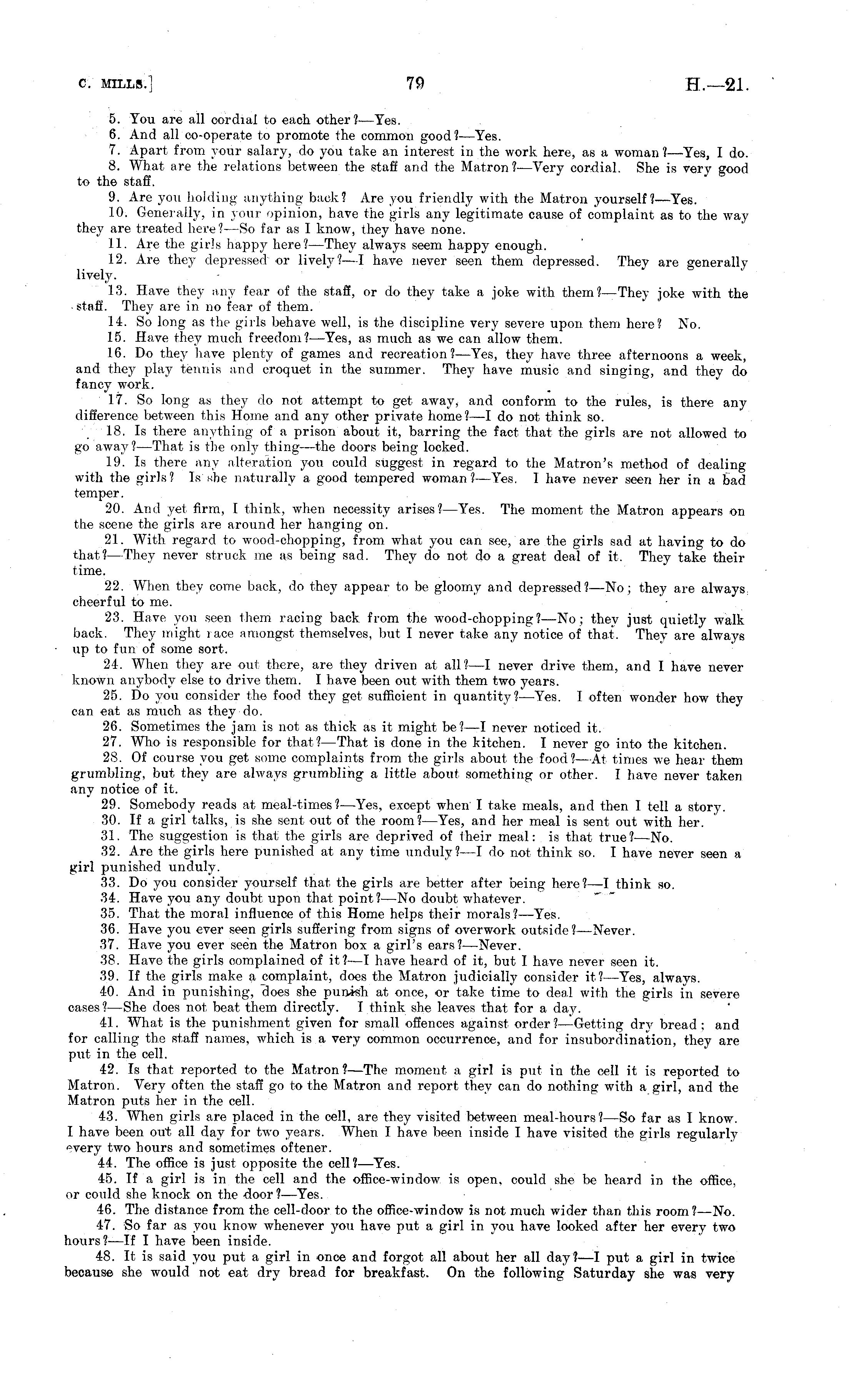 5. You are all cordial to each other? —Yes. 6. And all co-operate to promote the common good ?•—Yes. 7. Apart from your salary, do you take an interest in the work here, as a woman?— Yes, I do. 8. What are the relations between the staff and the Matron? —Very cordial. She is very good to the staff. 9. Are you holding anything back? Are you friendly with the Matron yourself?— Yes. 10. Generally, in your opinion, have the girls any legitimate cause of complaint as to the way they are treated here? —So far as I know, they have none. 11. Are the girls happy here?— They always seem happy enough. 12. Are they depressed or lively?-—I have never seen them depressed. They are generally lively. 13. Have they any fear of the staff, or do they take a joke with them?— They joke with the staff. They are in no fear of them. 14. So long as the girls behave well, is the discipline very severe upon them here? No. 15. Have they much freedom?— Yes, as much as we can allow them. 16. Do they have plenty of games and recreation? —Yes, they have three afternoons a week, and they play tennis and croquet in the summer. They have music and singing, and they do fancy work. 17. So long as they do not attempt to get away, and conform to the rules, is there any difference between this Home and any other private home ?—I do not think so. 18. Is there anything of a prison about it, barring the fact that the girls are not allowed to go away?— That is the only thing—the doors being locked. 19. Is there any alteration you could suggest in regard to the Matron's method of dealing with the girls? Ts she naturally a good tempered woman?— Yes. I have never seen her in a bad temper. 20. And yet firm, I think, when necessity arises?— Yes. The moment the Matron appears on the scene the girls are around her hanging on. 21. With regard to wood-chopping, from, what you can see, are the girls sad at having to do that? —They never struck me as being sad. They do not do a great deal of it. They take their time. 22. When they come back, do they appear to be gloomy and depressed?—No ; they are always, cheerful to me. 23. Have you seen them racing back from the wood-chopping?—No; they just quietly walk back. They might race amongst themselves, but I never take any notice of that, They are always up to fun of some sort. 24. When they are out there, are they driven at all?—I never drive them, and I have never known anybody else to drive them. I have been out with them two years. 25. Do you consider the food they get sufficient in quantity?— Yes. I often wonder how they can eat as much as they do. 26. Sometimes the jam is not as thick as it might be?—l never noticed it. 27. Who is responsible for that? —That is done in the kitchen. I never go into the kitchen. 28. Of course you get some complaints from the girls about the food ?—At times we hear them grumbling, but they are always grumbling a little about something or other. I have never taken any notice of it, 29. Somebody reads at meal-times?— Yes, except when I take meals, and then I tell a story. 30. If a girl talks, is she sent out of the room?— Yes, and her meal is sent out with her. 31. The suggestion is that the girls are deprived of their meal: is that true?— No. 32. Are the girls here punished at any time unduly?—l do not think so. I have never seen a girl punished unduly. 33. Do you consider yourself that the girls are better after being here?—l think so. 34. Have you any doubt upon that, point? —No doubt whatever. 35. That the moral influence of this Home helps their morals?— Yes. 36. Have you ever seen girls suffering from signs of overwork outside?— Never. 37. Have you ever seen the Matron box a girl's ears?— Never. 38. Have the girls complained of it?—l have heard of it, but I have never seen it. 39. If the girls make a complaint, does the Matron judicially consider it?— Yes, always. 40. And in punishing, does she punish at once, or take time to deal with the girls in severe oases?— She does not beat them directly. I think she leaves that for a day. 41. What is the punishment given for small offences against order?— Getting dry bread: and for calling the staff names, which is a very common occurrence, and for insubordination, they are put in the cell. 42. Is that reported to the Matron?— The moment a girl is put in the cell it is reported to Matron. Very often the staff go to the Matron and report they can do nothing with a girl, and the Matron puts her in the cell. 43. When girls are placed in the cell, are they visited between meal-hours?—So far as I know. I have been out all day for two years. When I have been inside I have visited the girls regularly »very two hours and sometimes oftener. 44. The office is just opposite the cell?— Yes. 45. If a girl is in the cell and the office-window is open, could she be heard in the office, or could she knock on the door?— Yes. 46. The distance from the cell-door to the office-window is not much wider than this room?— No. 47. So far as you know whenever you have put a girl in you have looked after her every two hours?—lf I have been inside. 48. It is said you put a girl in once and forgot all about her all day?—l put a girl in twice because she would not eat dry bread for breakfast. On the following Saturday she was very