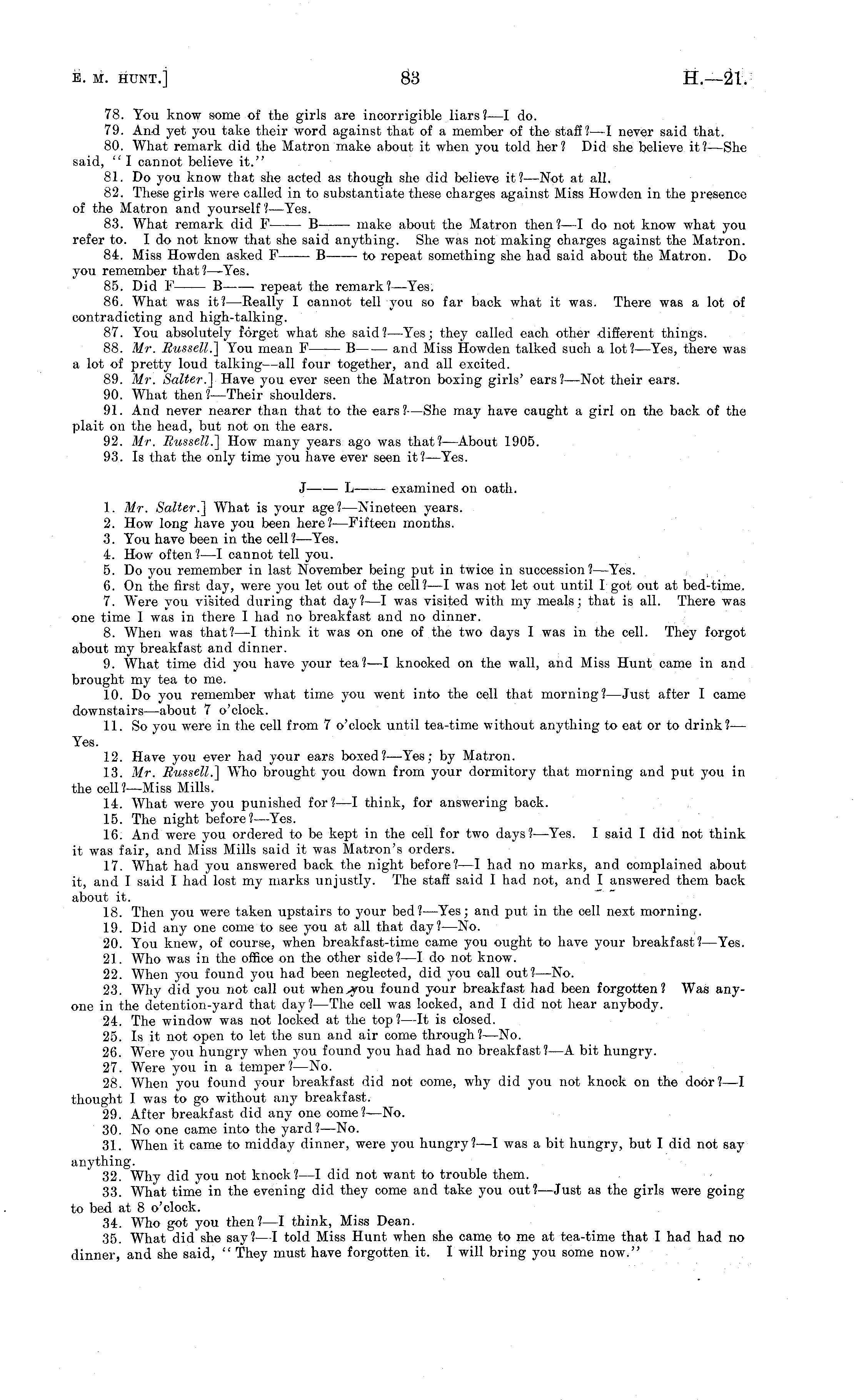 78. You know some of the girls are incorrigible liars?—l do. 79. And yet you take their word against that of a member of the staff?—l never said that. 80. What remark did the Matron make about it when you told her? Did she believe it?— She said, " I cannot believe it." 81. Do you know that she acted as though she did believe it?— Not at all. 82. These girls were called in to substantiate these charges against Miss Howden in the presence of the Matron and yourself ?—Yes. 83. What remark did F B make about the Matron then?—l do not know what you refer to. Ido not know that she said anything. She was not making charges against the Matron. 84. Miss Howden asked F B to repeat something she had said about the Matron. Do you remember that?— Yes. 85. Did F B repeat the remark?— Yes. 86. What was it?— Really I cannot tell you so far back what it was. There was a lot of contradicting and high-talking. 87. You absolutely forget what she said?— Yes; they called each other different things. 88. Mr. Russell.] You mean F B and Miss Howden talked such a lot?— Yes, there was a lot of pretty loud talking—all four together, and all excited. 89. Mr. Salter.] Have you ever seen the Matron boxing girls' ears? —Not their ears. 90. What then ?—Their shoulders. 91. And never nearer than that to the ears? —She may have caught a girl on the back of the plait on the head, but not on the ears. 92. Mr. Russell.] How many years ago was that? —About 1905. 93. Is that the only time you have ever seen it?— Yes. J L examined on oath. 1. Mr. Salter.] What is your age?— Nineteen years. 2. How long have you been here? —Fifteen months. 3. You have been in the cell? —Yes. 4. How often? —I cannot tell you. 5. Do you remember in last November being put in twice in succession?— Yes. 6. On the first day, were you let out of the cell? —I was not let out until I got out at bed-time. 7. Were you visited during that day?—l was visited with my meals; that is all. There was one time I was in there I had no breakfast and no dinner. 8. When was that? —I think it was on one of the two days I was in the cell. They forgot about my breakfast and dinner. 9. What time did you have your tea? —I knocked on the wall, and Miss Hunt came in and brought my tea to me. 10. Do you remember what time you went into the cell that morning?— Just after I came downstairs —about 7 o'clock. 11. So you were in the cell from 7 o'clock until tea-time without anything to eat or to drink?— Yes. 12. Have you ever had your ears boxed?— Yes; by Matron. 13. Mr. Russell.] Who brought you down from your dormitory that morning and put you in the cell? —Miss Mills. 14. What were you punished for? —I think, for answering back. 15. The night before? —Yes. 16. And were you ordered to be kept in the cell for two days?— Yes. I said I did not think it was fair, and Miss Mills said it was Matron's orders. 17. What had you answered back the night before?—l had no marks, and complained about it, and I said I had lost my marks unjustly. The staff said I had not, and I answered them back about it. 18. Then you were taken upstairs to your bed? —Yes; and put in the cell next morning. 19. Did any one come to see you at all that day?— No. 20. You knew, of course, when breakfast-time came you ought to have your breakfast?— Yes. 21. Who was in the office on the other side?—l do not know. 22. When you found you had been neglected, did you call out?— No. 23. Why did you not call out when,you found your breakfast had been forgotten? Was anyone in the detention-yard that day?— The cell was locked, and I did not hear anybody. 24. The window was not locked at the top?—lt is closed. 25. Is it not open to let the sun and air come through?— No. 26. Were you hungry when you found you had had no breakfast?—A bit hungry. 27. Were you in a temper?— No. 28. When you found your breakfast did not come, why did you not knock on the door?—I thought I was to go without any breakfast. 29. After breakfast did any one oome? —No. 30. No one came into the yard? —No. 31. When it came to midday dinner, were you hungry?—l was a bit hungry, but I did not say anything. 32. Why did you not knock? —I did not want to trouble them. 33. What time in the evening did they oome and take you out? —Just as the girls were going to bed at 8 o'clock. 34. Who got you then? —I think, Miss Dean. 35. What did she say?—l told Miss Hunt when she came to me at tea-time that I had had no dinner, and she said, " They must have forgotten it. I will bring you some now."