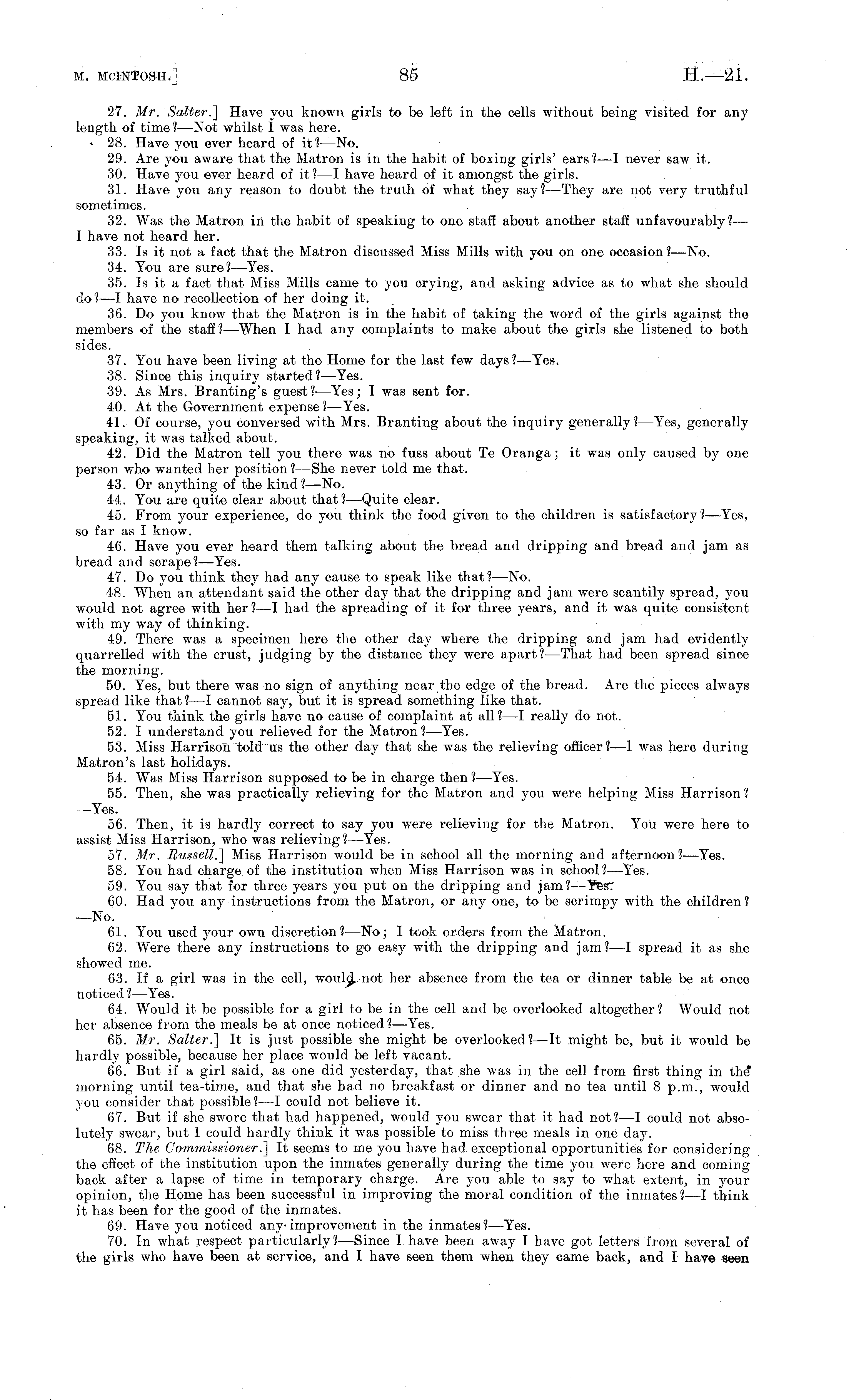 27. Mr. Salter.] Have you known girls to be left in the cells without being visited for any length of time? —Not whilst I was here. - 28. Have you ever heard of it? —No. 29. Are you aware that the Matron is in the habit of boxing girls' ears? —I never saw it. 30. Have you ever heard of it?—l have heard of it amongst the girls. 31. Have you any reason to doubt the truth of what they say? —They are not very truthful sometimes. 32. Was the Matron in the habit of speaking to one staff about another staff unfavourably?— I have not heard her. 33. Is it not a fact that the Matron discussed Miss Mills with you on one occasion?— No. 34. You are sure?— Yes. 35. Is it a fact that Miss Mills came to you crying, and asking advice as to what she should do?—I have no recollection of her doing it. 36. Do you know that the Matron is in the habit of taking the word of the girls against the members of the staff ?—When I had any complaints to make about the girls she listened to both sides. 37. You have been living at the Home for the last few days?— Yes. 38. Since this inquiry started? —Yes. 39. As Mrs. Branting's guest? —Yes; I was sent for. 40. At the Government expense?— Yes. 41. Of course, you conversed with Mrs. Branting about the inquiry generally?— Yes, generally speaking, it was talked about. 42. Did the Matron tell you there was no fuss about Te Oranga; it was only caused by one person who wanted her position ?—She never told me that. 43. Or anything of the kind? —No. 44. You are quite clear about that?— Quite clear. 45. From your experience, do you think the food given to the children is satisfactory?— Yes, so far as I know. 46. Have you ever heard them talking about the bread and dripping and bread and jam as bread and scrape?— Yes. 47. Do you think they had any cause to speak like that? —No. 48. When an attendant said the other day that the dripping and jam were scantily spread, you would not agree with her ?—I had the spreading of it for three years, and it was quite consistent with my way of thinking. 49. There was a specimen here the other day where the dripping and jam had evidently quarrelled with the crust, judging by the distance they were apart?— That had been spread since the morning. 50. Yes, but there was no sign of anything near the edge of the bread. Are the pieces always spread like that ?—I cannot say, but it is spread something like that. 51. You think the girls have no cause of complaint at all?—I really do not. 52. I understand you relieved for the Matron?— Yes. 53. Miss Harrison told us the other day that she was the relieving officer?—l was here during Matron's last holidays. 54. Was Miss Harrison supposed to be in charge then? —Yes. 55. Then, she was practically relieving for the Matron and you were helping Miss Harrison? -Yes. 56. Then, it is hardly correct to say you were relieving for the Matron. You were here to assist Miss Harrison, who was relieving?— Yes. 57. Mr. Russell.] Miss Harrison would be in school all the morning and afternoon? —Yes. 58. You had charge of the institution when Miss Harrison was in school?— Yes. 59. You say that for three years you put on the dripping and jam?— Yes. 60. Had you any instructions from the Matron, or any one, to be scrimpy with the children? —No. 61. You used your own discretion? —No; I took orders from the Matron. 62. Were there any instructions to go easy with the dripping and jam?—l spread it as she showed me. 63. If a girl was in the cell, would, not her absence from the tea or dinner table be at once noticed? —Yes. 64. Would it be possible for a girl to be in the cell and be overlooked altogether ? Would not her absence from the meals be at once noticed? —Yes. 65. Mr. Salter.] It is just possible she might be overlooked? —It might be, but it would be hardly possible, because her place would be left vacant. 66. But if a girl said, as one did yesterday, that she was in the cell from first thing in the* morning until tea-time, and that she had no breakfast or dinner and no tea until 8 p.m., would you consider that possible? —I could not believe it. 67. But if she swore that had happened, would you swear that it had not?—l could not absolutely swear, but I could hardly think it was possible to miss three meals in one day. 68. The Commissioner.] It seems to me you have had exceptional opportunities for considering the effect of the institution upon the inmates generally during the time you were here and coming back after a lapse of time in temporary charge. Are you able to say to what extent, in your opinion, the Home has been successful in improving the moral condition of the inmates ?—I think it has been for the good of the inmates. 69. Have you noticed any-improvement in the inmates? —Yes. 70. In what respect particularly?— Since I have been away I have got letters from several of the girls who have been at service, and I have seen them when they came back, and I have seen