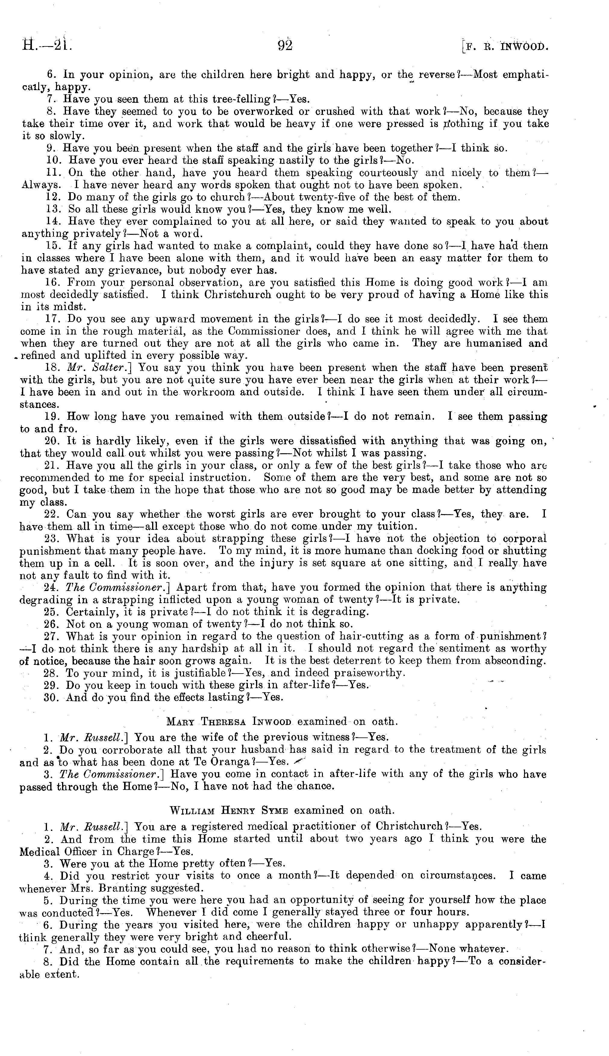 6. In your opinion, are the children here bright and happy, or the reverse?— Most emphatically, happy. 7. Have you seen them at this tree-felling?— Yes. 8. Have they seemed to you to be overworked or crushed with that work? —No, because they take their time over it, and work that would be heavy if one were pressed is nothing if you take it so slowly. 9. Have you been present when the staff and the girls have been together?—l think so. 10. Have you ever heard the staff speaking nastily to the girls? —No. 11. On the other hand, have you heard them speaking courteously and nicely to them?— Always. I have never heard any words spoken that ought not to have been spoken. 12. Do many of the girls go to church? —About twenty-five of the best of them. 13. So all these girls would know you?-—Yes, they know me well. 14. Have they ever complained to you at all here, or said they wanted to speak to you about anything privately?— Not a word. 15. If any girls had wanted to make a complaint, could they have done so?—I have had them in classes where I have been alone with them, and it would have been an easy matter for them to have stated any grievance, but nobody ever has. 16. From your personal observation, are you satisfied this Home is doing good work?—l am most decidedly satisfied. I think Christchurch ought to be very proud of having a Home like this in its midst. 17. Do you see any upward movement in the girls?- —I do see it most decidedly. I see them come in in the rough material, as the Commissioner does, and I think he will agree with me that when they are turned out they are not at all the girls who came in. They are humanised and refined and uplifted in every possible way. 18. Mr. Salter.] You say you think you have been present when the staff have been present with the girls, but you are not quite sure you have ever been near the girls when at their work? — I have been in and out in the workroom and outside. I think I have seen them under all circumstances. 19. How long have you remained with them outside? —I do not remain. I see them passing to and fro. 20. It is hardly likely, even if the girls were dissatisfied with anything that was going on, that they would call out whilst you were passing?— Not whilst I was passing. 21. Have you all the girls in your class, or only a few of the best girls?—l take those who are recommended to me for special instruction. Some of them are the very best, and some are not so good, but I take them in the hope that those who are not so good may be made better by attending my class. 22. Can you say whether the worst girls are ever brought to your class?— Yes, they are. I have them all in time—all except those who do not come under my tuition. 23. What is your idea about strapping these girls?—l have not the objection to corporal punishment that many people have. To my mind, it is more humane than docking food or shutting them up in a cell. It is soon over, and the injury is set square at one sitting, and I really have not any fault to find with it. 24. The Commissioner.] Apart from that, have you formed the opinion that there is anything degrading in a strapping inflicted upon a young woman of twenty? —It is private. 25. Certainly, it is private?—l do not think it is degrading. 26. Not on a young woman of twenty?—l do not think so. 27. What is your opinion in regard to the question of hair-cutting as a form of punishment? —I do not think there is any hardship at all in it. I should not regard the sentiment as worthy of notice, because the hair soon grows again. It is the best deterrent to keep them from absconding. 28. To your mind, it is justifiable?— Yes, and indeed praiseworthy. 29. Do you keep in touch with these girls in after-life?— Yes. 30. And do you find the effects lasting?— Yes. Mary Theresa Inwood examined on oath. 1. Mr. Russell.] You are the wife of the previous witness?— Yes. 2. Do you corroborate all that your husband has said in regard to the treatment of the girls and as *to what has been done at Te Oranga ?—Yes. I**" 1 3. The Commissioner.] Have you come in contact in after-life with any of the girls who have passed through the Home? —No, I have not had the chance. William Henry Syme examined on oath. 1. Mr. Russell.] You are a registered medical practitioner of Christchurch? —Yes. 2. And from the time this Home started until about two years ago I think you were the Medical Officer in Charge? —Yes. 3. Were you at the Home pretty often? —Yes. 4. Did you restrict your visits to once a month? —It depended on circumstances. I came whenever Mrs. Branting suggested. 5. During the time you were here you had an opportunity of seeing for yourself how the place was conducted ?—Yes. Whenever I did come I generally stayed three or four hours. 6. During the years you visited here, were the children happy or unhappy apparently?—l think generally they were very bright and cheerful. 7. And, so far as you could see, you had no reason to think otherwise?— None whatever. 8. Did the Home contain all,the requirements to make the children happy? —To a considerable extent,