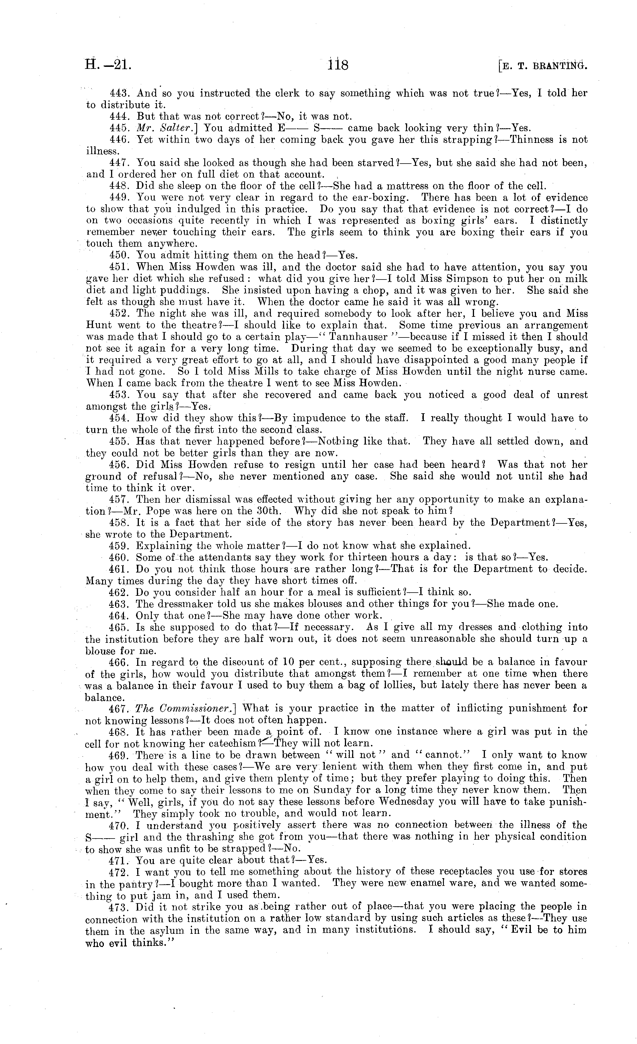 443. And so you instructed the clerk to say something which was not true? —Yes, I told her to distribute it. 444. But that was not correct?—No, it was not. 445. Mr. Salter.] You admitted E S came back looking very thin? —Yes. 446. Yet within two days of her coming back you gave her this strapping? —Thinness is not illness. 447. You said she looked as though she had been starved? —Yes, but she said she had not been, and I ordered her on full diet on that account. 448. Did she sleep on the floor of the cell?— She had a mattress on the floor of the cell. 449. You were not very clear in regard to the ear-boxing. There has been a lot of evidence to show that you indulged in this practice. Do you say that that evidence is not correct?—l do on two occasions quite recently in which I was represented as boxing girls' ears. I distinctly remember never touching their ears. The girls seem to think you are boxing their ears if you touch them anywhere. 450. You admit hitting them on the head? —Yes. 451. When Miss Howden was ill, and the doctor said she had to have attention, you say you gave her diet which she refused : what did you give her ?—I told Miss Simpson to put her on milk diet and light puddings. She insisted upon having a chop, and it was given to her. She said she felt as though she must have it. When the doctor came he said it was all wrong. 452. The night she was ill, and required somebody to look after her, I believe you and Miss Hunt went to the theatre? —I should like to explain that. Some time previous an arrangement was made that I should go to a certain play—" Tannhauser " —because if I missed it then I should not see it again for a very long time. During that day we seemed to be exceptionally busy, and it required a very great effort to go at all, and I should have disappointed a good many people if I had not gone. So I told Miss Mills to take charge of Miss Howden until the night nurse came. When I came back from the theatre I went to see Miss Howden. 453. You say that after she recovered and came back you noticed a good deal of unrest amongst the girls ?—Yes. 454. How did they show this?—By impudence to the staff. I really thought I would have to turn the whole of the first into the second class. 455. Has that never happened before? —Nothing like that. They have all settled down, and they could not be better girls than they are now. 456. Did Miss Howden refuse to resign until her case had been heard? Was that not her ground of refusal? —No, she never mentioned any case. She said she would not until she had time to think it over. 457. Then her dismissal was effected without giving her any opportunity to make an explanation? —Mr. Pope was here on the 30th. Why did she not speak to him? 458. It is a fact that her side of the story has never been heard by the Department?— Yes, she wrote to the Department. 459. Explaining the whole matter? —I do not know what she explained. 460. Some of the attendants say they work for thirteen hours a day: is that so?— Yes. 461. Do you not think those hours are rather long?— That is for the Department to decide. Many times during the day they have short times off. 462. Do you consider half an hour for a meal is sufficient? —I think so. 463. The dressmaker told us she makes blouses and other things for you? —She made one. 464. Only that one?— She may have done other work. 465. Is she supjiosed to do that? —If necessary. As I give all my dresses and clothing into the institution before they are half worn out, it does not seem unreasonable she should turn up a blouse for me. 466. In regard to the discount of 10 per cent,, supposing there should be a balance in favour of the girls, how would you distribute that amongst them? —I remember at one time when there was a balance in their favour I used to buy them a bag of lollies, but lately there has never been a balance. 467. The Commissioner.] What is your practice in the matter of inflicting punishment for not knowing lessons?—lt does not often happen. 468. It has rather been made a point of. I know one instance where a girl was put in the cell for not knowing her catechism will not learn. 469. There is a line to be drawn between " will not " and " cannot," I only want to know how you deal with these cases?—We are very lenient with them when they first come in, and put a girl on to help them, and give them plenty of time; but they prefer playing to doing this. Then when they come to say their lessons to me on Sunday for a long time they never know them. Then I say, " Well, girls, if you do not say these lessons before Wednesday you will have to take punishment." They simply took no trouble, and would not learn. 470. I understand you positively- assert there was no connection between the illness of the S girl and the thrashing she got from you —that there was nothing in her physical condition to show she was unfit to be strapped ?—No. 471. You are quite clear about that? —Yes. 472. I want you to tell me something about the history of these receptacles you use for stores in the pantry? —I bought more than I wanted. They were new enamel ware, and we wanted something to put jam in, and I used them. 473. Did it not strike you as being rather out of place—that you were placing the people in connection with the institution on a rather low- standard by using such articles as these?— They use them in the asylum in the same way, and in many institutions. I should say, " Evil be to him who evil thinks."