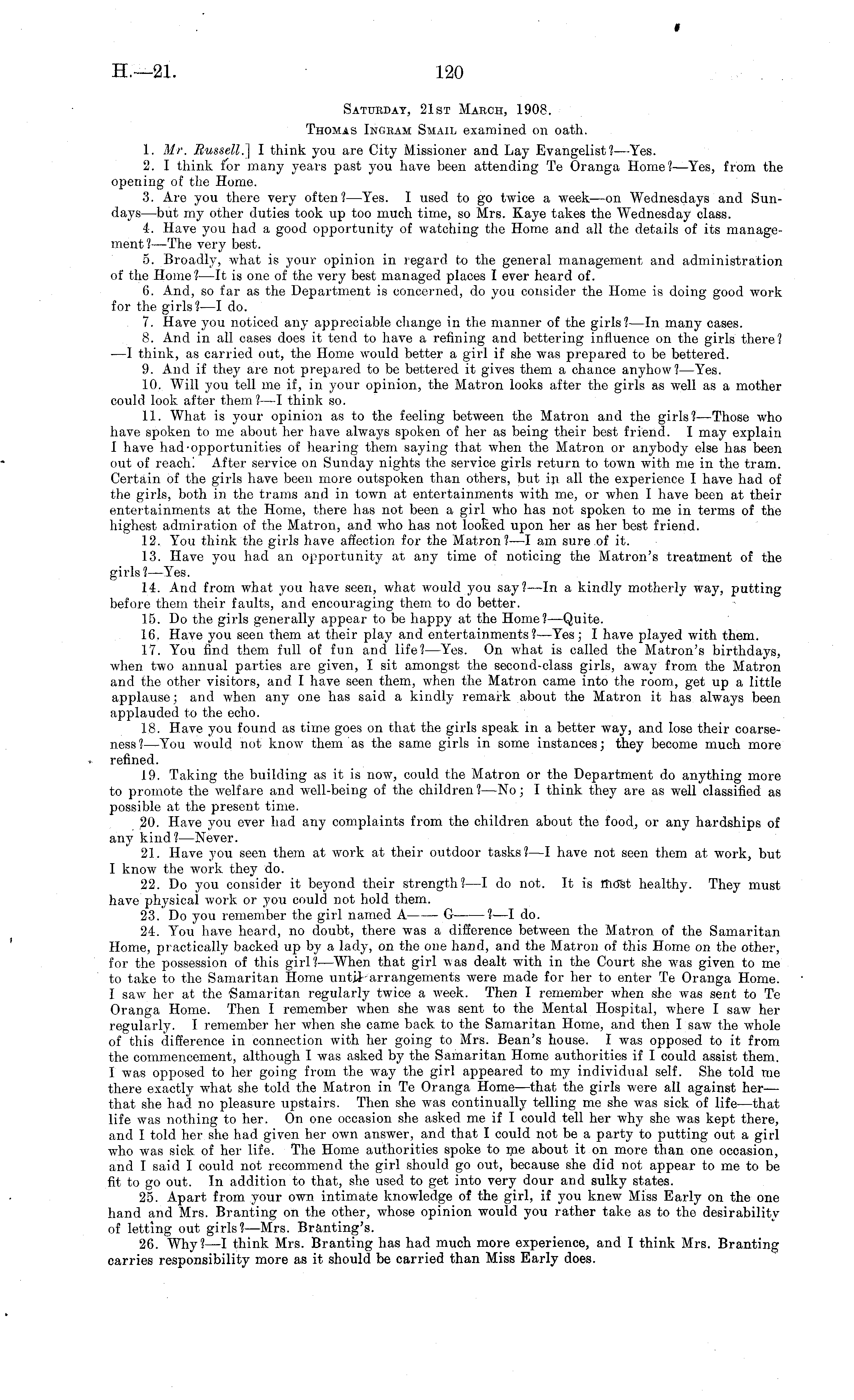 Saturday, 21st March, 1908. Thomas Ingram Smail examined on oath. 1. Mr. Russell.] I think you are City Missioner and Lay Evangelist?— Yes. 2. I think for many years past you have been attending Te Oranga Home?— Yes, from the opening of the Home. 3. Are you there very often?— Yes. I used to go twice a week —on Wednesdays and Sundays —but my other duties took up too much time, so Mrs. Kaye takes the Wednesday class. 4. Have you had a good opportunity of watching the Home and all the details of its management?— The very best. 5. Broadly, what is your opinion in regard to the general management and administration of the Home? —It is one of the very best managed places I ever heard of. 6. And, so far as the Department is concerned, do you consider the Home is doing good work for the girls?—l do. 7. Have you noticed any appreciable change in the manner of the girls?—ln many cases. 8. And in all cases does it tend to have a refining and bettering influence on the girls there? —I think, as carried out, the Home would better a girl if she was prepared to be bettered. 9. And if they are not prepared to be bettered it gives them a chance anyhow?— Yes. 10. Will you tell me if, in your opinion, the Matron looks after the girls as well as a mother could look after them?—l think so. 11. What is your opinion as to the feeling between the Matron and the girls?— Those who have spoken to me about her have always spoken of her as being their best friend. I may explain I have had-opportunities of hearing them saying that when the Matron or anybody else has been out of reach! After service on Sunday nights the service girls return to town with me in the tram. Certain of the girls have been more outspoken than others, but in all the experience I have had of the girls, both in the trams and in town at entertainments with me, or when I have been at their entertainments at the Home, there has not been a girl who has not spoken to me in terms of the highest admiration of the Matron, and who has not looked upon her as her best friend. 12. You think the girls have affection for the Matron? —I am sure of it. 13. Have you had an opportunity at any time of noticing the Matron's treatment of the girls? —Yes. 14. And from what you have seen, what would you say?—ln a kindly motherly way, putting before them their faults, and encouraging them to do better. 15. Do the girls generally appear to be happy at the Home? —Quite. 16. Have you seen them at their play and entertainments?— Yes; I have played with them. 17. You find them full of fun and life? —Yes. On what is called the Matron's birthdays, when two annual parties are given, I sit amongst the second-class girls, away from the Matron and the other visitors, and I have seen them, when the Matron came into the room, get up a little applause; and when any one has said a kindly remark about the Matron it has always been applauded to the echo. 18. Have you found as time goes on that the girls speak in a better way, and lose their coarseness?— You would not know them as the same girls in some instances; they become much more refined. 19. Taking the building as it is now, could the Matron or the Department do anything more to promote the welfare and well-being of the children ?—No; I think they are as well classified as possible at the present time. 20. Have you ever had any complaints from the children about the food, or any hardships of any kind?— Never. 21. Have you seen them at work at their outdoor tasks?—l have not seen them at work, but I know the work they do. 22. Do you consider it beyond their strength?—l do not. It is most healthy. They must have physical work or you could not hold them. 23. Do you remember the girl named A G ?—I do. 24. You have heard, no doubt, there was a difference between the Matron of the Samaritan Home, practically backed up by a lady, on the one hand, and the Matron of this Home on the other, for the possession of this girl?— When that girl was dealt with in the Court she was given to me to take to the Samaritan Home until arrangements were made for her to enter Te Oranga Home. I saw her at the Samaritan regularly twice a week. Then I remember when she was sent to Te Oranga Home. Then I remember when she was sent to the Mental Hospital, where I saw her regularly. I remember her when she came back to the Samaritan Home, and then I saw the whole of this difference in connection with her going to Mrs. Bean's house. I was opposed to it from the commencement, although I was asked by the Samaritan Home authorities if I could assist them. I was opposed to her going from the way the girl appeared to my individual self. She told me there exactly what she told the Matron in Te Oranga Horne —that the girls were all against her— that she had no pleasure upstairs. Then she was continually telling me she was sick of life—that life was nothing to her. On one occasion she asked me if I could tell her why she was kept there, and I told her she had given her own answer, and that I could not be a party to putting out a girl who was sick of her life. The Home authorities spoke to me about it on more than one occasion, and I said I could not recommend the girl should go out, because she did not appear to me to be fit to go out. In addition to that, she used to get into very dour and sulky states. 25. Apart from your own intimate knowledge of the girl, if you knew Miss Early on the one hand and Mrs. Branting on the other, whose opinion would you rather take as to the desirability of letting out girls?— Mrs. Branting's. 26. Why?—l think Mrs. Branting has had much more experience, and I think Mrs. Branting carries responsibility more as it should be carried than Miss Early does.