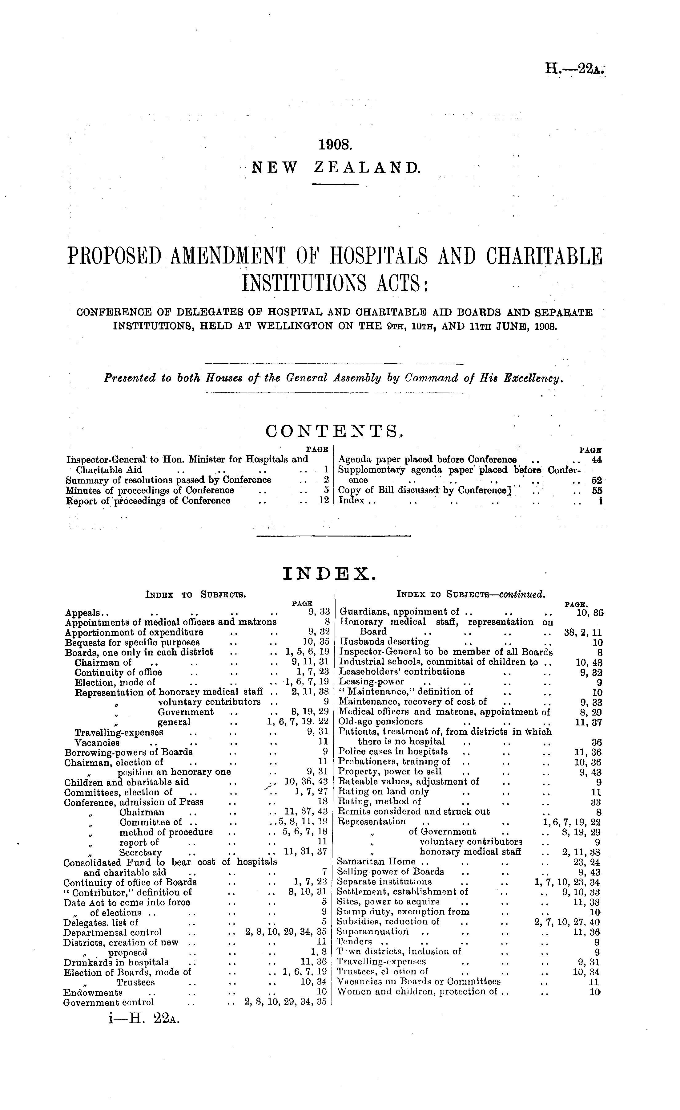 PROPOSED AMENDMENT OF HOSPITALS AND CHARITABLE INSTITUTIONS ACTS: CONFERENCE OF DELEGATES OF HOSPITAL AND CHARITABLE AID BOARDS AND SEPARATE INSTITUTIONS, HELD AT WELLINGTON ON THE 9th, 10th, AND 11th JUNE, 1908.