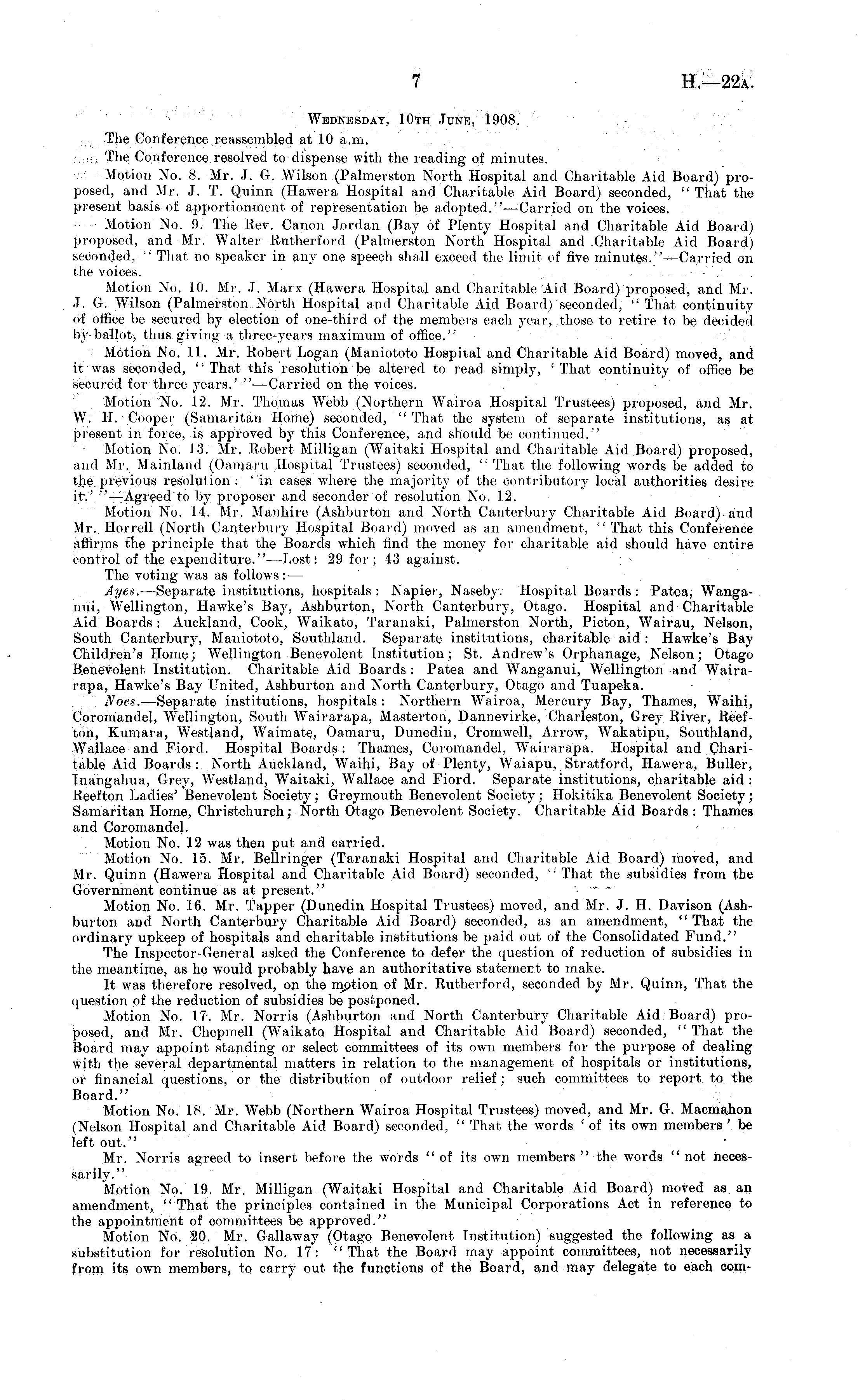 Wednesday, 10th June, 1908. , The Conference reassembled at 10 a.m. , The Conference resolved to dispense with the reading of minutes. ; Motion No. 8. Mr. J. G. Wilson (Palmerston North Hospital and Charitable Aid Board) proposed, and Mr. J. T. Quinn (Hawera Hospital and Charitable Aid Board) seconded, "That the present basis of apportionment of representation be adopted."—Carried on the voices. - Motion No. 9. The Rev. Canon Jordan (Bay of Plenty Hospital and Charitable Aid Board) proposed, and Mr. Walter Rutherford (Palmerston North Hospital and Charitable Aid Board) seconded, '• That no speaker in any one speech shall exceed the limit of five minutes."-—Carried on the voices. , ..'—-". Motion No. 10. Mr, J. Marx (Hawera Hospital and Charitable Aid Board) proposed, and Mr. J. G. Wilson (Palmerston North Hospital and Charitable Aid Board) seconded, " That continuity of office be secured by election of one-third of the members each year, those to retire to be decided by ballot, thus giving a three-years maximum of office." Motion No. 11. Mr. Robert Logan (Maniototo Hospital and Charitable Aid Board) moved, and it was seconded, "That this resolution be altered to read simply, 'That continuity of office be secured for three years,' " —Carried on the voices. Motion No. 12. Mr. Thomas Webb (Northern Wairoa Hospital Trustees) proposed, and Mr. W. H. Cooper (Samaritan Home) seconded, " That the system of separate institutions, as at present in force, is approved by this Conference, and should be continued." Motion No. 13. Mr. Robert Milligan (Waitaki Hospital and Charitable Aid Board) proposed, and Mr. Mainland (Oamaru Hospital Trustees) seconded, "That the following words be added to the previous resolution : ' in cases where the majority of the contributory local authorities desire it.' "—Agreed to by proposer and seconder of resolution No. 12. Motion No. 14. Mr. Manhire (Ashburton and North Canterbury Charitable Aid Board) and Mr. Horrell (North Canterbury Hospital Board) moved as an amendment, " That this Conference affirms the principle that the Boards which find the money for charitable aid should have entire control of the expenditure."—Lost: 29 for; 43 against. The voting was as follows: — Ayes. —Separate institutions, hospitals : Napier, Naseby. Hospital Boards ; Patea, Wanganui, Wellington, Hawke's Bay, Ashburton, North Canterbury, Otago. Hospital and Charitable Aid Boards : Auckland, Cook, Waikato, Taranaki, Palmerston North, Picton, Wairau, Nelson, South Canterbury, Maniototo, Southland. Separate institutions, charitable aid : Hawke's Bay Children's Home; Wellington Benevolent Institution; St. Andrew's Orphanage, Nelson; Otago Benevolent Institution. Charitable Aid Boards : Patea and Wanganui, Wellington and Wairarapa, Hawke's Bay United, Ashburton. and North Canterbury, Otago and Tuapeka. Noes. —Separate institutions, hospitals : Northern Wairoa, Mercury Bay, Thames, Waihi, Coromandel, Wellington, South Wairarapa, Masterton, Dannevirke, Charleston, Grey River, Reefton, Kumara, Westland, Waimate, Oamaru, Dunedin, Cromwell, Arrow, Wakatipu, Southland, Wallace and Fiord. Hospital Boards: Thames, Coromandel, Wairarapa. Hospital and Charitable Aid Boards : North Auckland, Waihi, Bay of Plenty, AYaiapu, Stratford, Hawera, Buller, Inangahua, Grey, Westland, Waitaki, AVallace and Fiord. Separate institutions, charitable aid : Reefton Ladies' Benevolent Society; Greymouth Benevolent Society; Hokitika Benevolent Society; Samaritan Home, Christchurch; North Otago Benevolent Society. Charitable Aid Boards : Thames and Coromandel. Motion No. 12 was then put and carried. Motion No. 15. Mr. Bellringer (Taranaki Hospital and Charitable Aid Board) moved, and Mr. Quinn (Hawera Hospital and Charitable Aid Board) seconded, " That the subsidies from the Government continue as at present." Motion No. 16. Mr. Tapper (Dunedin Hospital Trustees) moved, and Mr. J. H. Davison (Ashburton and North Canterbury Charitable Aid Board) seconded, as an amendment, "That the ordinary upkeep of hospitals and charitable institutions be paid out of the Consolidated Fund." The Inspector-General asked the Conference to defer the question of reduction of subsidies in the meantime, as he would probably have an authoritative statement to make. It was therefore resolved, on the motion of Mr. Rutherford, seconded by Mr. Quinn, That the question of the reduction of subsidies be postponed. Motion No. 17. Mr. Norris (Ashburton and North Canterbury Charitable Aid Board) proposed, and Mr. Chepmell (AVaikato Hospital and Charitable Aid Board) seconded, " That the Board may appoint standing or select committees of its own members for the purpose of dealing with the several departmental matters in relation to the management of hospitals or institutions, or financial questions, or the distribution of outdoor relief; such committees to report to the Board." Motion No, 18. Mr. Webb (Northern Wairoa Hospital Trustees) moved, and Mr. G. Macmahon (Nelson Hospital and Charitable Aid Board) seconded, " That the words ' of its own members ' be left out." Mr. Norris agreed to insert before the words " of its own members " the words " not necessarily." Motion No. 19. Mr. Milligan (Waitaki Hospital and Charitable Aid Board) moved as an amendment, " That the principles contained in the Municipal Corporations Act in reference to the appointment of committees be approved." Motion No. 20. Mr. Gallaway (Otago Benevolent Institution) suggested the following as a substitution for resolution No. 17: "That the Board may appoint committees, not necessarily from its own members, to carry out the functions of the Board, and may delegate to each com-