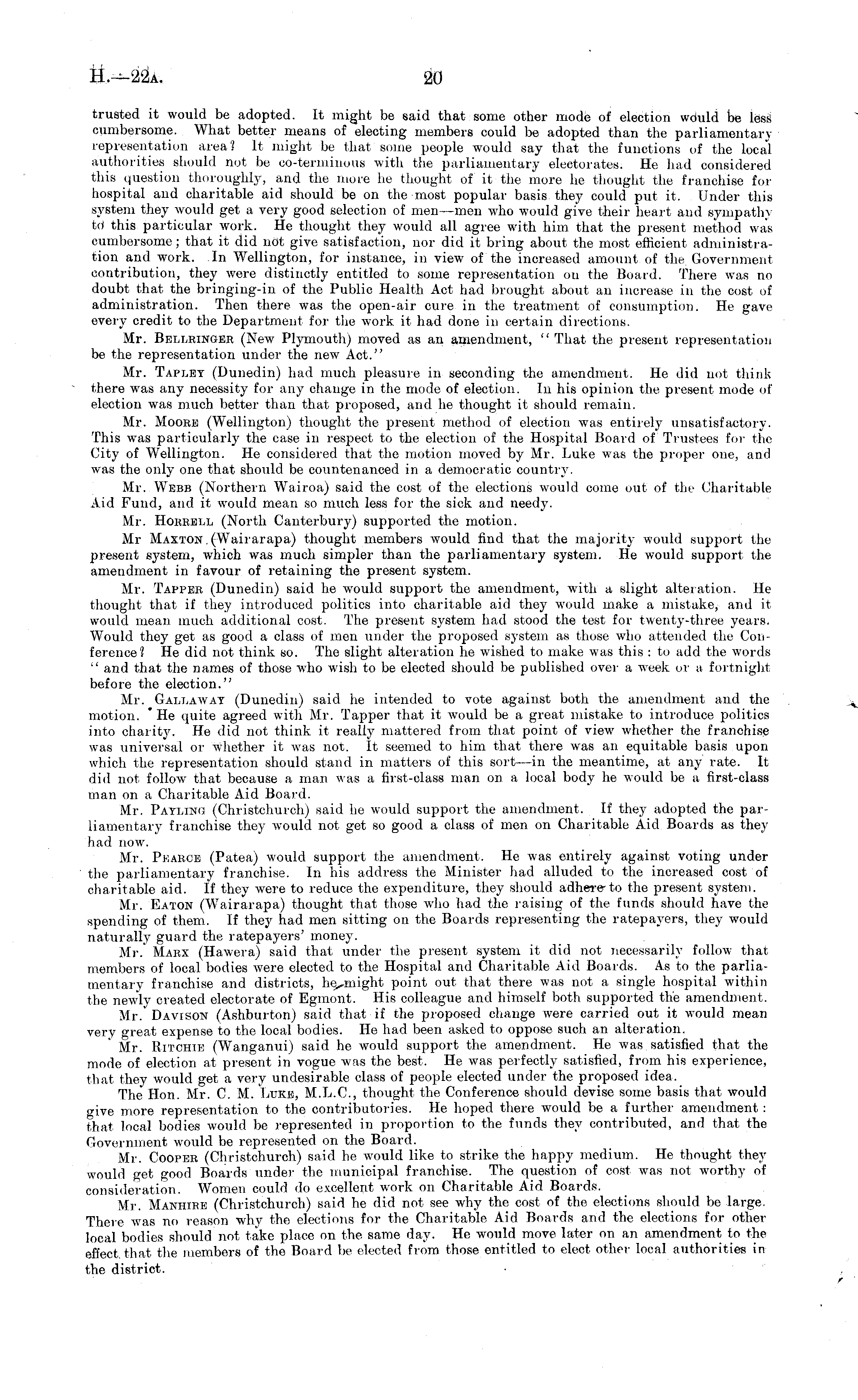 trusted it would be adopted. It might be said that some other mode of election would be less cumbersome. What better means of electing members could be adopted than the parliamentary representation area? It might be that some people would say that the functions of the local authorities should not be co-terminous with the parliamentary electorates. He had considered this question thoroughly, and the more he thought of it the more he thought the franchise for hospital and charitable aid should be on the most popular basis they could put it. Under this system they would get a very good selection of men—men who would give their heart and sympathy fed this particular work. He thought they would all agree with him that the present method was cumbersome; that it did not give satisfaction, nor did it bring about the most efficient administration and work. In AA r ellington, for instance, in view of the increased amount of the Government contribution, they were distinctly entitled to some representation on the Board. There was no doubt that the bringing-in of the Public Health Act had brought about an increase in the cost of administration. Then there was the open-air cure, in the treatment of consumption. He gave every credit to the Department for the work it had done in certain directions. Mr. Bellringer (New Plymouth) moved as an amendment, " That the present representation be the representation under the new Act." Mr. Tapley (Dunedin) had much pleasure in seconding the amendment. He did not think there was any necessity for any change in the mode of election. In his opinion the present mode of election was much better than that proposed, and he thought it should remain. Mr. Moore (Wellington) thought the present method of election was entirely unsatisfactory. This was particularly the case in respect to the election of the Hospital Board of Trustees for the City of AA T ellingtou. He considered that the motion moved by Mr. Luke was the proper one, and was the only one that should be countenanced in a democratic country. Mr. Webb (Northern Wairoa) said the cost of the elections would come out of the Charitable Aid Fund, and it would mean so much less for the sick and needy. Mr. Horrell (North Canterbury) supported the motion. Mr Maxton,(Wairarapa) thought members would find that the majority would support the present system, which was much simpler than the parliamentary system. He would support the amendment in favour of retaining the present system. Mr. Tapper (Dunedin) said he would support the amendment, with a slight alteration. He thought that if they introduced politics into charitable aid they would make a mistake, and it would mean much additional cost. The present system had stood the test for twenty-three years. Would they get as good a class of men under the proposed system as those who attended the Conference? He did not think so. The slight alteration he wished to make was this :to add the words " and that the names of those who wish to be elected should be published over a week or a fortnight before the election." Mr. Gallaway (Dunedin) said he intended to vote against both the amendment and the motion. "He quite agreed with Mr. Tapper that it would be a great mistake to introduce politics into charity. He did not think it really mattered from that point of view whether the franchise was universal or whether it was not. It seemed to him that there was an equitable basis upon which the representation should stand in matters of this sort—in the meantime, at any rate. It did not follow that because a man was a first-class man on a local body he would be a first-class man on a Charitable Aid Board. Mr. Payling (Christchurch) said he would support the amendment. If they adopted the parliamentary franchise they would not get so good a class of men on Charitable Aid Boards as they had now. Mr. Pearce (Patea) would support the amendment. He was entirely against voting under the parliamentary franchise. In his address the Minister had alluded to the increased cost of charitable aid. If they were to reduce the expenditure, they should adhere to the present system. Mr. Eaton (AVairarapa) thought that those who had the raising of the funds should have the spending of them. If they had men sitting on the Boards representing the ratepayers, they would naturally guard the ratepayers' money. Mr. Marx (Hawera) said that under the present system it did not necessarily follow that members of local bodies were elected to the Hospital and Charitable Aid Boards. As to the parliamentary franchise and districts, point out that there was not a single hospital within the newly created electorate of Egmont. His colleague and himself both supported the amendment. Mr." Davison (Ashburton) said that if the proposed change were carried out it would mean very great expense to the local bodies. He had been asked to oppose such an alteration. Mr. Ritchie (Wanganui) said he would support the amendment. He was satisfied that the mode of election at present in vogue was the best. He was perfectly satisfied, from his experience, that they would get a very undesirable class of people elected under the proposed idea. The Hon. Mr. C. M. Luke, M.L.C., thought the Conference should devise some basis that would give more representation to the contributories. He hoped there would be a further amendment : that local bodies would be represented in proportion to the funds they contributed, and that the Government would be represented on the Board. Mr. Cooper (Christchurch) said he would like to strike the happy medium. He thought they would get good Boards under the municipal franchise. The question of cost was not worthy of consideration. Women could do excellent work on Charitable Aid Boards. Mr. Manhire (Christchurch) said he did not see why the cost of the elections should be large. There was no reason why the elections for the Charitable Aid Boards arid the elections for otherlocal bodies should not take place on the 