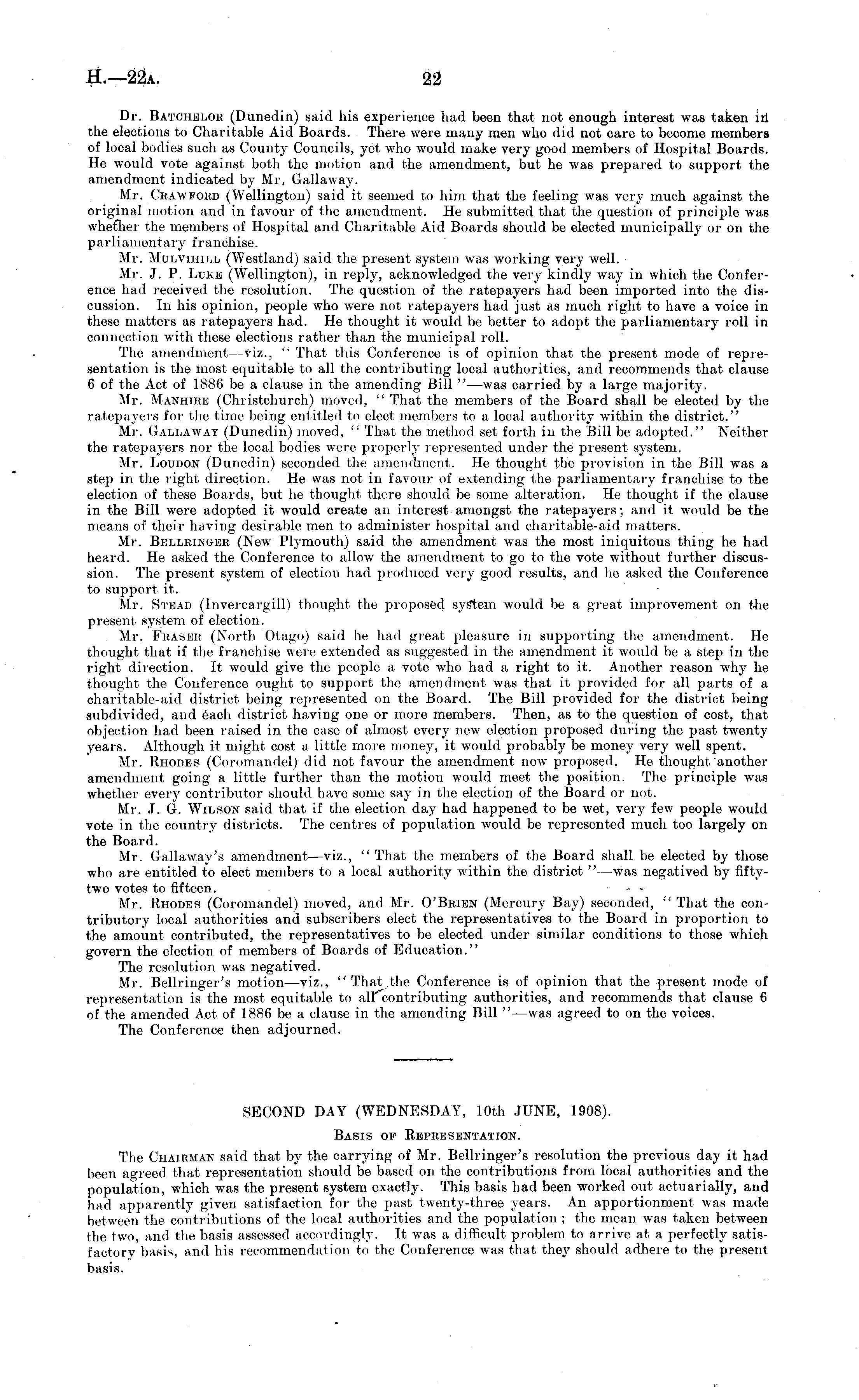 SECOND DAY (WEDNESDAY, 10th JUNE, 1908). Basis of Representation. The Chairman said that by the carrying of Mr. Bellringer's resolution the previous day it had been agreed that representation should be based on the contributions from local authorities and the population, which was the present system exactly. This basis had been worked out actuarially, and had apparently given satisfaction for the past twenty-three years. An apportionment was made between the contributions of the local authorities and the population ; the mean was taken between the two, and the basis assessed accordingly. It was a difficult problem to arrive at a perfectly satisfactory basis, and his recommendation to the Conference was that they should adhere to the present basis.