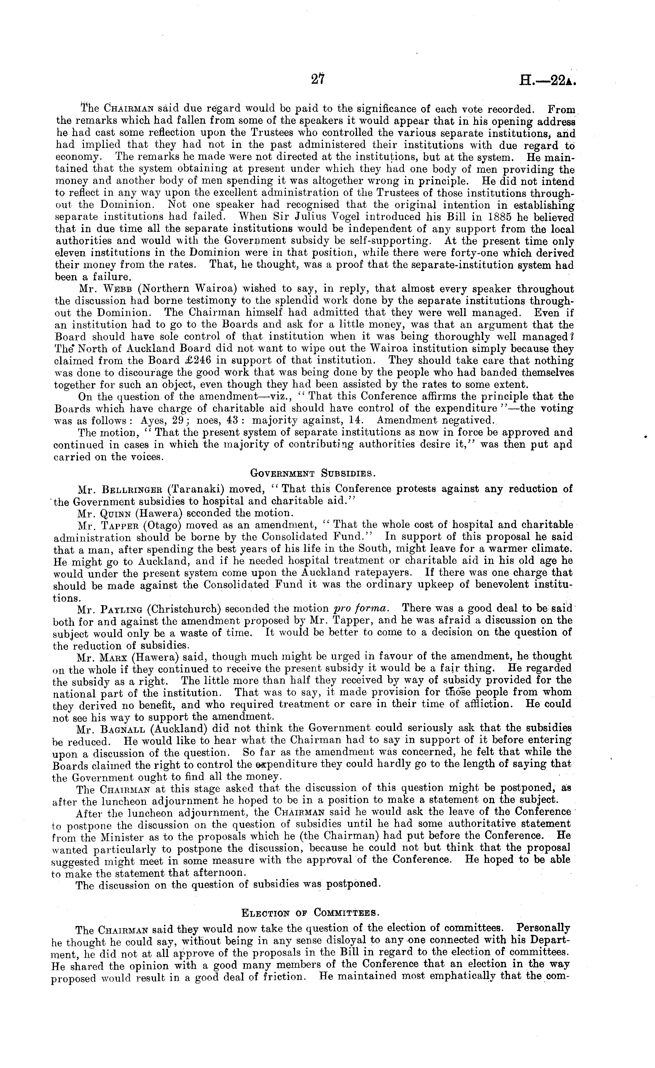 The Chairman said due regard would be paid to the significance of each vote recorded. From the remarks which had fallen from some of the speakers it would appear that in his opening address he had cast some reflection upon the Trustees who controlled the various separate institutions, and had implied that they had not in the past administered their institutions with due regard to economy. The remarks he made were not directed at the institutions, but at the system. He maintained that the system obtaining at present under which they had one body of men providing the money and another body of men spending it was altogether wrong in principle. He did not intend to reflect in any way upon the excellent administration of the Trustees of those institutions throughout the Dominion. Not one speaker had recognised that the original intention in establishing separate institutions had failed. When Sir Julius introduced his Bill in 1885 he believed that in due time all the separate institutions would be independent of any support from the local authorities and would with the Government subsidy be self-supporting. At the present time only eleven institutions in the Dominion were in that position, while there were forty-one which derived their money from the rates. That, he thought, was a proof that the separate-institution system had been a failure. Mr. Webb (Northern Wairoa) wished to say, in reply, that almost every speaker throughout the discussion had borne testimony to the splendid work done by the separate institutions throughout the Dominion. The Chairman himself had admitted that they were well managed. Even if an institution had to go to the Boards and ask for a little money, was that an argument that the Board should have sole control of that institution when it was being thoroughly well managed? The* North of Auckland Board did not want to wipe out the Wairoa institution simply because they claimed from the Board £246 in support of that institution. They should take care that nothing was done to discourage the good work that was being done by the people who had banded themselves together for such an object, even though they had been assisted by the rates to some extent. On the question of the amendment —viz., " That this Conference affirms the principle that the Boards which have charge of charitable aid should have control of the expenditure " —the voting was as follows : Ayes, 29; noes, 43 : majority against, 14. Amendment negatived. The motion, " That the present system of separate institutions as now in force be approved and continued in cases in which the majority of contributing authorities desire it," was then put and carried on the voices. Government Subsidies. Mr. Bellringer (Taranaki) moved, "That this Conference protests against any reduction of the Government subsidies to hospital and charitable aid." Mr. Quinn (Hawera) seconded the motion. Mr. Tapper (Otago) moved as an amendment, " That the whole cost of hospital and charitable administration should be borne by the Consolidated Fund." In support of this proposal he said that a man, after spending the best years of his life in the South, might leave for a warmer climate. He might go to Auckland, and if he needed hospital treatment or charitable aid in his old age he would under the present system come upon the Auckland ratepayers. If there was one charge that should be made against the Consolidated Fund it was the ordinary upkeep of benevolent institutions. Mr. Payling (Christchurch) seconded the motion pro forma. There was a good deal to be said both for and against the amendment proposed by Mr. Tapper, and he was afraid a discussion on the subject would only be a waste of time. It would be better to come to a decision on the question of the reduction of subsidies. Mr. Marx (Hawera) said, though much might be urged in favour of the amendment, he thought on the whole if they continued to receive the present subsidy it would be a fair thing. He regarded the subsidy as a right. The little more than half they received by way of subsidy provided for the national part of the institution. That was to say, it made provision for those people from whom they derived no benefit, and who required treatment or care in their time of affliction. He could not see his way to support the amendment. Mr. Bagnall (Auckland) did not think the Government could seriously ask that the subsidies be reduced. He would like to hear what the Chairman had to say in support of it before entering upon a discussion of the question. So far as the amendment was concerned, he felt that while the Boards claimed the right to control the expenditure they could hardly go to the length of saying that the Government ought to find all the money. The Chairman at this stage asked that the discussion of this question might be postponed, as after the luncheon adjournment he hoped to be in a position to make a statement on the subject. After the luncheon adjournment, the Chairman said he would ask the leave of the Conference to postpone the discussion on the question of subsidies until he had some authoritative statement from the Minister as to the proposals which he (the Chairman) had put before the Conference. He wanted particularly to postpone the discussion, because he could not but think that the proposal suggested might meet in some measure with the approval of the Conference. He hoped to be able to make the statement that afternoon. The discussion on the question of subsidies was postponed. Election of Committees. The Chairman said they would now take the question of the election of committees. Personally he thought he could say, without being in any sense disloyal to any one connected with his Department, he did not at all approve of the proposals in the Bill in regard to the election of committees. He shared the opinion with a good many members of the Conference that an election in the way proposed would result in a good deal of friction. He maintained most emp