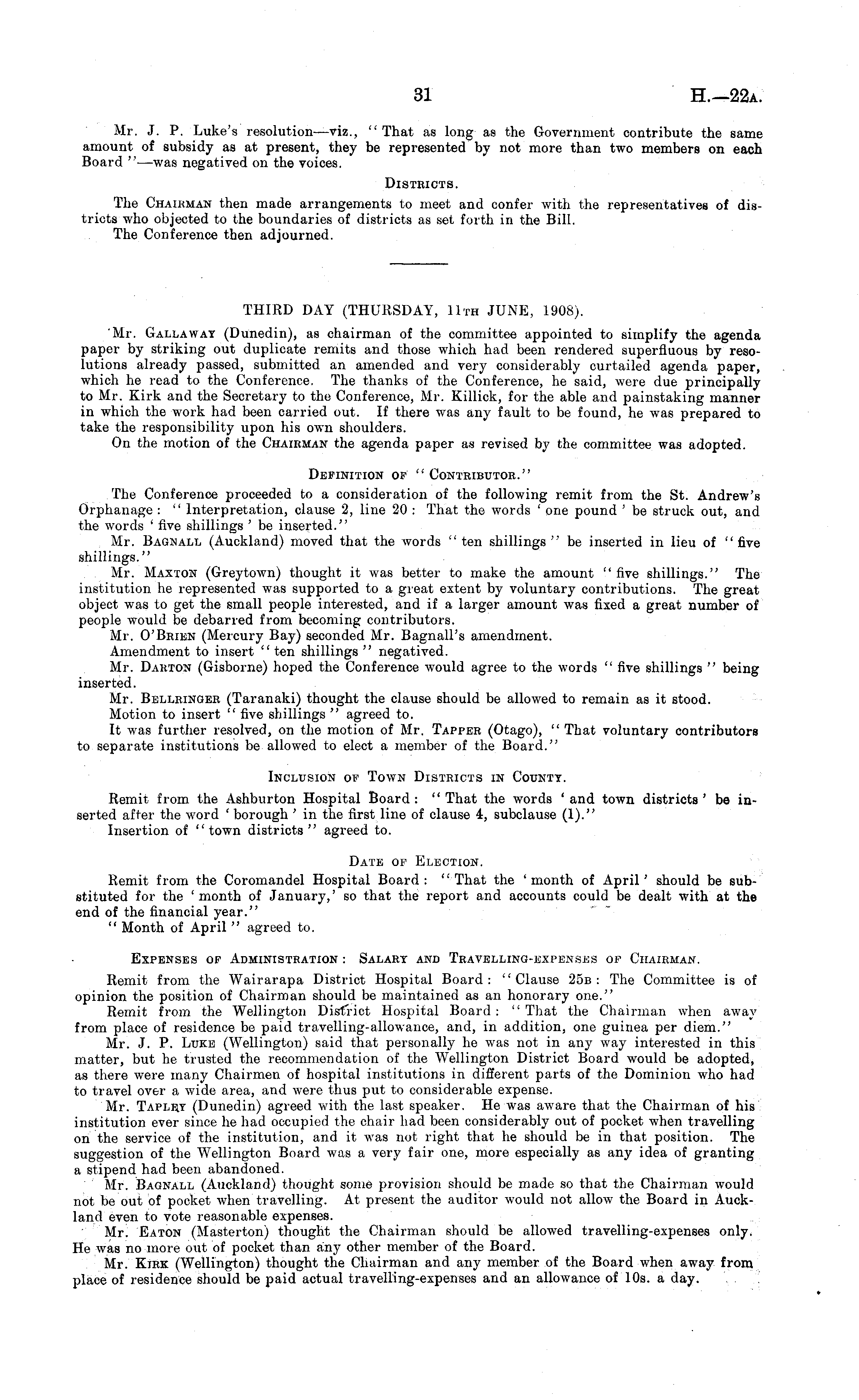 THIRD DAY (THURSDAY, 11th JUNE, 1908). Mr. Gallaway (Dunedin), as chairman of the committee appointed to simplify the agenda paper by striking out duplicate remits and those which had been rendered superfluous by resolutions already passed, submitted an amended and very considerably curtailed agenda paper, which he read to the Conference. The thanks of the Conference, he said, were due principally to Mr. Kirk and the Secretary to the Conference, Mr. Killick, for the able and painstaking manner in which the work had been carried out. If there was any fault to be found, he was prepared to take the responsibility upon his own shoulders. On the motion of the Chairman the agenda paper as revised by the committee was adopted. Definition of " Contributor." The Conference proceeded to a consideration of the following remit from the St. Andrew's Orphanage : " Interpretation, clause 2, line 20 : That the words ' one pound ' be struck out, and the words ' five shillings ' be inserted." Mr. Bagnall (Auckland) moved that the words "ten shillings" be inserted in lieu of "five shillings." Mr. Maxton (Greytown) thought it was better to make the amount "five shillings." The institution he represented was supported to a great extent by voluntary contributions. The great object was to get the small people interested, and if a larger amount was fixed a great number of people would be debarred from becoming contributors. Mr. O'Brien (Mercury Bay) seconded Mr. BagnalPs amendment. Amendment to insert " ten shillings " negatived. Mr. Darton (Gisborne) hoped the Conference would agree to the words " five shillings " being inserted. Mr. Bellringer (Taranaki) thought the clause should be allowed to remain as it stood. Motion to insert " five shillings " agreed to. It was further resolved, on the motion of Mr. Tapper (Otago), "That voluntary contributors to separate institutions be allowed to elect a member of the Board." Inclusion of Town Districts in County. Remit from the Ashburton Hospital Board: "That the words 'and town districts' be inserted after the word ' borough ' in the first line of clause 4, subclause (1)." Insertion of "town districts " agreed to. Date of Election. Remit from the Coromandel Hospital Board: "That the 'month of April' should be substituted for the 'month of January,' so that the report and accounts could be dealt with at the end of the financial year." " Month of April " agreed to. Expenses of Administration : Salary and Travelling-expenses of Chairman. Remit from the Wairarapa District Hospital Board: "Clause 25b: The Committee is of opinion the position of Chairman should be maintained as an honorary one." Remit from the Wellington District Hospital Board : " That the Chairman when away from place of residence be paid travelling-allowance, and, in addition, one guinea per diem." Mr. J. P. Luke (AVellington) said that personally he was not in any way interested in this matter, but he trusted the recommendation of the AVellington District Board would be adopted, as there were many Chairmen of hospital institutions in different parts of the Dominion who had to travel over a wide area, and were thus put to considerable expense. Mr. Tapley (Dunedin) agreed with the last speaker. He was aware that the Chairman of his institution ever since he had occupied the chair had been considerably out of pocket when travelling on the service of the institution, and it was not right that he should be in that position. The suggestion of the Wellington Board was a very fair one, more especially as any idea of granting a stipend had been abandoned. Mr. Bagnall (Auckland) thought some provision should be made so that the Chairman would not be out of pocket when travelling. At present the auditor would not allow the Board in Auckland even to vote reasonable expenses. Mr. Eaton (Masterton) thought the Chairman should be allowed travelling-expenses only. He was no more out of pocket than any other member of the Board. Mr. Kirk (Wellington) thought the Chairman and any member of the Board when away from place of residence should be paid actual travelling-expenses and an allowance of 10s. a day.