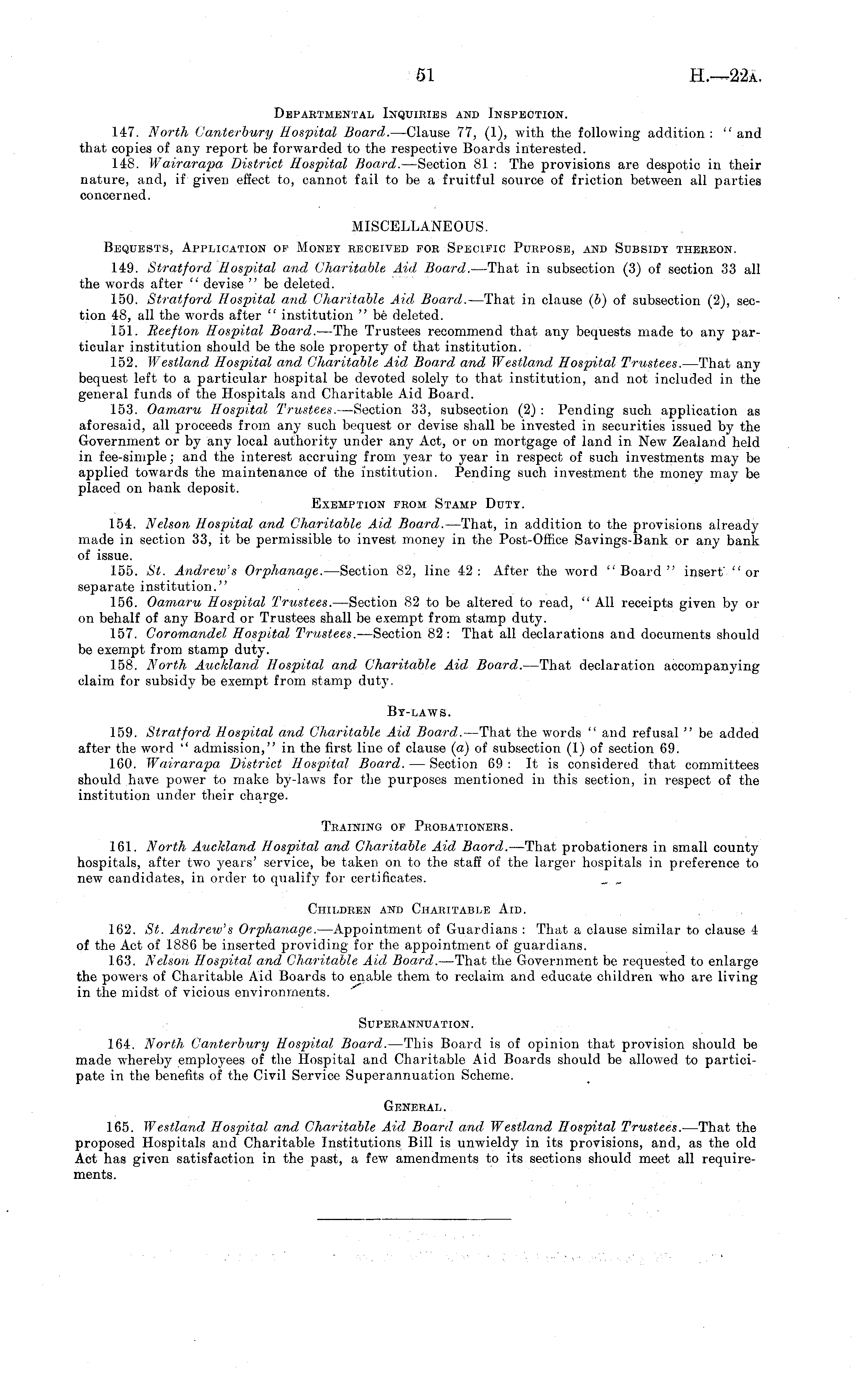 Departmental Inquiries and Inspection. 147. North Canterbury Hospital Board. —Clause 77, (1), with the following addition : " and that copies of any report be forwarded to the respective Boards interested. 148. Wairarapa District Hospital Board. —Section 81 : The provisions are despotic in their nature, and, if given effect to, cannot fail to be a fruitful source of friction between all parties concerned. MISCELLANEOUS. Bequests, Application of Money received for Specific Purpose, and Subsidy thereon. 149. Stratford Hospital and Charitable Aid Board. —That in subsection (3) of section 33 all the words after " devise " be deleted. 150. Stratford Hospital and Charitable Aid Board. —That in clause (b) of subsection (2), section 48, all the words after " institution " be deleted. 151. Reefton Hospital Board. —The Trustees recommend that any bequests made to any particular institution should be the sole property of that institution. 152. Westland Hospital and Charitable Aid Board and Westland Hospital Trustees. —That any bequest left to a particular hospital be devoted solely to that institution, and not included in the general funds of the Hospitals and Charitable Aid Board. 153. Oamaru Hospital Trustees. —Section 33, subsection (2) : Pending such application as aforesaid, all proceeds from any sucri bequest or devise shall be invested in securities issued by the Government or by any local authority under any Act, or on mortgage of land in New Zealand held in fee-simple; and the interest accruing from year to year in respect of such investments may be applied towards the maintenance of the institution. Pending such investment the money may be placed on hank deposit. Exemption from Stamp Duty. 154. Nelson Hospital and Charitable Aid Board. —That, in addition to the provisions alreadymade in section 33, it be permissible to invest money in the Post-Office Savings-Bank or any bank of issue. 155. St. Andrew's Orphanage. —Section 82, line 42: After the word "Board" insert "or separate institution." 156. Oamaru Hospital Trustees. —Section 82 to be altered to read, " All receipts given by or on behalf of any Board or Trustees shall be exempt from stamp duty. 157. Coromandel Hospital Trustees. —Section 82: That all declarations and documents should be exempt from stamp duty. 158. North Auckland Hospital and Charitable Aid Board. —That declaration accompanying claim for subsidy be exempt from stamp dut} 7 . By-laws. 159. Stratford Hospital and Charitable Aid Board. —That the words " and refusal " be added after the word " admission," in the first line of clause (a) of subsection (1) of section 69. 160. Wairarapa District Hospital Board. — Section 69: It is considered that committees should have power to make by-laws for the purposes mentioned in this section, in respect of the institution under their charge. Training of Probationers. 161. North Auckland Hospital and Charitable Aid Baord. —That probationers in small county hospitals, after two years' service, be taken on to the staff of the larger hospitals in preference to new candidates, in order to qualify for certificates. Children and Charitable Aid. 162. St. Andrew's Orphanage. —Appointment of Guardians : That a clause similar to clause 4 of the Act of 1886 be inserted providing for the appointment of guardians. 163. Nelson Hospital and Charitable Aid Board. —That the Government be requested to enlarge the powers of Charitable Aid Boards to enable them to reclaim and educate children who are living in the midst of vicious environments. Superannuation . 164. North Canterbury Hospital Board. —This Board is of opinion that provision should be made whereby employees of the Hospital and Charitable Aid Boards should be allowed to participate in the benefits of the Civil Service Superannuation Scheme. General. 165. Westland Hospital and Charitable Aid Board and Westland Hospital Trustees. —That the proposed Hospitals and Charitable Institutions Bill is unwieldy in its provisions, and, as the old Act has given satisfaction in the past, a few amendments to its sections should meet all requirements.