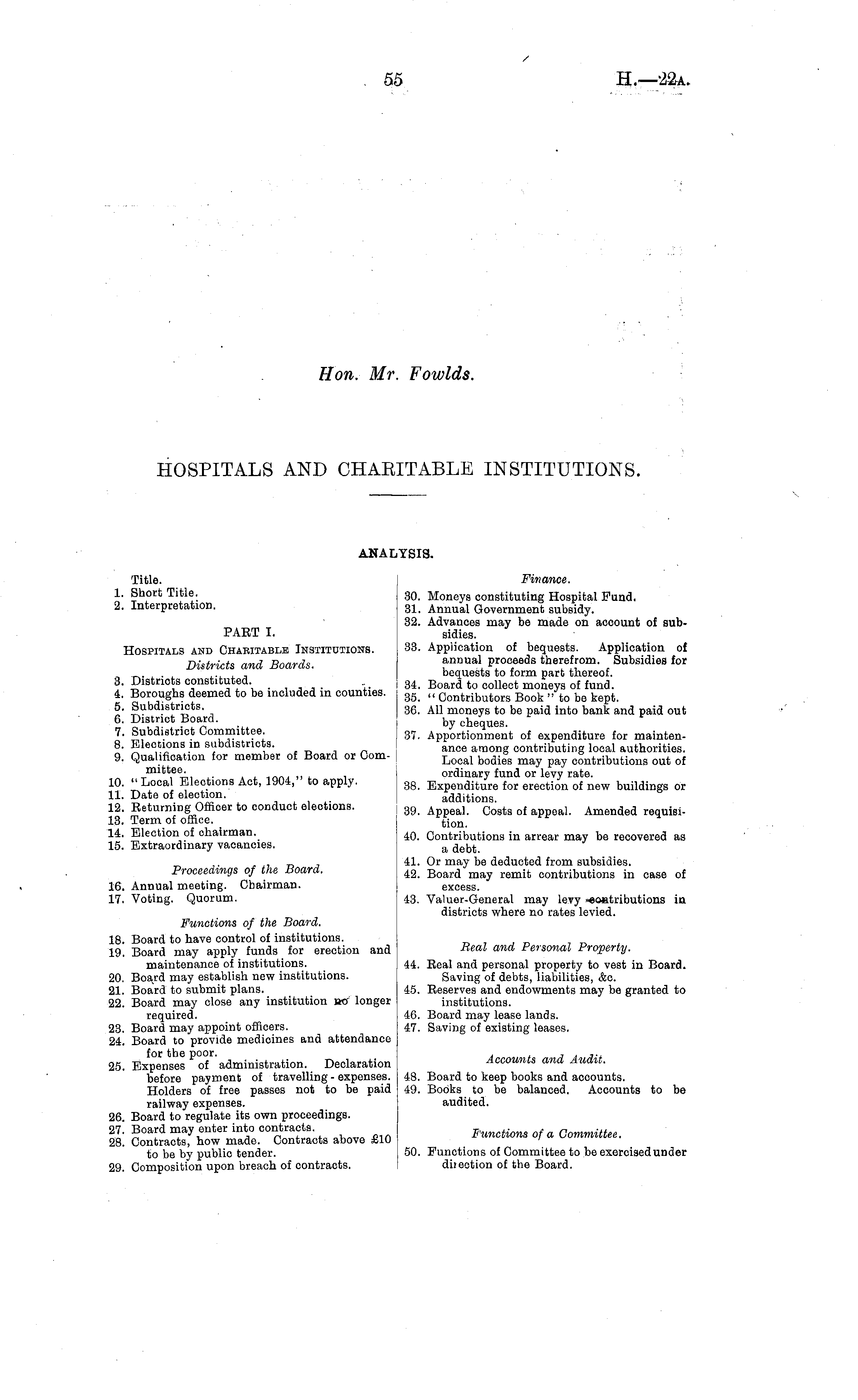 Title. 1. Short Title. 2. Interpretation. PART I. Hospitals and Charitable Institutions. Districts and Boards. 3. Distriots constituted. 4. Boroughs deemed to be included in counties. 5. Subdistricts. 6. District Board. 7. Subdistrict Committee. 8. Elections in subdistricts. 9. Qualification for member of Board or Committee. 10. "Local Elections Act, 1904," to apply. 11. Date of election. 12. Beturning Officer to conduct eleotions. 13. Term of office. 14. Election of chairman. 15. Extraordinary vacancies. Proceedings of the Board. 16. Annual meeting. Chairman. 17. Voting. Quorum. Functions of the Board. 18. Board to have control of institutions. 19. Board may apply funds for erection and maintenance of institutions. 20. Board may establish new institutions. 21. Board to submit plans. 22. Board may close any institution ao longer required. 23. Board may appoint officers. 24. Board to provide medicines and attendance for the poor. 25. Expenses of administration. Declaration before payment of travelling-expenses. Holders of free passes not to be paid railway expenses. 26. Board to regulate its own proceedings. 27. Board may enter into contracts. 28. Contracts, how made. Contracts above £10 to be by public tender. 29. Composition upon breach of contracts.