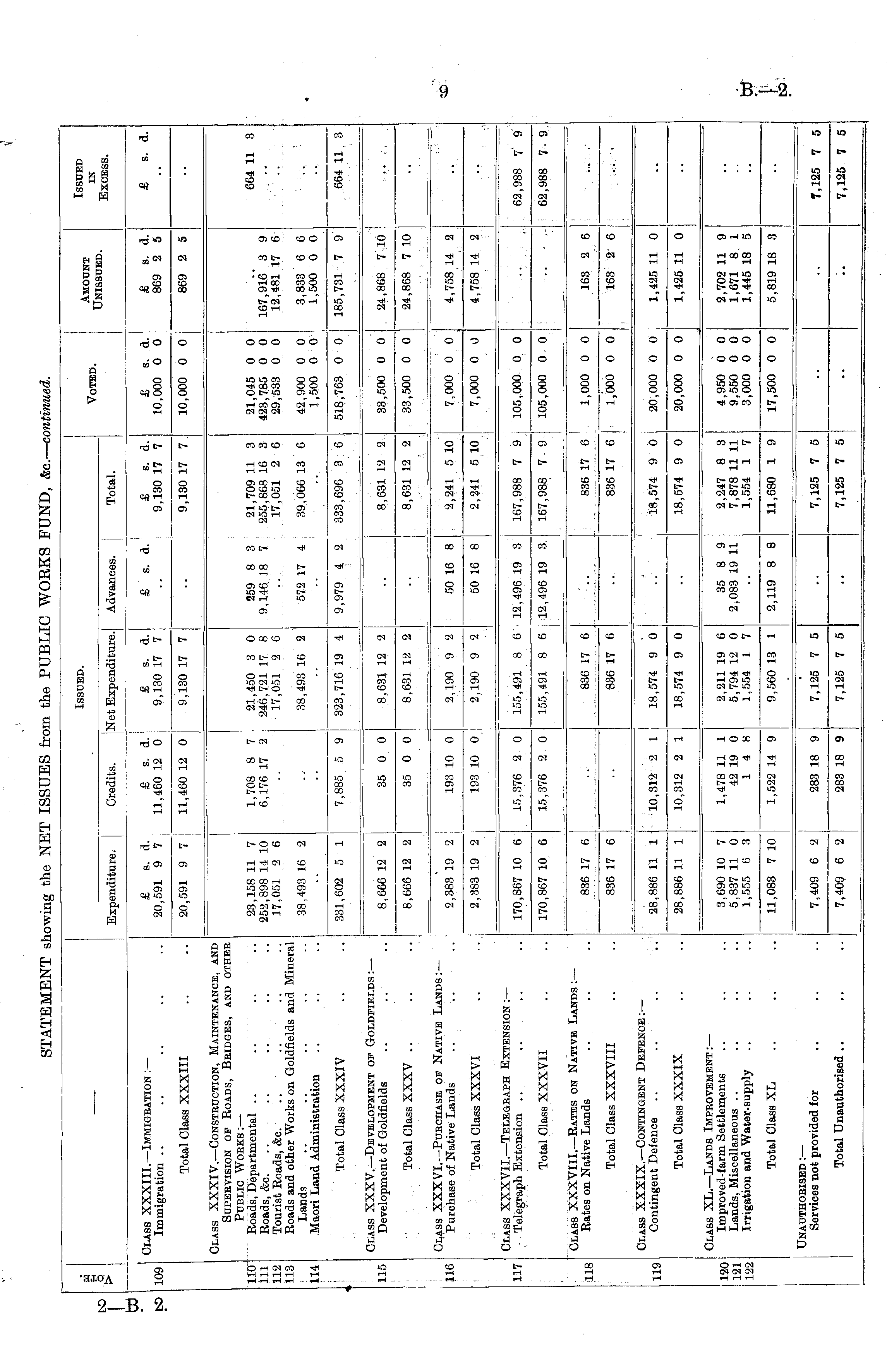 O Expenditure. Issued. Voted. Amount Unissued. Issued in Excess. Credits. Net Expenditure. Advances. Total. Class XXXIII. —Immigration :— Immigration £ s. d. 20,591 9 7 £ s. d. 11,460 12 0 j £ s. d. 9,130 17 7 £ s. d. £ s. d. 9,130 17 7 £ s. d. 10,000 0 0 £ s. d. 869 2 5 & s. a. 109 Total Class XXXIII 20,591 9 7 11,460 12 0 9,130 17 7 9,130 17 7. 10,000 0 0 869 2 5 110 111 112 113 Class XXXIV. —Construction, Maintenance, and Supervision of Roads, Bridges, and other Public Works: — Roads, Departmental Roads, &c. Tourist Roads, &c. Roads and other Works on Goldfields and Mineral Lands Maori Land Administration 23,158 11 7 252,898 14 10 17,051 2 6 1,708 8 7 6,176 17 2 21,450 3 0 246,721 17 8 17,051 2 6 259 8 3 9,146 18 7 21,709 11 3 255,868 16 3 17,051 2 6 21,045 0 0 423,785 0 0 29,533 0 0 167,916' 3 9 12,481 17 6 664 11 3 •• 38,493 16 2 38,493 16 2 572 17 4 39,066 13 6 42,900 0 0 1,500 0 0 3,833 6 6 1,500 0 0 114 - - - Total Class XXXIV ; 331,602 5 1 j 7,885 5 9 323,716 19 4 185,731 7 9 9,979 4 2 333,696 3 6 518,763 0 0 664 11 3 115 Class XXXV. —Development of Goldfields: — Development of Goldfields .. .. .. 8,666 12 2 35 0 0 8,631 12 2 8,631 12 2 33,500 0 0 24,868 7 10 Total Class XXXV .. 8,666 12 2 35 0 0 8,631 12 2 8,631 12 2 33,500 0 0 24,868 7 10 116 Class XXXVI. —Purchase of Native Lands: — Purchase of Native Lands 2,383 19 2 I 193 10 0 2,190 9 2 50 16 8 2,241 5 10 7,000 0 0 4,758 14 2 2,383 19 2 193 10 0 2,190 9 2 Total Class XXXVI .. ., 50 16 8 2,241 5 10 7,000 0 0 4,758 14 2 117 Class XXXVII. —Telegraph Extension :— Telegraph Extension 170,867 10 6 15,376 2 0 155,491 8 6 12,496 19 3 167,988 7 9 105,000 0 0 62,988 7 9 Total Class XXXVII 170,867 10 6 15,376 2 0 155,491 8 6 12,496 19 3 167,988 7 9 105,000 0 0 62,988 7- 9 118 Class XXXVIII. —Rates on Native Lands :— Rates on Native Lands 836 17 6 836 17 6 836 17 6 1,000 0 0 163 2 6 Total Class XXXVIII 836 17 6 836 17 6 836 17 6 1,000 0 0 163 2 6 Class XXXIX.— Contingent Defence: — Contingent Defence 18,574 9 0 119 28,886 11 1 10,312 2 1 18,574 9 0 20,000 0 0 1,425 11 0 Total Class XXXIX : 28,886 11 1 10,312 2 1 18,574 9 0 18,574 9 0 20,000 0 0 1,425 11 0 120 121 122 Class XL. —Lands Improvement: — Improved-farm Settlements Lands, Miscellaneous Irrigation and Water-supply 3,690 10 7 5,837 11 0 1,555 6 3 1,478 11 1 42 19 0 14 8 2,211 19 6 5,794 12 0 1,554 1 7 35 8 9 2,083 19 11 2,247 8 3 7,878 11 11 1,554 1 7 4,950 0 0 9,550 0 0 3,000 0 0 2,702 11 9 1,671 8 1 1,445 18 5 Total Class XL 11,083 7 10 1,522 14 9 9,560 13 1 2,119 8 8 11,680 1 9 17,500 0 0 5,819 18 3 l | Unauthorised :— Services not provided for 7,125 7 5 7,409 6 2 283 18 9 7,125 7 5 7,125 7 5 Total Unauthorised 7,409 6 2 283 18 9 7,125 7 5 7,125 7 5 7,125 7 5