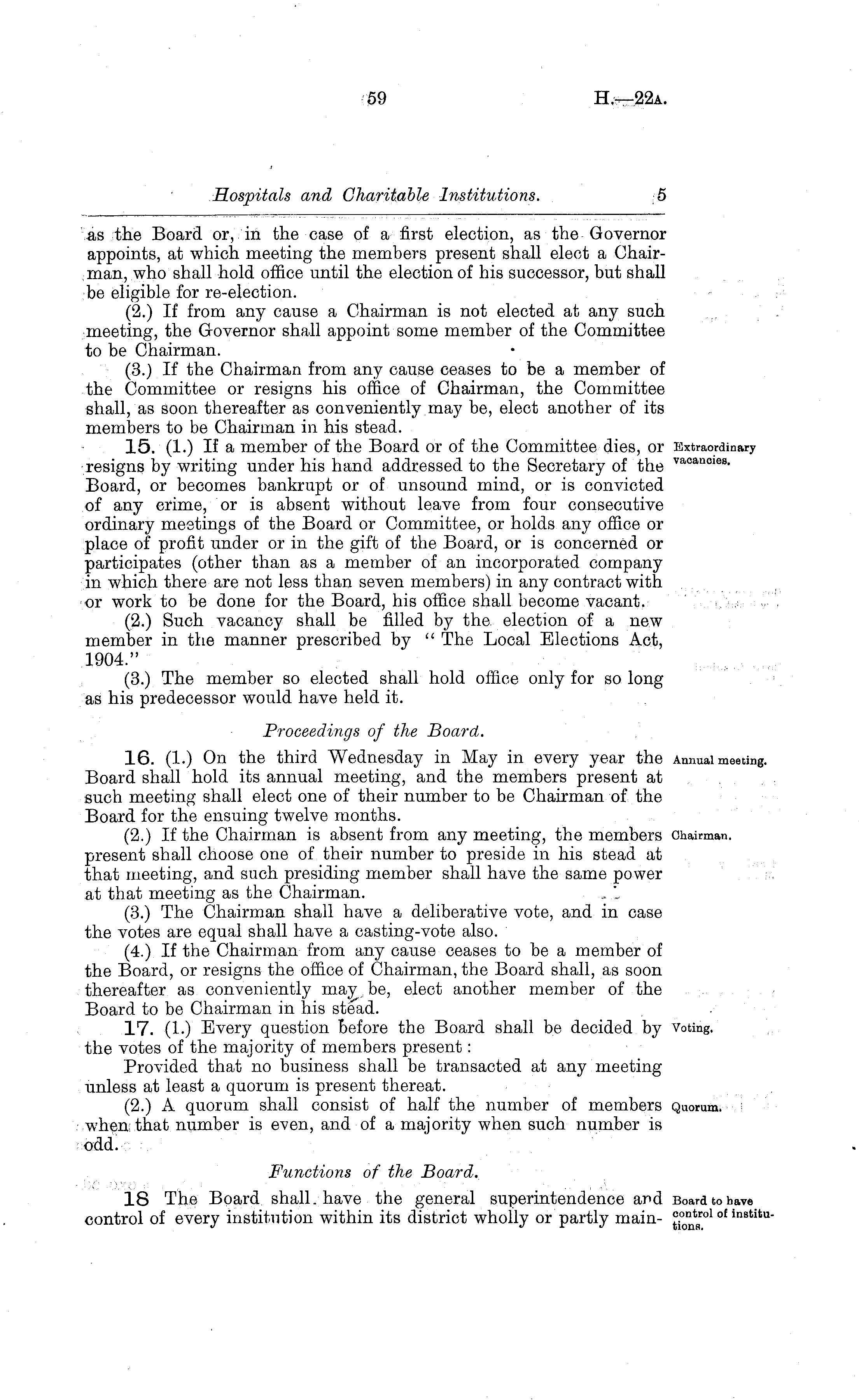 as the Board or, in the case of a first election, as the Governor appoints, at which meeting the members present shall elect a Chairman, who shall hold office until the election of his successor, but shall be eligible for re-election. (2.) If from any cause a Chairman is not elected at any such meeting, the Governor shall appoint some member of the Committee to be Chairman. (3.) If the Chairman from any cause ceases to be a member of the Committee or resigns his office of Chairman, the Committee shall, as soon thereafter as conveniently may be, elect another of its members to be Chairman in his stead. 15. (1.) If a member of the Board or of the Committee dies, or resigns by writing under his hand addressed to the Secretary of the Board, or becomes bankrupt or of unsound mind, or is convicted of any crime, or is absent without leave from four consecutive ordinary meetings of the Board or Committee, or holds any office or place of profit under or in the gift of the Board, or is concerned or participates (other than as a member of an incorporated company in which there are not less than seven members) in any contract with or work to be done for the Board, his office shall become vacant. (2.) Such vacancy shall be filled by the election of a new member in the manner prescribed by " The Local Elections Act, 1904." (3.) The member so elected shall hold office only for so long as his predecessor would have held it. Proceedings of the Board. 16. (1.) On the third Wednesday in May in every year the Board shall hold its annual meeting, and the members present at such meeting shall elect one of their number to be Chairman of the Board for the ensuing twelve months. (2.) If the Chairman is absent from any meeting, the members present shall choose one of their number to preside in his stead at that meeting, and such presiding member shall have the same power at that meeting as the Chairman. (3.) The Chairman shall have a deliberative vote, and in case the votes are equal shall have a casting-vote also. (4.) If the Chairman from any cause ceases to be a member of the Board, or resigns the office of Chairman, the Board shall, as soon thereafter as conveniently may be, elect another member of the Board to be Chairman in his stead. 17. (1.) Every question before the Board shall be decided by the votes of the majority of members present: Provided that no business shall be transacted at any meeting unless at least a quorum is present thereat. (2.) A quorum shall consist of half the number of members when that number is even, and of a majority when such number is odd. Functions of the Board. 18 The Board shall, have the general superintendence and control of every institution within its district wholly or partly main-
