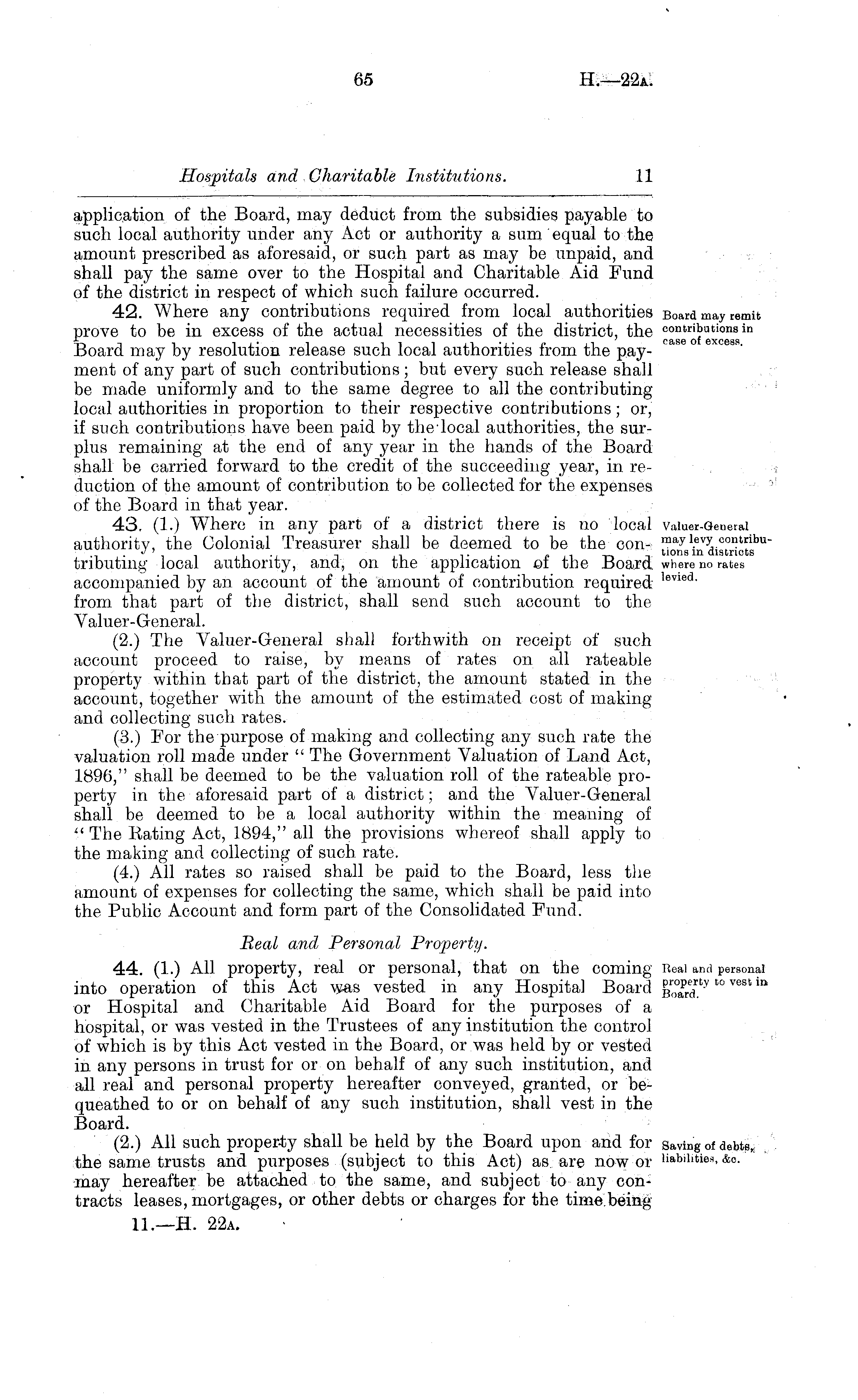application of the Board, may deduct from the subsidies payable to such local authority under any Act or authority a sum equal to the amount prescribed as aforesaid, or such part as may be unpaid, and shall pay the same over to the Hospital and Charitable Aid Fund of the district in respect of which such failure occurred. 42. Where any contributions required from local authorities prove to be in excess of the actual necessities of the district, the Board may by resolution release such local authorities from the payment of any part of such contributions ; but every such release shall be made uniformly and to the same degree to all the contributing local authorities in proportion to their respective contributions; or, if such contributions have been paid by the local authorities, the surplus remaining at the end of any year in the hands of the Board shall be carried forward to the credit of the succeeding year, in reduction of the amount of contribution to be collected for the expenses of the Board in that year. 43. (1.) Where in any part of a district there is no local authority, the Colonial Treasurer shall be deemed to be the contributing local authority, and, on the application of the Board accompanied by an account of the amount of contribution required from that part of the district, shall send such account to the Valuer-General. (2.) The Valuer-General shall forthwith on receipt of such account proceed to raise, by means of rates on all rateable property within that part of the district, the amount stated in the account, together with the amount of the estimated cost of making and collecting such rates. (3.) For the purpose of making and collecting any such rate the valuation roll made under " The Government Valuation of Land Act, 1896," shall be deemed to be the valuation roll of the rateable property in the aforesaid part of a district; and the Valuer-General shall be deemed to be a local authority within the meaning of " The Rating Act, 1894," all the provisions whereof shall apply to the making and collecting of such rate. (4.) All rates so raised shall be paid to the Board, less the amount of expenses for collecting the same, which shall be paid into the Public Account and form part of the Consolidated Fund. Real and Personal Property. A4l. (1.) All property, real or personal, that on the coming into operation of this Act was vested in any Hospital Board or Hospital and Charitable Aid Board for the purposes of a hospital, or was vested in the Trustees of any institution the control of which is by this Act vested in the Board, or was held by or vested in any persons in trust for or on behalf of any such institution, and all real and personal property hereafter conveyed, granted, or bequeathed to or on behalf of any such institution, shall vest in the Board. (2.) All such property shall be held by the Board upon and for the same trusts and purposes (subject to this Act) as are now or may hereafter be attached to the same, and subject to any contracts leases, mortgages, or other debts or charges for the time being