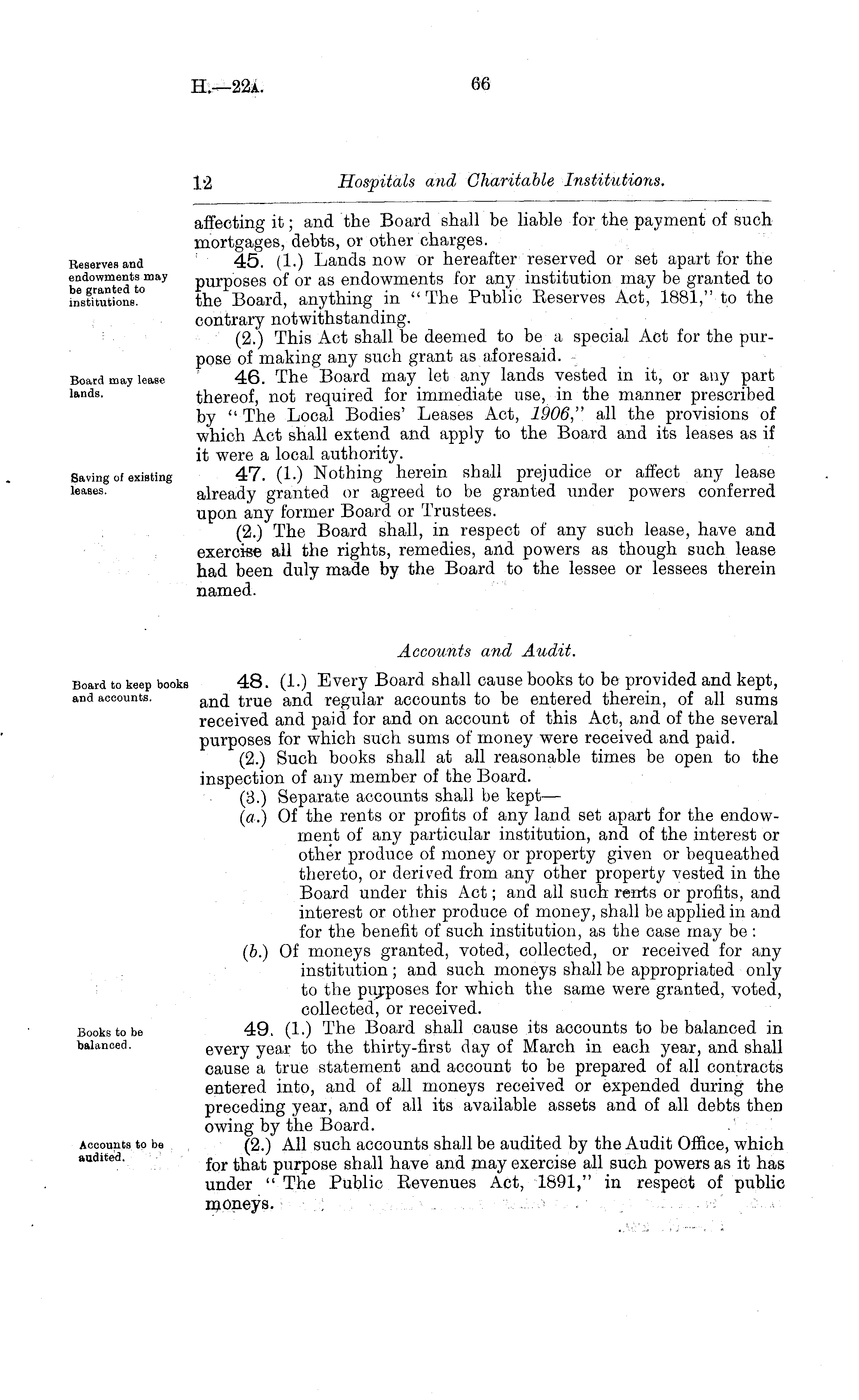 Accounts and Audit. 48. (1.) Every Board shall cause books to be provided and kept, and true and regular accounts to be entered therein, of all sums received and paid for and on account of this Act, and of the several purposes for which such sums of money were received and paid. (2.) Such books shall at all reasonable times be open to the inspection of any member of the Board. (3.) Separate accounts shall be kept— (a.) Of the rents or profits of any land set apart for the endowment of any particular institution, and of the interest or other produce of money or property given or bequeathed thereto, or derived from any other property vested in the Board under this Act; and all such rents or profits, and interest or other produce of money, shall be applied in and for the benefit of such institution, as the case may be : (b.) Of moneys granted, voted, collected, or received for any institution; and such moneys shall be appropriated only to the purposes for which the same were granted, voted, collected, or received. 49. (1.) The Board shall cause its accounts to be balanced in every year to the thirty-first day of March in each year, and shall cause a true statement and account to be prepared of all contracts entered into, and of all moneys received or expended during the preceding year, and of all its available assets and of all debts then owing by the Board. (2.) All such accounts shall be audited by the Audit Office, which for that purpose shall have and may exercise all such powers as it has under " The Public Revenues Act, 1891," in respect of public moneys. -~;.-; . -