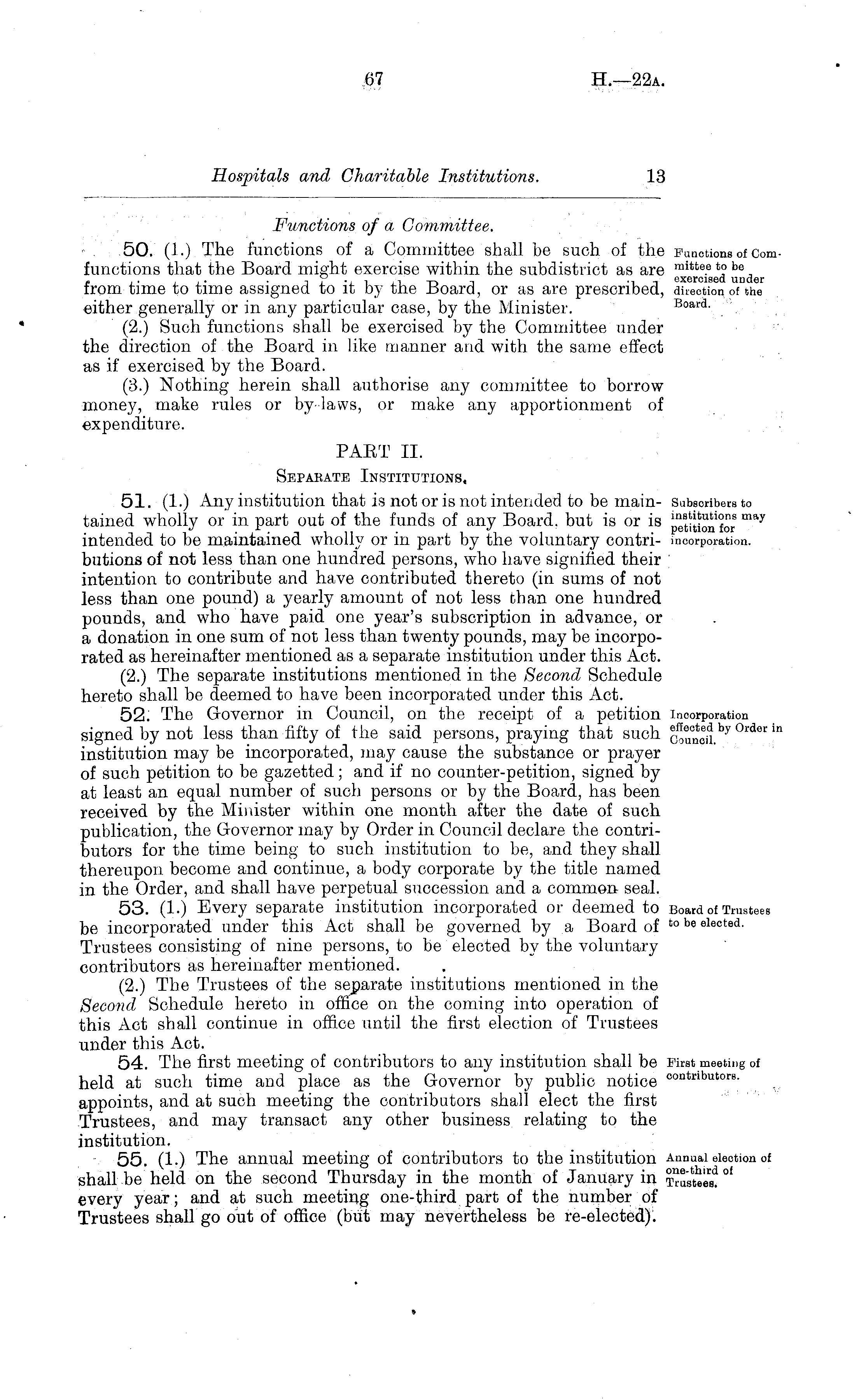 Functions of a Committee. 50. (1.) The functions of a Committee shall be such of the functions that the Board might exercise within the subdistrict as are from time to time assigned to it by the Board, or as are prescribed, either generally or in any particular case, by the Minister. (2.) Such functions shall be exercised by the Committee under the direction of the Board in like manner and with the same effect as if exercised by the Board. (3.) Nothing herein shall authorise any committee to borrow money, make rules or by-laws, or make any apportionment of expenditure. PART 11. Separate Institutions, 51. (1.) Any institution that is not or is not intended to be maintained wholly or in part out of the funds of any Board, but is or is intended to be maintained wholly or in part by the voluntary contributions of not less than one hundred persons, who have signified their intention to contribute and have contributed thereto (in sums of not less than one pound) a yearly amount of not less than one hundred pounds, and who have paid one year's subscription in advance, or a donation in one sum of not less than twenty pounds, may be incorporated as hereinafter mentioned as a separate institution under this Act. (2.) The separate institutions mentioned in the Second Schedule hereto shall be deemed to have been incorporated under this Act. 52; The Governor in Council, on the receipt of a petition signed by not less than fifty of the said persons, praying that such institution may be incorporated, may cause the substance or prayer of such petition to be gazetted; and if no counter-petition, signed by at least an equal number of such persons or by the Board, has been received by the Minister within one month after the date of such publication, the Governor may by Order in Council declare the contributors for the time being to such institution to be, and they shall thereupon become and continue, a body corporate by the title named in the Order, and shall have perpetual succession and a common seal. 53. (1.) Every separate institution incorporated or deemed to be incorporated under this Act shall be governed by a Board of Trustees consisting of nine persons, to be elected by the voluntary contributors as hereinafter mentioned. (2.) The Trustees of the separate institutions mentioned in the Second Schedule hereto in office on the coming into operation of this Act shall continue in office until the first election of Trustees under this Act. 54. The first meeting of contributors to any institution shall be held at such time and place as the Governor by public notice ' appoints, and at such meeting the contributors shall elect the first Trustees, and may transact any other business relating to the institution. 55. (1.) The annual meeting of contributors to the institution shall be held on the second Thursday in the month of January in I every year; and at such meeting one-third part of the number of Trustees shall go out of office (but may nevertheless be re-elected).