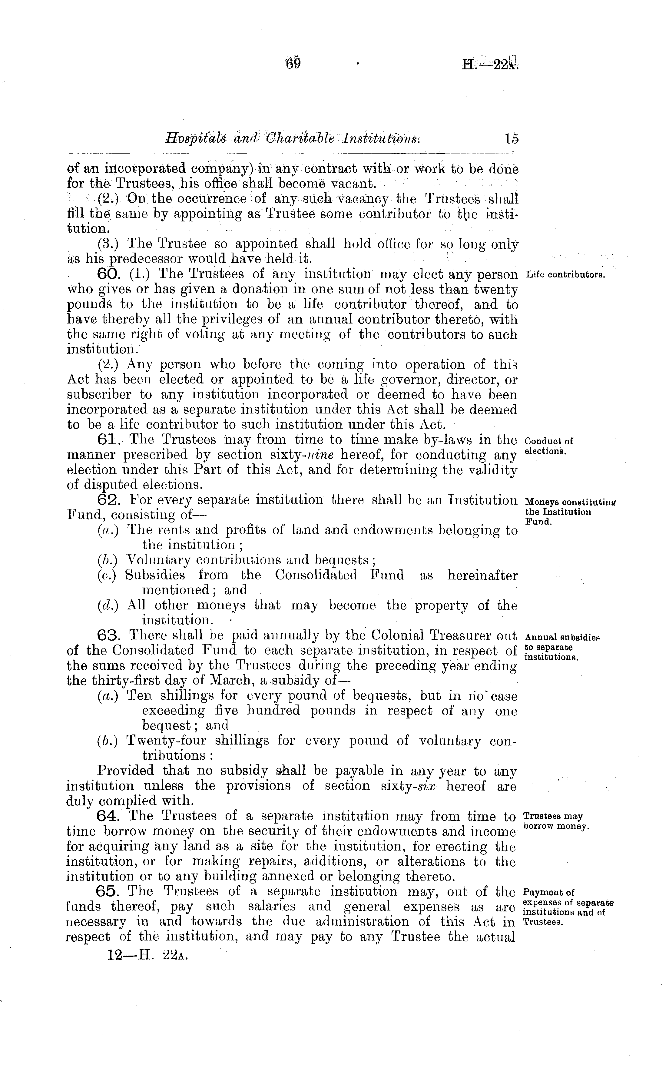 of an incorporated company) in any contract with or w r ork to be done for the Trustees, his office shall become vacant. (2.) On the occurrence of any such vacancy the Trustees shall fill the same by appointing as Trustee some contributor to the institution. (3.) The Trustee so appointed shall hold office for so long only as his predecessor would have held it. 60. (1.) The Trustees of any institution may elect any person who gives or has given a donation in one sum of not less than twenty pounds to the institution to be a life contributor thereof, and to have thereby all the privileges of an annual contributor thereto, with the same right of voting at any meeting of the contributors to such institution. (2.) Any person who before the coming into operation of this Act has been elected or appointed to be a life governor, director, or subscriber to any institution incorporated or deemed to have been incorporated as a separate institution under this Act shall be deemed to be a life contributor to such institution under this Act. 61. The Trustees may from time to time make by-laws in the manner prescribed by section sixty- nine hereof, for conducting any election under this Part of this Act, and for determining the validity of disputed elections. 62. For every separate institution there shall be an Institution Fund, consisting of— (a.) The rents and profits of land and endowments belonging to the institution ; (b.) Voluntary contributions and bequests; (c.) Subsidies from the Consolidated Fund as hereinafter mentioned; and (d.) All other moneys that may become the property of the institution. 63. There shall be paid annually by the Colonial Treasurer out of the Consolidated Fund to each separate institution, in respect of the sums received by the Trustees during the preceding year ending the thirty-first day of March, a subsidy of— (a.) Ten shillings for every pound of bequests, but in no case exceeding five hundred pounds in respect of any one bequest; and (6.) Twenty-four shillings for every pound of voluntary contributions : Provided that no subsidy shall be payable in any year to any institution unless the provisions of section sixty-six hereof are duly complied with. 64. The Trustees of a separate institution may from time to time borrow money on the security of their endowments and income for acquiring any land as a site for the institution, for erecting the institution, or for making repairs, additions, or alterations to the institution or to any building annexed or belonging thereto. 65. The Trustees of a separate institution may, out of the funds thereof, pay such salaries and general expenses as are necessary in and towards the due administration of this Act in respect of the institution, and may pay to any Trustee the actual