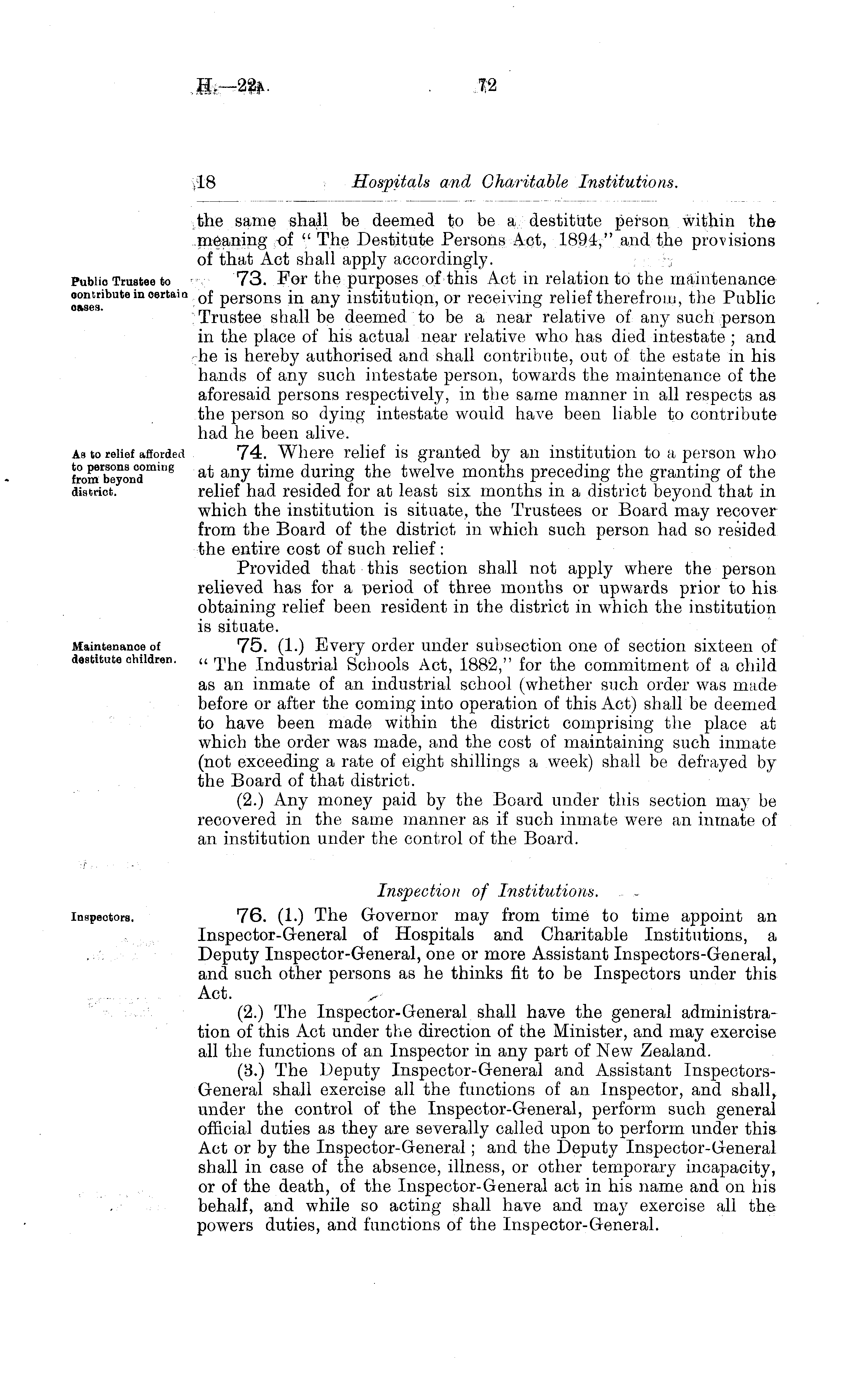 the same shall be deemed to be a destitute person within the meaning of " The Destitute Persons Act, 1894," and the provisions of that Act shall apply accordingly. 73. For the purposes of this Act in relation to the maintenance of persons in any institution, or receiving relief therefrom, the Public Trustee shall be deemed to be a near relative of any such person in the place of his actual near relative who has died intestate ; and he is hereby authorised and shall contribute, out of the estate in his hands of any such intestate person, towards the maintenance of the aforesaid persons respectively, in the same manner in all respects as the person so dying intestate would have been liable to contribute had he been alive. 74. Where relief is granted by an institution to a person who at any time during the twelve months preceding the granting of the relief had resided for at least six months in a district beyond that in which the institution is situate, the Trustees or Board may recover from the Board of the district in which such person had so resided the entire cost of such relief : Provided that this section shall not apply where the person relieved has for a period of three months or upwards prior to his obtaining relief been resident in the district in which the institution is situate. 75. (1.) Every order under subsection one of section sixteen of " The Industrial Schools Act, 1882," for the commitment of a child as an inmate of an industrial school (whether such order was made before or after the coming into operation of this Act) shall be deemed to have been made within the district comprising the place at which the order was made, and the cost of maintaining such inmate (not exceeding a rate of eight shillings a week) shall be defrayed by the Board of that district. (2.) Any money paid by the Board under this section may Ire recovered in the same manner as if such inmate were an inmate of an institution under the control of the Board. Inspection of Institutions. 76. (1.) The Governor may from time to time appoint an Inspector-General of Hospitals and Charitable Institutions, a Deputy Inspector-General, one or more Assistant Inspectors-General, and such other persons as he thinks fit to be Inspectors under this Act. (2.) The Inspector-General shall have the general administration of this Act under the direction of the Minister, and may exercise all the functions of an Inspector in any part of New Zealand. (3.) The Deputy Inspector-General and Assistant InspectorsGeneral shall exercise all the functions of an Inspector, and shall, under the control of the Inspector-General, perform such general official duties as they are severally called upon to perform under this Act or by the Inspector-General; and the Deputy Inspector-General shall in case of the absence, illness, or other temporary incapacity, or of the death, of the Inspector-General act in his name and on his behalf, and while so acting shall have and may exercise all the powers duties, and functions of the Inspector-General.