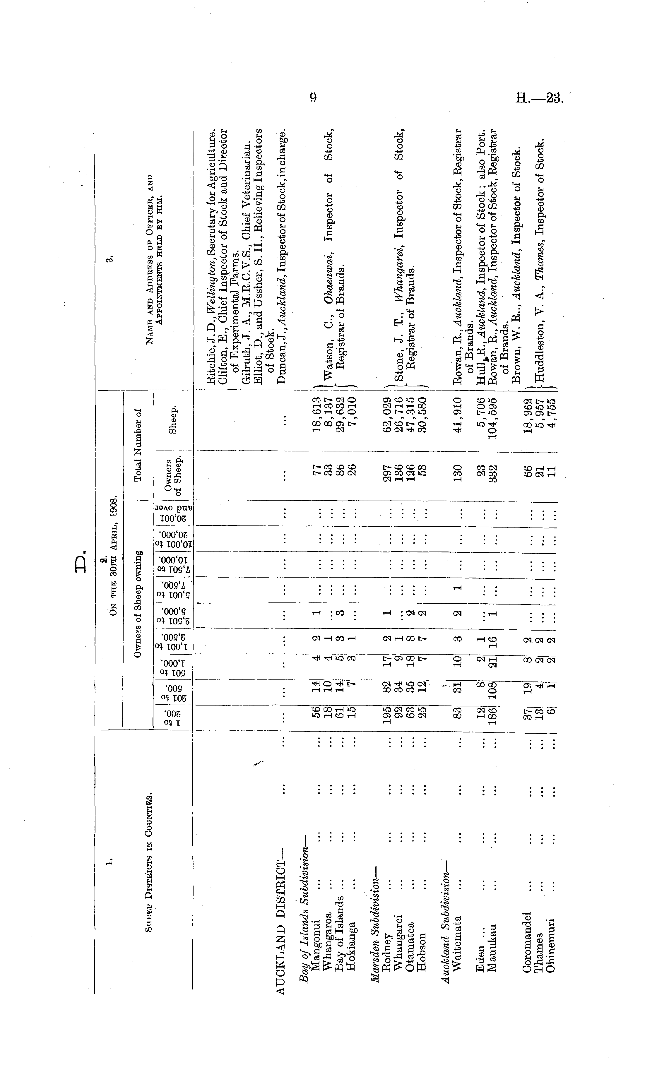 1. 2. On the 30th April, 1908. 3. Sheep Districts in Counties. Owners of Sheep owning Total Number of Name and Address of Officer, and Appointments held by him. -So o hH CM o *d CM -So *C rH O r-H O r-T CT o O o o IO -So iO o o r-l O O O O CM rH tH i § o j Owners o"ro I of Sheep. oi fl eS Sheep. \ Ritchie, J. D., Wellington, Secretary for Agriculture. Clifton, E., Chief Inspector of Stock and Director of Experimental Farms. Gilrutb, J. A., M.E.C.V.S., Chief Veterinarian. Elliot, D., and Ussher, S. H., Believing Inspectors of Stock. Duncan, J., Auckland, Inspector of Stock, in charge. UCKLAND DISTEICT— Bay of Islands Subdivision — Mangonui Whangaroa Bay of Islands ... Hokianga 56 18 61 15 14 10 14 7 4 4 5 3 2 1 3 1 1 3 77 33 86 26 18,613 8,137 29,632 7,010 1 Watson, C, Ohaeawai, Inspector of Stock, Eegistrar of Brands. Marsden Subdivision — Eodney Whangarei Otamatea Hobson 195 92 63 25 82 34 35 12 17 18 7 2 1 8 7 1 "2 2 297 136 126 53 62,029 26,716 47,315 30,580 Stone, J. T., Whangarei, Inspector of Stock, [ Eegistrar of Brands. Auckland Subdivision — Waitemata 31 130 41,910 Eowan, 'R., Auckland, Inspector of Stock, Eegistrar of Brands. Hull k B., Auckland, Inspector of Stock; also Port. Eowan, E., Auckland, Inspector of Stock, Eegistrar of Brands. Brown, W. E.., Auckland, Inspector of Stock. 83| 10 3 1 Eden ... Manukau ... ... 12 186 8 108 2 21 1 16 1 23 332 5,706 104,595 Coromandel Thames Ohinemuri 37; 13 1 61 19! 4 ; 1 8 : 2 2 2 2 66 21 11 18,962 5,957 4,755 [■Huddleston, V. A., Thames, Inspector of Stock.