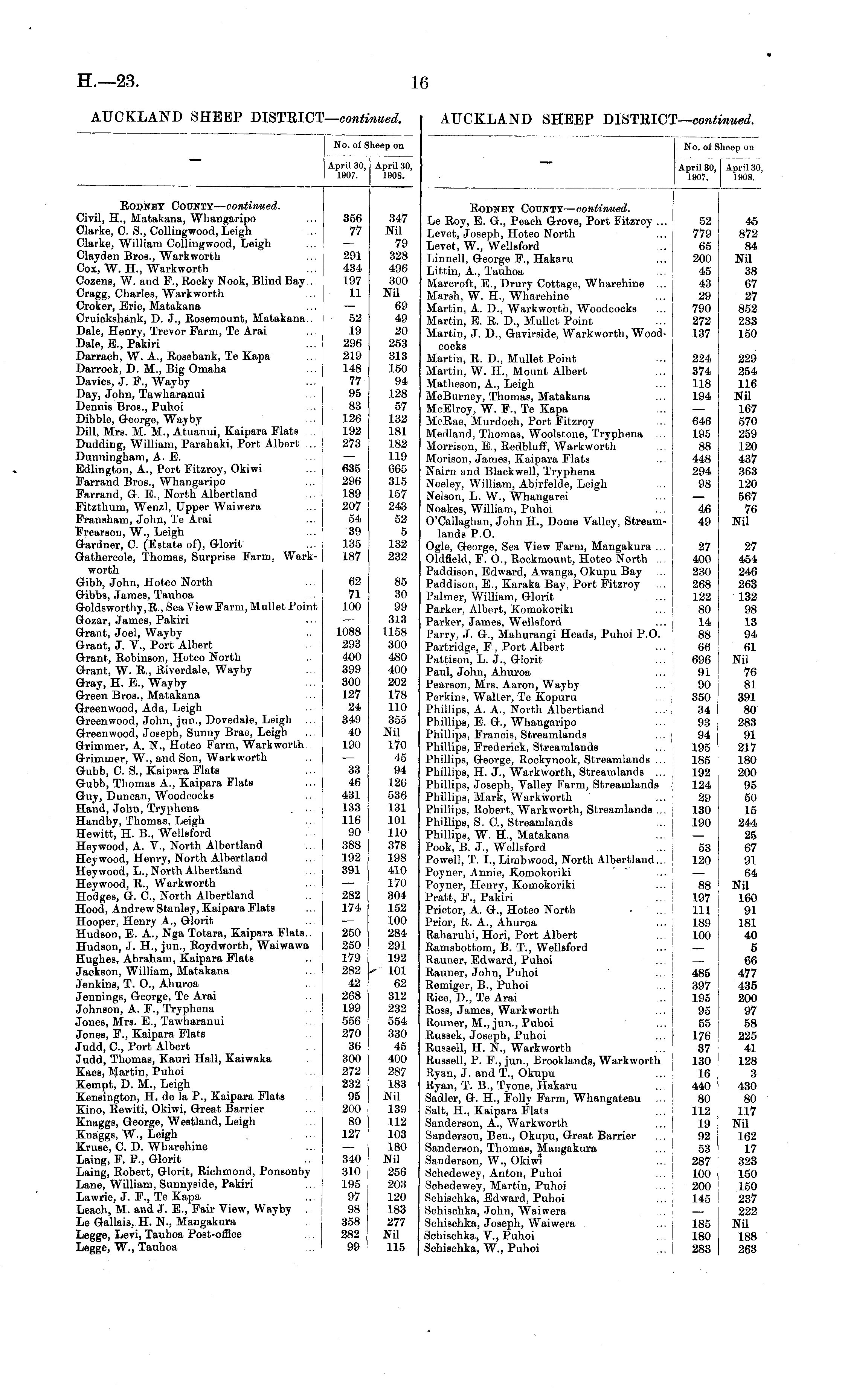 No. of Sheep on April 30, April 30, 1907. 1908. Rodney County— continued. Civil, H., Matakana, Whangaripo Clarke, C. S., Collingwood, Leigh Clarke, William Collingwood, Leigh Clayden Bros., Warkworth Cox, W. H., Warkworth Cozens, W. and F., Roeky Nook, Blind Bay... Cragg, Charles, Warkworth Croker, Eric, Matakana Cruickshank, D. J., Rosemount, Matakana.. Dale, Henry, Trevor Farm, Te Arai Dale, E., Pakiri Darrach, W. A., Rosebank, Te Kapa Darrock, D. M., Big Omaha Davies, J. F., Wayby Day, John, Tawharanui Dennis Bros., Puhoi Dibble, George, Wayby Dill, Mrs. M. M., Atuanui, Kaipara Flats ... Dudding, William, Parahaki, Port Albert ... Dunningham, A. E. Edlington, A., Port Fitzroy, Okiwi Farrand Bros., Whangaripo Farrand, G. E., North Albertland Fitzthum, Wenzl, Upper Waiwera Fransham, John, Te Arai Frearson, W., Leigh Gardner, C. (Estate of), Glorit Gathercole, Thomas, Surprise Farm, Warkworth Gibb, John, Hoteo North Gibbs, James, Tauhoa Goldsworthy.R., Sea View Farm, Mullet Point Gozar, James, Pakiri Grant, Joel, Wayby Grant, J. V., Port Albert Grant, Robinson, Hoteo North Grant, W. R., Riverdale, Wayby Gray, H. E., Wayby Green Bros., Matakana Greenwood, Ada, Leigh Greenwood, John, jun., Dovedale, Leigh ... Greenwood, Joseph, Sunny Brae, Leigh Grimmer, A. N., Hoteo Farm, Warkworth. Grimmer, W., and Son, Warkworth Gubb, C. S., Kaipara Flats Gubb, Thomas A., Kaipara FlatB Guy, Duncan, Woodcocks Hand, John, Tryphena . .. Handby, Thomas, Leigh Hewitt, H. B„ Wellsford Heywood, A. V., North Albertland Heywood, Henry, North Albertland Heywood, L., North Albertland Heywood, R., Warkworth Hodges, G. O, North Albertland Hood, Andrew Stanley, Kaipara Flats Hooper, Henry A., Glorit Hudson, E. A., Nga Totara, Kaipara Flats.. Hudson, J. H., jun., Roydworth, Waiwawa Hughes, Abraham, Kaipara Flats Jackson, William, Matakana Jenkins, T. O., Ahuroa Jennings, George, Te Arai Johnson, A. F., Tryphena Jones, Mrs. E., Tawharanui Jones, F., Kaipara Flats Judd, O, Port Albert Judd, Thomas, Kauri Hall, Kaiwaka Kaes, Martin, Puhoi Kempt, D. M., Leigh Kensington, H. de la P., Kaipara Flats Kino, Rewiti, Okiwi, Great Barrier Knaggs, George, Westland, Leigh Knaggs, W., Leigh Kruse, C. D. Wharehine Laing, F. P., Glorit Laing, Robert, Glorit, Richmond, Ponsonby Lane, William, Sunnyside, Pakiri Lawrie, J. F., Te Kapa Leach, M. and J. E., Fair View, Wayby . Le Gallais, H. N., Mangakura Legge, Levi, Tauhoa Post-office Legge, W., Tauhoa 356 77 291 434 197 11 52 19 296 219 148 77 95 83 126 192 273 635 296 189 207 54 39 135 187 62 71 100 1088 293 400 399 300 127 24 349 40 190 347 Nil 79 328 496 300 Nil 69 49 20 253 313 150 94 128 57 132 181 182 119 665 315 157 243 52 5 132 232 85 30 99 313 1158 300 480 400 202 178 110 355 Nil 170 45 94 126 536 131 101 110 378 198 410 170 304 152 100 284 291 192 101 62 312 232 554 330 45 400 287 183 Nil 139 112 103 180 Nil 256 203 120 183 277 Nil 115 33 46 431 133 116 90 388 192 391 282 174 250 250 179 282 42 268 199 556 270 36 300 272 232 95 200 80 127 340 310 195 97 98 358 282 99