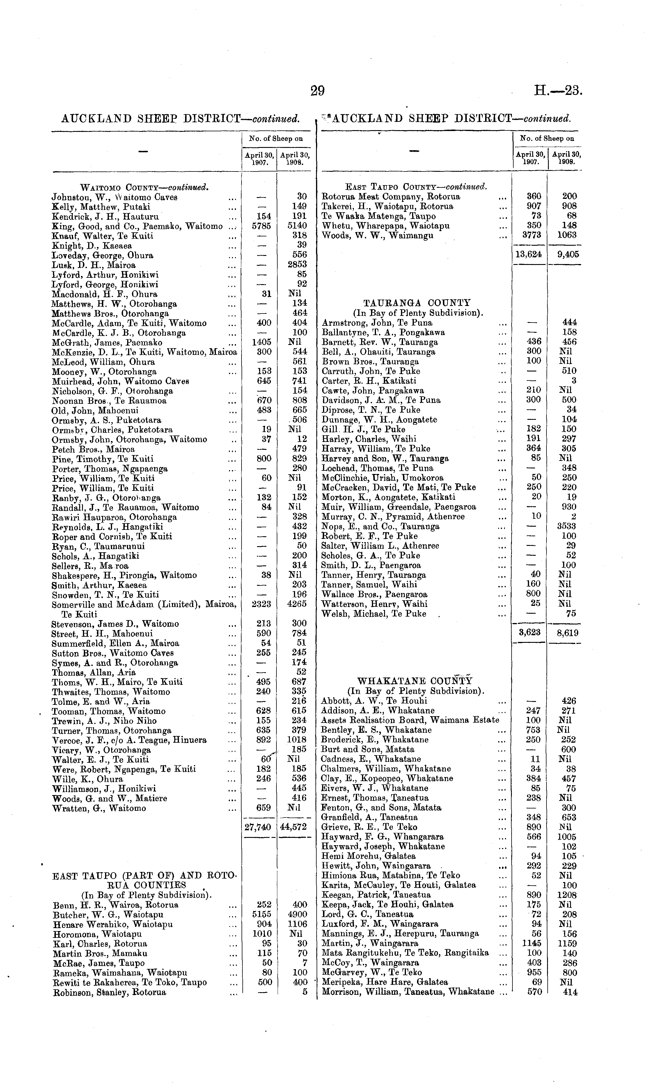 No. of Sheep on April 30, April 30, 1907. 1908. East Taupo County— continued. Rotorua Meat Company, Rotorua Takerei, H., Waiotapu, Rotorua Te Waaka Matenga, Taupo Whetu, Wharepapa, Waiotapu Woods, W. W., Waimangu 360 907 73 350 3773 200 908 68 148 1063 TAURANGA COUNTY (In Bay of Plenty Subdivision). Armstrong, John, Te Puna Ballantyne, T. A., Pongakawa Barnett, Rev. W., Tauranga Bell, A., Ohauiti, Tauranga Brown Bros., Tauranga Carruth, John, Te Puke Carter, R. H., Katikati Cawte, John, Pangakawa Davidson, J. A. M., Te Puna Diprose, T. N., Te Puke Dunnage, W. H., Aongatete Gill H. J., Te Puke Harley, Charles, Waihi Harray, William, Te Puke Harvey and Son, W., Tauranga Lochead, Thomas, Te Puna McClinchie, Uriah, Umokoroa McCracken, David, Te Mati, Te Puke Morton, K., Aongatete, Katikati Muir, William, Greendale, Paengaroa Murray, C. N., Pyramid, Athenree Nops, E., and Co., Tauranga Robert, E. F., Te Puke Salter, William L., Athenree Scholes, G. A., Te Puke Smith, D. L., Paengaroa Tanner, Henry, Tauranga Tanner, Samuel, Waihi Wallace Bros., Paengaroa Watterson, Henrv, Waihi Welsh, Michael, Te Puke 13,624 9,405 436 300 100 2i0 300 182 191 364 85 444 158 456 Nil Nil 510 3 Nil 500 34 104 150 297 305 Nil 348 250 220 19 930 2 3533 100 29 52 100 Nil Nil Nil Nil 75 50 250 20 10 40 160 800 25 3,623 8,619 WHAKATANE COUNTY (In Bay of Plenty Subdivision). Abbott, A. W., Te Houhi Addison, A. B., Whakatane Assets Realisation Board, Waimana Estate Bentley, E. S., Whakatane Broderick, E., Whakatane Burt and Sons, Matata Cadness, E., Whakatane Chalmers, William, Whakatane Clay, E., Kopeopeo, Whakatane Eivers, W. J., Whakatane ErneBt, Thomas, Taneatua Fenton, G., and Sons, Matata Granfield, A., Taneatua Grieve, R. B., Te Teko Hay ward, F. G., Whaugarara Hayward, Joseph, Whakatane Hemi Morehu, Galatea Hewitt, John, Waingarara ... Himiona Rua, Matahina, Te Teko Karita, McCauley, Te Houti, Galatea Keegan, Patrick, Taneatua Keepa, Jack, Te Houhi, Galatea Lord, G. O, Taneatua Luxford, F. M., Waingarara Mannings, E. J., Herepuru, Tauranga Martin, J., Waingarara Mata Rangitukehu, Te Teko, Rangitaika ... McCov, T., Waingarara McGarvey, W., Te Teko Meripeka, Hare Hare, Galatea Morrison, William, Taneatua, Whakatane ... 247 100 753 250 11 34 384 85 238 348 890 566 426 271 Nil Nil 252 600 Nil 38 457 75 Nil 300 653 Nil 1005 102 105 229 Nil 100 1208 Nil 208 Nil 156 1159 140 286 800 Nil 414 94 292 52 890 175 72 94 56 1145 100 403 955 69 570