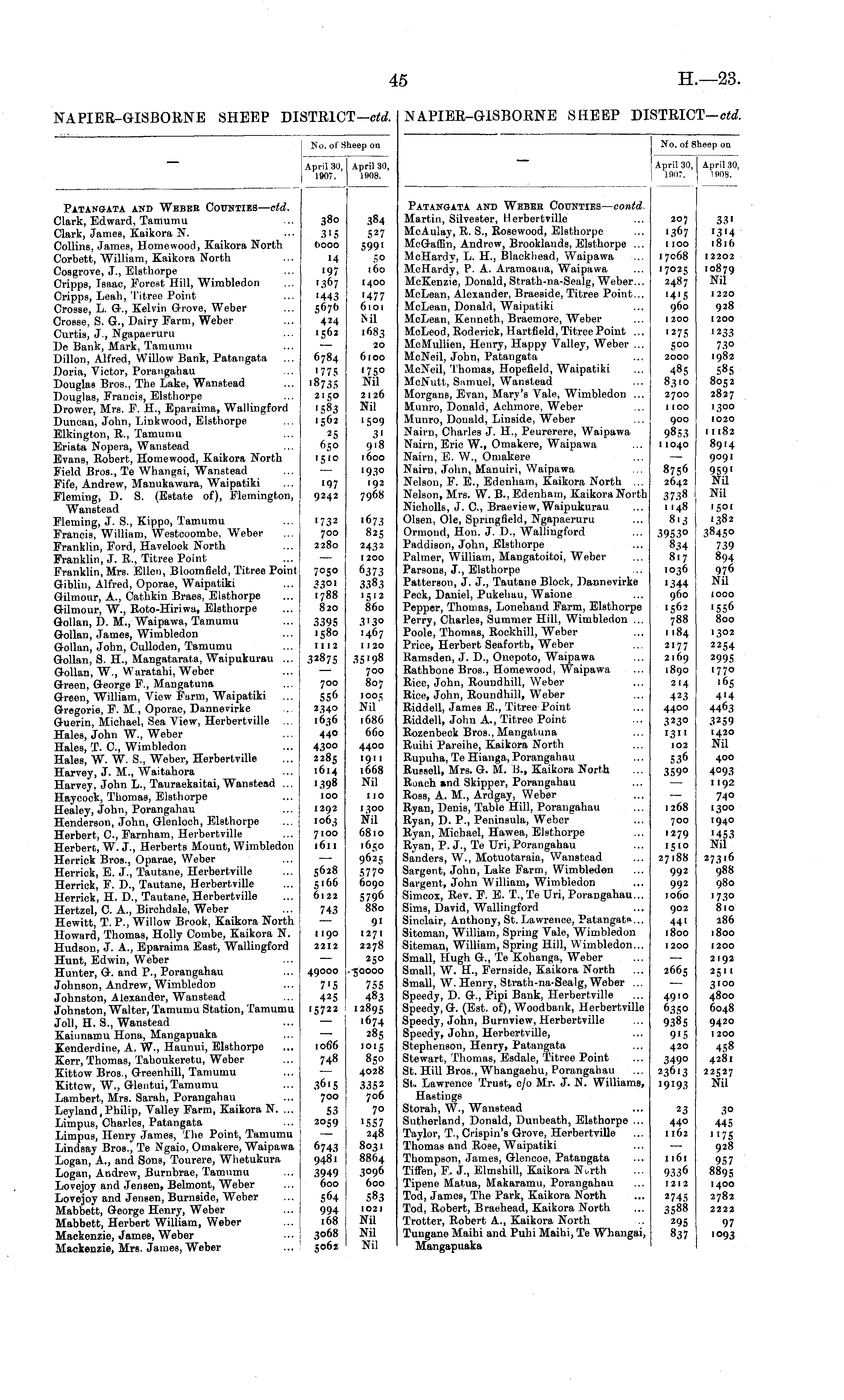 No. of Sheep on April 30, 1907. April 30, 1908. Patangata and Weber Counties — ctd. Clark, Edward, Tamumu Clark, James, Kaikora N. Collins, JameB, Homewood, Kaikora North Corbett, William, Kaikora North Cosgrove, J., Elsthorpe Cripps, Isaac, Forest Hill, Wimbledon Cripps, Leah, Titree Point Crosse, L. G., Kelvin Grove, Weber Crosse, S. G., Dairy Farm, Weber Curtis, J., Ngapaeruru De Bank, Mark, Tamumu Dillon, Alfred, Willow Bank, Patangata Doria, Victor, Porangahau Douglas Bros., The Lake, Wanstead Douglas, Francis, Elsthorpe Drawer, Mrs. F. H, Eparaima, Wallingford Duncan, John, Linkwood, Elsthorpe Elkington, R., Tamumu Eriata Nopera, Wanstead Evans, Robert, Homewood, Kaikora North Field Bros., Te Whangai, Wanstead Fife, Andrew, Manukawara, Waipatiki Fleming, D. S. (Estate of), Flemington, Wanstead Fleming, J. S., Kippo, Tamumu Francis, William, Westcoombe. Weber Franklin, Ford, Havelock North Franklin, J. R., Titree Point Franklin, Mrs. Ellen, Bloomfield, Titree Point Giblin, Alfred, Oporae, Waipatiki Gilmour, A., Cathkin Braes, Elsthorpe Gilmour, W., Roto-Hiriwa, Elsthorpe Gollan, D. M., Waipawa, Tamumu Gollan, JameB, Wimbledon Gollan, John, Culloden, Tamumu Gollan, S. H., Mangatarata, Waipukurau ... Gollan, W., Waratahi, Weber Green, George F., Mangatuna Green, William, View Farm, Waipatiki Gregorie, F. M., Oporae, Dannevirke Guerin, Michael, Sea View, Herbertville ... Hales, John W., Weber Hales, T. O, Wimbledon Hales, W. W. S., Weber, Herbertville Harvey, J. M., Waitahora Harvey, John L., Tauraekaitai, WanBtead ... Haycock, Thomas, Elsthorpe Healey, John, Porangahau Henderson, John, Glenloch, Elsthorpe Herbert, C, Farnham, Herbertville Herbert, W. J., Herberts Mount, Wimbledon Herrick Bros., Oparae, Weber Herrick, E. J., Tautane, Herbertville Herrick, F. D., Tautane, Herbertville Herrick, H. D., Tautane, Herbertville Hertzel, C. A., Birchdale, Weber Hewitt, T. P., Willow Brook, Kaikora North Howard, Thomas, Holly Combe, Kaikora N. Hudson, J. A., Eparaima East, Wallingford Hunt, Edwin, Weber Hunter, G. and P., Porangahau Johnson, Andrew, Wimbledon Johnston, Alexander, Wanstead Johnston, Walter, Tamumu Station, Tamumu Joll, H. S., Wanstead Kaiunamu Hona, Mangapuaka Kenderdine, A. W., Haunui, Elsthorpe Kerr, Thomas, Taboukeretu, Weber Kittow Bros., Greenhill, Tamumu Kittow, W., Glentui, Tamumu Lambert, Mrs. Sarah, Porangahau Leyland, Philip, Valley Farm, Kaikora N. ... Limpus, Charles, Patangata Limpus, Henry James, The Point, Tamumu Lindsay Bros., Te Ngaio, Omakere, Waipawa Logan, A., and Sons, Tourere, Whetukura Logan, Andrew, Burnbrae, Tamumu Lovejoy and Jensen, Belmont, Weber Lovejoy and Jensen, Burnside, Weber Mabbett, George Henry, Weber Mabbett, Herbert William, Weber Mackenzie, James, Weber Mackenzie, Mrs. James, Weber 380 3'5 6000 '4 '97 '367 '443 5676 424 1562 6784 •775 '8735 2150 '583 1562 25 650 1510 197 9242 '732 700 2280 7050 3301 1788 820 3395 1580 1112 32875 700 556 2.340 1636 440 4300 2285 1614 1398 100 384 527 599' iO 100 I4OO '477 6101 Nil 1683 20 6100 1750 Nil 2126 Nil '509 3' 918 1600 '93° 192 7968 1673 825 2432 1200 6373 338.3 1512 860 3'30 1467 1120 35198 700 807 1005 Nil' 1686 660 4400 191 1 1668 Nil no 1292 1063 7100 1611 5628 5166 6122 743 1300 Nil 6810 1650 9625 577o 6090 5796 880 91 1271 2278 250 . -50000 1190 2212 49000 7'5 425 15722 755 483 12895 1674 285 1015 850 4028 3352 706 70 '557 248 8031 8864 3096 600 S83 1021 Nil Nil Nil 1066 748 36'5 700 53 2059 6743 9481 3949 600 564 994 168 3068 5062