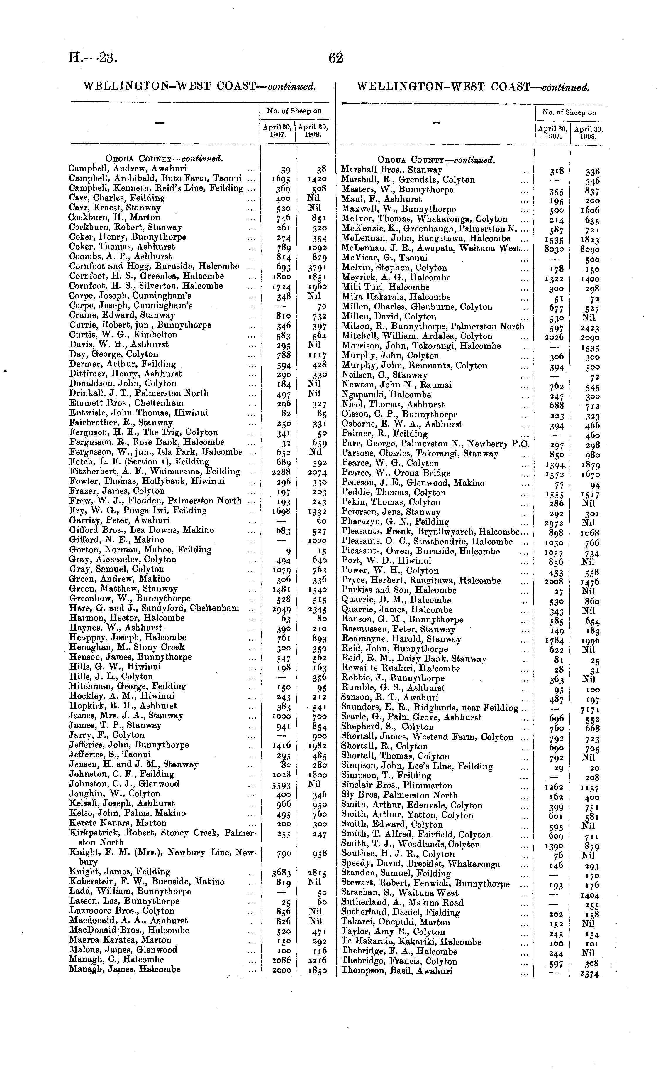 No. of Sheep on April 30, April 30, 1907. 1908. Oroua County— continued. Campbell, Andrew, Awahuri Campbell, Archibald, ButoFarm, Taonui ... Campbell, Kenneth, Reid's Line, Feilding ... Carr, CharleB, Feilding Carr, Ernest, Stanway Cockburn, H., Marton Cockburn, Robert, Stanway Coker, Henry, Bunnythorpe Coker, Thomas, Ashhurst Coombs, A. P., Ashhurst Cornfoot and Hogg, Burnside, Halcombe ... Cornfoot, H. S., Greenlea, Halcombe Cornfoot, H. S., Silverton, Halcombe Corpe, Joseph, Cunningham's Corpe, Joseph, Cunningham's Craine, Edward, Stanway Currie, Robert, jun., Bunnythorpe Curtis, W. G., Kimbolton Davis, W. H., Ashhurst Day, George, Colyton Dermer, Arthur, Feilding Dittimer, Henry, Ashhurst Donaldson, John, Colyton Drinkah, J. T., Palmerston North Emmett Bros., Cheltenham Entwisle, John Thomas, Hiwinui Fairbrother, R., Stanway Ferguson, H E., The Trig, Colyton Fergusson, R., Rose Bank, Halcombe Fergusson, W., jun., Isla Park, Halcombe ... Fetch, L. F. (Section 1), Feilding Fitzherbert, A. F., Waimarama, Feilding ... Fowler, Thomas, Holly bank, Hiwinui Frazer, James, Colyton Frew, W. J., Flodden, Palmerston North ... Fry, W. G., Punga Iwi, Feilding Garrity, Peter, Awahuri Gifford Bros., Lea Downs, Makino Gifford, N. E., Makino Gorton, Norman, Mahoe, Feilding Gray, Alexander, Colyton Gray, Samuel, Colyton Green, Andrew, Makino Green, Matthew, Stanway Greenhow, W., Bunnythorpe Hare, G. and J., Sandyford, Cheltenham ... Harmon, Hector, Halcombe Haynes, W., Ashhurst Heappey, Joseph, Halcombe Henaghan, M., Stony Creek Henson, James, Bunnythorpe Hills, G. W., Hiwinui Hills, J. L., Colyton Hitchman, George, Feilding Hockley, A. M., Hiwinui Hopkirk, R. H, Ashhurst James, Mrs. J. A., Stanway James, T. P., Stanway Jarry, F., Colyton Jefferies, John, Bunnythorpe Jefferies, S., Taonui Jensen, H. and J. M., Stanway Johnston, C. F., Feilding Johnston, C. J., Glenwood Joughin, W., Colyton Kelsall, Joseph, Ashhurst Kelso, John, Palms, Makino Kerete Kanara, Marton Kirkpatrick, Robert, Stoney Creek, Palmerston North Knight, F. M. (MrB.), Newbury Line, Newbury Knight, James, Feilding Koberstein, F. W., Burnside, Makino Ladd, William, Bunnythorpe Lassen, Las, Bunnythorpe Luxmoore Bros., Colyton Macdonald, A. A., Ashhurst MacDonald Bros., Halcombe Maeroa Karat ea, Marton Malone, James, Glenwood Managh, C, Halcombe Managh, James, Halcombe 39 '695 369 400 520 746 261 274 789 814 693 1800 1724 348 810 346 583 295 788 394 290 184 497 296 82 250 34' 32 652 689 2288 296 '97 '93 1698 683 9 494 1079 306 1481 528 2949 63 390 761 300 547 ,98 38 1420 508 Nil Nil 85' 320 354 1092 829 379' '85' i960 Nil 70 732 397 564 Nil 1117 428 33o Nil Nil 327 85 33' 50 6.59 Nil 592 2074 330 203 243 '332 So 527 IOOO '5 640 762 336 1540 5'5 2345 80 '50 243 383 1000 210 893 359 562 163 356 95 212 54' 700 854 900 1982 485 280 1800 Nil 94' 1416 To 2028 5593 400 966 495 200 255 346 95° 760 300 247 790 958 3683 819 2815 Nil 50 60 Nil Nil 47' 292 116 2216 1850 25 856 826 520 150 100 2086 2000