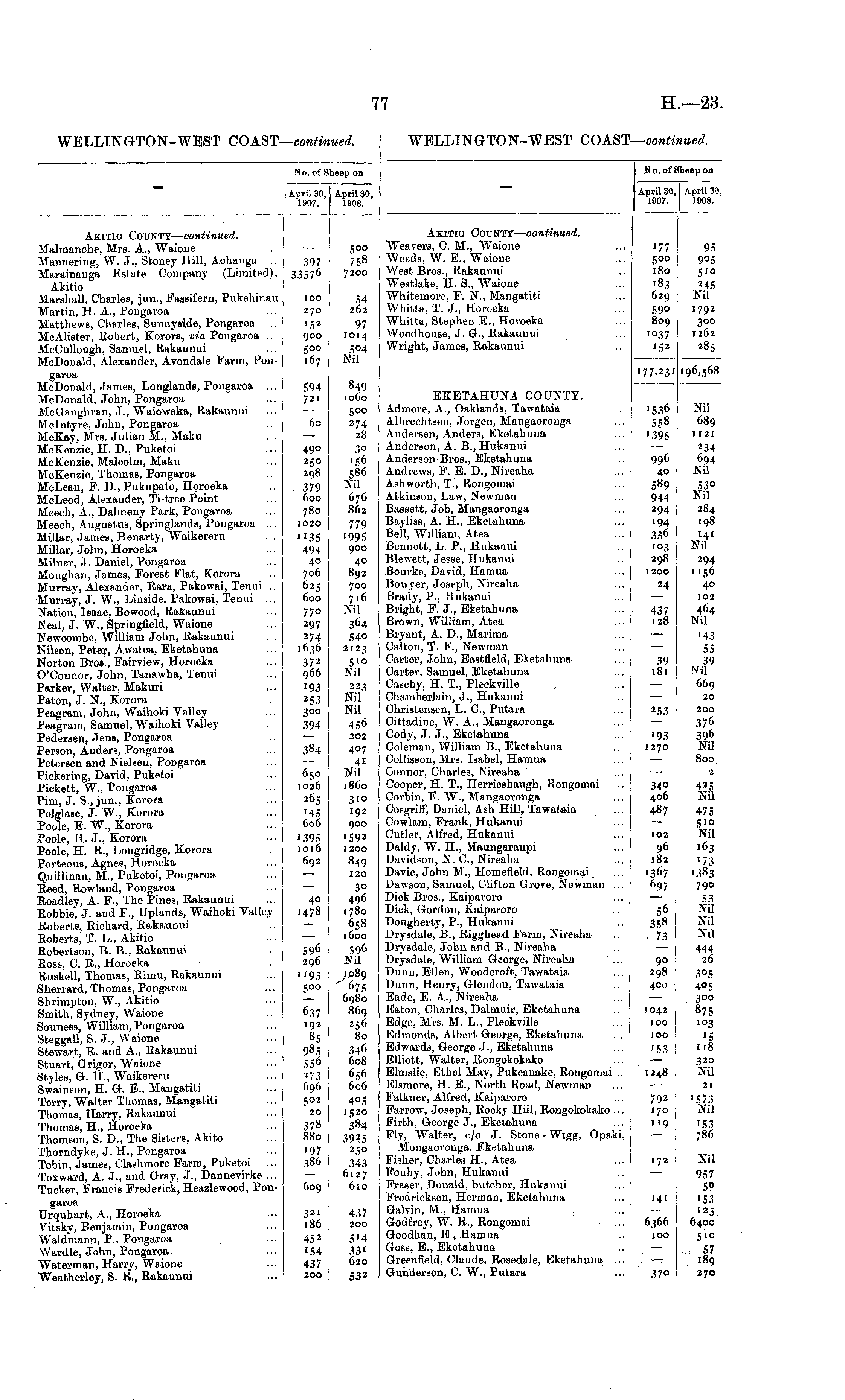 No. of Sheep on April 30, April 3 1907. 1908. April 30, 1908. Akitio County— continued. Malmanche, Mrs. A., Waione Mannering, W. J., Stoney Hill, Aohanga ... Marainanga Estate Company (Limited), Akitio Marshall, Charles, jun., Fassifern, Pukehinau Martin, H. A., Pongaroa Matthews, Charles, Sunnyside, Pongaroa ... McAlister, Robert, Korora, via Pongaroa ... McCullough, Samuel, Rakaunui McDonald, Alexander, Avondale Farm, Pongaroa McDonald, James, Longlands, Pongaroa ... McDonald, John, Pongaroa McGaughran, J., Waiowaka, Rakaunui Mclntyre, John, Pongaroa McKay, Mrs. Julian M., Maku MoKenzie, H. D., Puketoi McKenzie, Malcolm, Maku McKenzie, Thomas, Pongaroa McLean, F. D., Pukupato, Horoeka McLeod, Alexander, Ti-tree Point Meech, A., Dalmeny Park, Pongaroa Meech, Augustus, Springlands, Pongaroa ... Millar, James, Benarty, Waikereru Millar, John, Horoeka Milner, J. Daniel, Pongaroa Moughan, James, Forest Flat, Korora Murray, Alexander, Rara, Pakowai, Tenui ... Murray, J. W„ Linside, Pakowai, Tenui ... Nation, Isaac, Bowood, Rakaunui Neal, J. W., Springfield, Waione Newcombe, William John, Rakaunui Nilsen, Peter, Awatea, Eketahuna Norton Bros., Fairview, Horoeka O'Connor, John, Tanawha, Tenui Parker, Walter, Makuri Paton, J. N., Korora Peagram, John, Waihoki Valley Peagram, Samuel, Waihoki Valley Pedersen, Jens, Pongaroa Person, Anders, Pongaroa Petersen and Nielsen, Pongaroa Pickering, David, Puketoi Pickett, W, Pongaroa Pim, J. S., jun., Korora Polglase, J. W., Korora Poole, E. W., Korora Poole, H. J., Korora Poole, H. R., Longridge, Korora Porteous, Agnes, Horoeka Quillinan, M., Puketoi, Pongaroa Reed, Rowland, Pongaroa Roadley, A. F., The Pines, Rakaunui Robbie, J. and F., Uplands, Waihoki Valley Roberts, Richard, Rakaunui Roberts, T. L., Akitio Robertson, R. B., Rakaunui Ross, C. R., Horoeka Ruskell, Thomas, Rimu, Rakaunui Sherrard, Thomas, Pongaroa Shrimpton, W., Akitio Smith, Sydney, Waione Souness, William, Pongaroa Steggall, S. J., Waione Stewart, R. and A., Rakaunui Stuart, Grigor, Waione Styles, G. H., Waikereru Swainson, H. G. E., Mangatiti Terry, Walter Thomas, Mangatiti Thomas, Harry, Rakaunui Thomas, H., Horoeka Thomson, S. D., The Sisters, Akito Thorndyke, J. H., Pongaroa Tobin, James, Clashmore Farm, Puketoi ... Toxward, A. J., and Gray, J., Dannevirke ... Tucker, Francis Frederick, Heazlewood, Pongaroa Urquhart, A., Horoeka Vitsky, Benjamin, Pongaroa Waldmann, P., Pongaroa Wardle, John, Pongaroa Waterman, Harry, Waione Weatherley, S. R., Rakaunui 397 33576 100 270 152 900 500 167 594 721 60 49° 250 298 379 600 780 1020 "35 494 40 706 625 600 77o 297 2 74 1636 372 966 '93 253 300 394 384 650 1026 265 '45 606 500 758 7200 54 262 97 1014 504 Nil 849 [060 500 274 28 30 156 586 Nil 676 862 779 '995 900 40 892 700 716 Nil 364 540 212.3 5'0 Nil 223 Nil' Nil 456 202 407 41 Nil i860 '395 1016 692 40 1478 596 296 "93 5°o 6.37 192 85 985 556 273 696 502 20 378 880 '97 386 3'o 192 900 '592 1200 849 120 30 496 1780 658 160O 596 Nil 1089 "675 6980 869 256 80 346 608 656 606 405 1520 384 392.5 250 343 6127 610 609 321 186 437 200 452 '54 437 200 5'4 33' 620 532