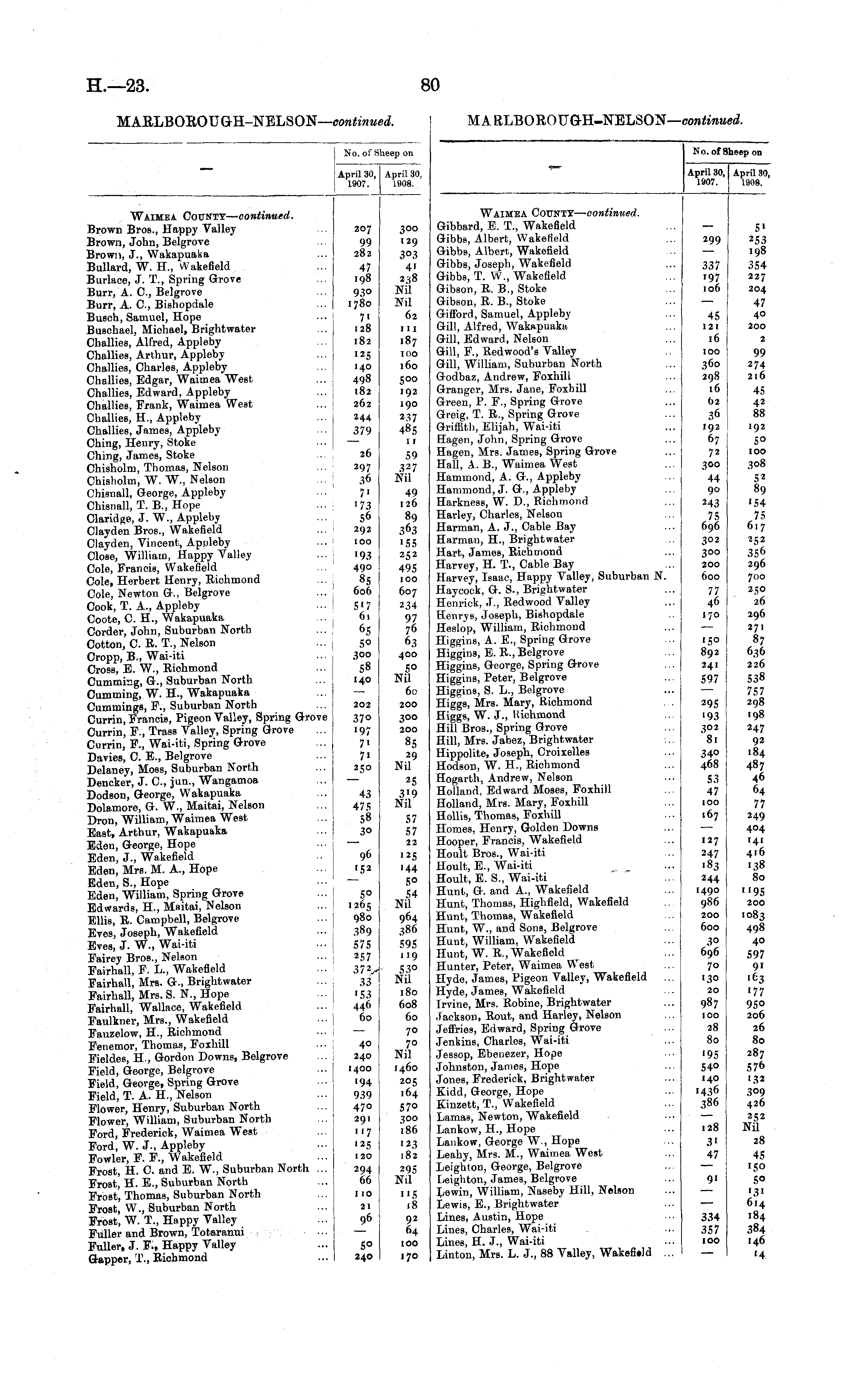 No. of Sheep on April 30, April 30, 1907. 1908. Waimea County— continued. Gibbard, E. T., Wakefield Gibbs, Albert, Wakefield Gibbs, Albert, Wakefield Gibbs, Joseph, Wakefield Gibbs, T. W., Wakefield Gibson, R. B., Stoke Gibson, R. B., Stoke Gifford, Samuel, Appleby Gill, Alfred, Wakapuaka Gill, Edward, Nelson Gill, F., Redwood's Valley Gill, William, Suburban North Godbaz, Andrew, Foxhill Granger, Mrs. Jane, Foxhill Green, P. F., Spring Grove Greig, T. R., Spring Grove Griffith, Elijah, Wai-iti Hagen, John, Spring Grove Hagen, MrB. James, Spring Grove Hall, A. B., Waimea West Hammond, A. G., Appleby Hammond, J. &., Appleby Harkness, W. D., Richmond Harley, Charles, Nelson Harman, A. J., Cable Bay Harman, H., Brightwater Hart, James, Richmond Harvey, H. T., Cable Bay Harvey, Isaac, Happy Valley, Suburban N. Haycock, G. S., Brightwater Henrick, J., Redwood Valley Henrys, Joseph, Bishopdale Heslop, William, Richmond Higgins, A. E., Spring Grove Higgins, E. R., Belgrove Higgins, George, Spring Grove Higgins, Peter, Belgrove Higgins, S. It., Belgrove Higgs, MrB. Mary, Richmond Higgs, W. J., Kichmond Hill Bros., Spring Grove Hill, Mrs. Jabez, Brightwater Hippolite, Joseph, Croixelles Hodson, W. H., Richmond Hogarth, Andrew, Nelson Holland, Edward Moses, Foxhill Holland, Mrs. Mary, Foxhill Hollis, Thomas, Foxhill Homes, Henry, Golden Downs Hooper, Francis, Wakefield Hoult Bros., Wai-iti Hoult, E., Wai-iti Hoult, E. S., Wai-iti Hunt, G. and A., Wakefield Hunt, Thomas, Highfield, Wakefield Hunt, Thomas, Wakefield Hunt, W., and Sons, Belgrove Hunt, William, Wakefield Hunt, W. R., Wakefield Hunter, Peter, Waimea West Hyde, James, Pigeon Valley, Wakefield Hyde, James, Wakefield Irvine, Mrs. Robine, Brightwater Jackson, Rout, and Harley, Nelson Jeffries, Edward, Spring Grove Jenkins, Charles, Wai-iti Jessop, Ebenezer, Hope Johnston, James, Hope Jones, Frederick, Brightwater Kidd, George, Hope Kinzett, T., Wakefield Lamas, Newton, Wakefield Lankow, H., Hope Lankow, George W., Hope Leahy, Mrs. M., Waimea West Leighton, George, Belgrove Leighton, James, Belgrove Lewin, William, Naseby Hill, Nelson Lewis, E., Brightwater Lines, Austin, Hope Lines, Charles, Wai-iti Lines, H. J., Wai-iti Linton, Mrs. L. J., 88 Valley, Wakefi»ld ... 299 337 '97 io6 45 121 16 IOO 360 298 16 62 36 192 67 72 .300 44 90 243 75 696 302 300 200 600 77 46 i? 0 '50 892 241 597 295 '93 302 '81 5' 253 198 354 227 204 47 40 200 2 99 274 216 45 42 88 192 5° 100 308 52 89 '54 75 617 252 356 296 700 250 26 296 271 87 636 226 538 757 298 198 247 92 .84 487 46 64 77 249 404 141 416 138 80 "95 200 1083 498 4° 597 9' '63 177 950 206 26 80 287 576 '32 309 426 252 Nil 28 45 '5o 50 '3' 614 184 384 146 '4 340 468 53 47 100 167 127 247 '83 244 1490 986 200 600 30 696 70 130 20 987 IOO 28 80 '95 54o 140 1436 386 128 3' 47 9' 334 357 100