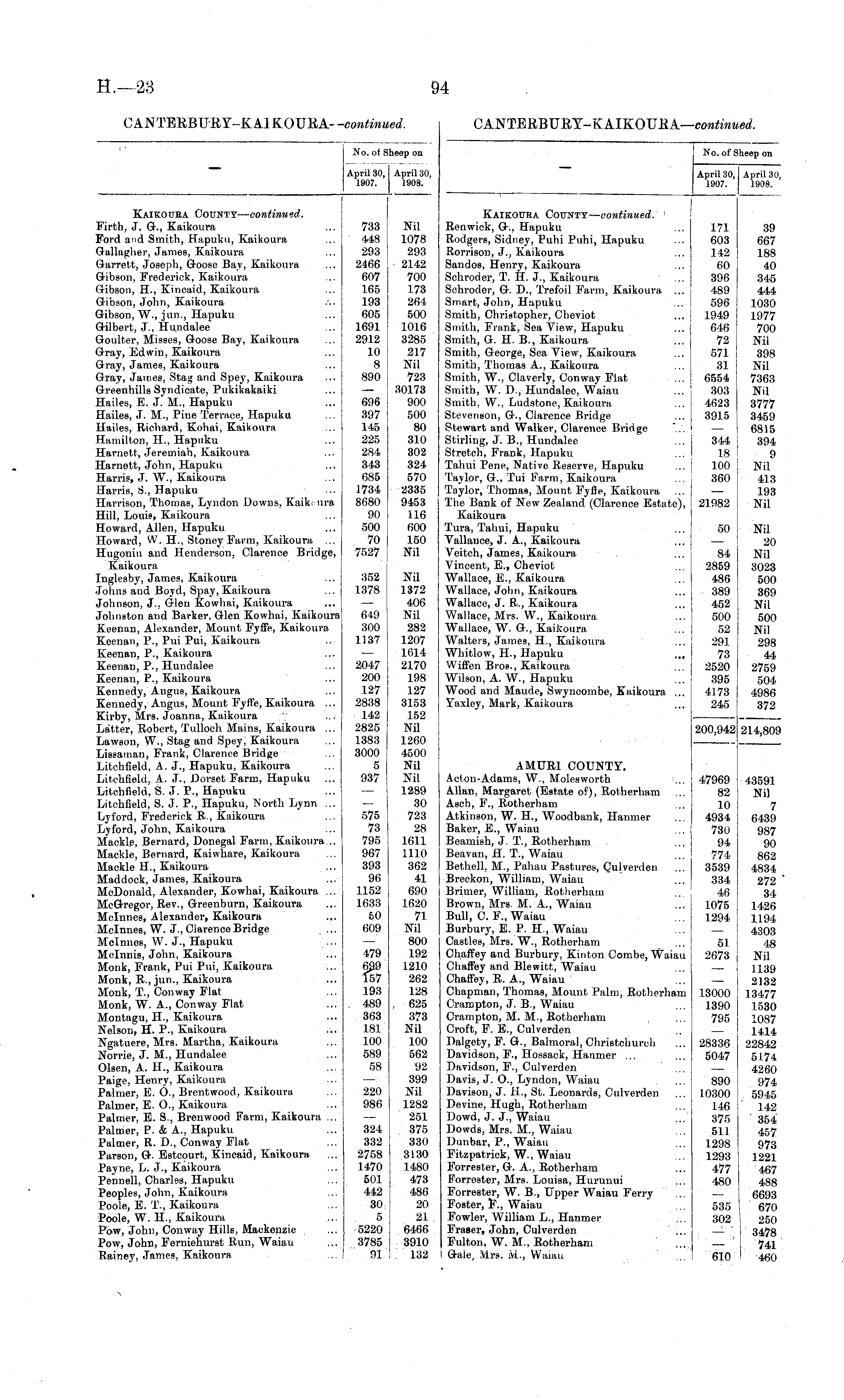No. of Sheep on April 30, April 30, 1907. 1908. Kaikouea County— continued. Firth, J. G., Kaikoura Ford and Smith, Hapuku, Kaikoura Gallagher, James, Kaikoura Garrett, Joseph, Goose Bay, Kaikoura Gibson, Frederick, Kaikoura Gibson, H, Kincaid, Kaikoura Gibson, John, Kaikoura Gibson, W., jun., Hapuku Gilbert, J., Hundalee Goulter, Misses, Goose Bay, Kaikoura Gray, Edwin, Kaikoura Gray, JameB, Kaikoura Gray, Jautes, Stag and Spey, Kaikoura Greenhills Syndicate, Pukikakaiki Hailes, E. J. M., Hapuku Hailes, J. M., Pine Terrace, Hapuku Hailes, Richard, Kohai, Kaikoura Hamilton, H, Hapuku Harnett, Jeremiah, Kaikoura Harnett, John, Hapuku Harris, J. W., Kaikoura Harris, S., Hapuku Harrison, Thomas, Lyndon Downs, Kaik: lira Hill, Louis, Kaikoura Howard, Allen, Hapuku Howard, W. H., Stoney Farm, Kaikoura ... Hugonin and Henderson, Clarence Bridge, Kaikoura Inglesby, James, Kaikoura Johns and Boyd, Spay, Kaikoura Johnson, J., Glen Kowhai, Kaikoura Johnston and Barker, Glen Kowhai, Kaikoura Keenan, Alexander, Mount Fyffe, Kaikoura Keenan, P., Pui Pui, Kaikoura Keenan, P., Kaikoura Keenan, P., Hundalee Keenan, P., Kaikoura Kennedy, Angus, Kaikoura Kennedy, Angus, Mount Fyffe, Kaikoura ... Kirby, Mrs. Joanna, Kaikoura Latter, Robert, Tulloch Mains, Kaikoura ... Lawson, W., Stag and Spey, Kaikoura Lissaman, Frank, Clarence Bridge Litchfield, A. J., Hapuku, Kaikoura Litchfield, A. J., Dorset Farm, Hapuku ... Litchfield, S. J. P., Hapuku Litchfield, S. J. P., Hapuku, North Lynn ... Lyford, Frederick R., Kaikoura Lyford, John, Kaikoura Mackie, Bernard, Donegal Farm, Kaikoura... Mackie, Bernard, Kai whare, Kaikoura Mackie H, Kaikoura Maddock, James, Kaikoura McDonald, Alexander, Kowhai, Kaikoura ... McGregor, Rev., Greenburn, Kaikoura Mclnnes, Alexander, Kaikoura Mclnnes, W. J., Clarence Bridge Mclnnes, W. J., Hapuku Mclnnis, John, Kaikoura Monk, Frank, Pui Pui, Kaikoura Monk, R., jun., Kaikoura Monk, T., Conway Flat Monk, W. A., Conway Flat Montagu, H., Kaikoura Nelson, H. P., Kaikoura Ngatuere, Mrs. Martha, Kaikoura Norrie, J. M., Hundalee Olsen, A. H., Kaikoura Paige, Henry, Kaikoura ... Palmer, E. O., Brentwood, Kaikoura Palmer, E. O., Kaikoura Palmer, E. S., Brenwood Farm, Kaikoura ... Palmer, P. & A., Hapuku Palmer, R. D., Conway Flat ParBon, G. Estcourt, Kincaid, Kaikoura Payne, L. J., Kaikoura Pennell, Charles, Hapuku Peoples, John, Kaikoura Poole, E. T., Kaikoura Poole, W. H., Kaikoura Pow, John, Conway Hills, Mackenzie . Pow, John, Ferniehurst Run, Waiau Rainey, .Tames, Kaikoura 733 448 293 2466 607 165 193 605 1691 2912 10 8 890 696 397 145 225 284 343 685 1734 8680 90 500 70 7527 352 1378 649 300 1137 2047 200 127 2838 142 2825 1383 3000 5 937 Nil 1078 293 2142 700 173 264 500 1016 3285 217 Nil 723 30173 900 500 80 310 302 324 570 2335 9453 116 600 150 Nil Nil 1372 406 Nil 282 1207 1614 2170 198 127 3153 152 Nil 1260 4500 Nil Nil 1289 30 723 28 1611 1110 362 41 690 1620 71 Nil 800 192 1210 262 128 625 373 Nil 100 562 92 399 Nil 1282 251 375 330 3130 1480 473 486 20 21 6466 3910 . 132 575 73 795 967 393 96 1152 1633 50 609 479 6,99 157 193 . 489 363 181 100 589 58 220 986 324 332 2758 1470 501 442 30 5 5220 3785 91