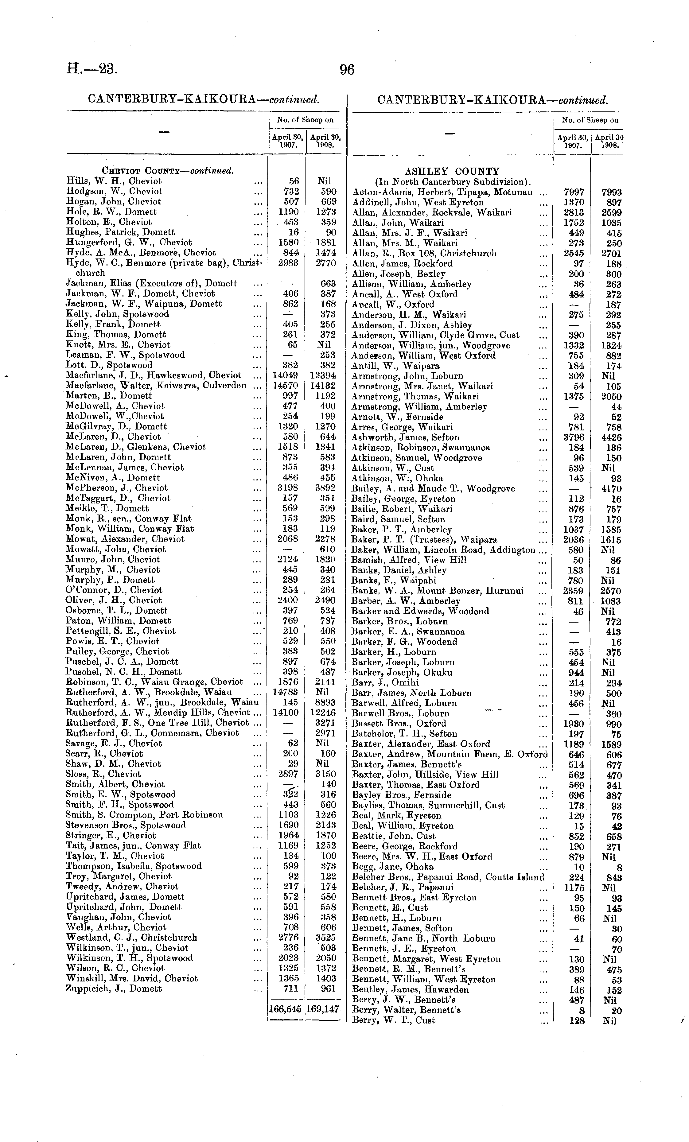 No. of Sheep on April 30, | April 30 1907. 1908. ASHLEY COUNTY (In North Canterbury Subdivision). Acton-Adams, Herbert, Tipapa, Motunau ... Addinell, John, West Eyreton Allan, Alexander, Rockvale, Waikari Allan, John, Waikari Allan, Mrs. J. F., Waikari Allan, Mrs. M., Waikari Allan, R., Box 108, Christchurch Allen, James, Rockford Allen, Joseph, Bexley Allison, William, Amberley Ancall, A.. West Oxford Ancall, W., Oxford Anderson, H. M., Waikari Anderson, J. Dixon, Ashley Anderson, William, Clyde Grove, Cusf Anderson, William, jun., Woodgrove Andefson, William, WeBt Oxford Antill, W., Waipara Armstrong, John, Loburn Armstrong, Mrs. Janet, Waikari Armstrong, Thomas, Waikari Armstrong, William, Amberley Arnott, W., Fernside Arres, George, Waikari Ashworth, James, Sefton Atkinson, Robinson, Swannanoa Atkinson, Samuel, Woodgrove Atkinson, W., Cust Atkinson, W., Ohoka Bailey, A. and Maude T., Woodgrove Bailey, George, Eyreton Bailie, Robert, Waikari Baird, Samuel, Sefton Baker, P. T., Amberley Baker, P. T. (Trustees), Waipara Baker, William, Lincoln Road, Addington ... Bamish, Alfred, View Hill Banks, Daniel, Ashley Banks, F., Waipahi Banks, W. A., Mount Benzer, Hurunui Barber, A. W., Amberley Barker and Edwards, Woodend Barker, Bros., Loburn Barker, E. A., Swannanoa Barker, F. G., Woodend Barker, H., Loburn Barker, Joseph, Loburn Barker, Joseph, Okuku Barr, J., Omihi Barr, James, North Loburn Barwell, Alfred, Loburn Barwell Bros., Loburn Bassett Bros., Oxford Batchelor, T. H., Sef'tou Baxter, Alexander, East Oxford Baxter, Andrew, Mountain Farm, B. Oxford Baxter, James, Bennett's Baxter, John, Hillside, View Hill Baxter, ThomaB, Bast Oxford Bayley Bros., Fernside Bayliss, Thomas, Summerhill, Cust Beal, Mark, Eyreton Beal, William, Eyreton Beattie, John, Cust Beere, George, Rockford Bcere, Mrs. W. H., East Oxford Begg, Jane, Ohoka Belcher Bros., Papanui Road, Coutts Island Belcher, J. R., Papanui Bennett Bros., East Eyreton Bennett, E., Cust Bennett, H., Loburn Bennett, James, Sefton Bennett, Jane B., North Loburn Bennett, J. E., Eyreton Bennett, Margaret, West Eyreton Bennett, R. M., Bennett's Bennett, William, West Eyreton Bentley, James, Hawarden Berry, J. W., Bennett's Berry, Walter, Bennett's Berry, W. T, Cusf 7997 1370 2813 1752 449 273 2545 97 200 36 484 275 390 1332 755 184 309 54 1375 92 781 3796 184 96 539 145 112 876 173 1037 2036 580 50 183 780 2359 811 46 7993 897 2599 1035 415 250 2701 188 300 263 272 187 292 255 287 1324 882 174 Nil 105 2050 44 52 758 4426 136 150 Nil 93 4170 16 757 179 1585 1615 Nil 86 151 Nil 2570 1083 Nil 772 413 16 375 Nil Nil 294 500 Nil 360 990 75 1589 606 677 470 341 387 93 76 42 658 271 Nil 8 843 Nil 93 145 Nil 30 60 70 Nil 475 53 152 Nil 20 Nil 555 454 944 214 190 456 1930 197 1189 646 514 562 569 696 173 129 15 852 190 879 10 224 1175 95 150 66 41 130 389 88 146 487 8 128
