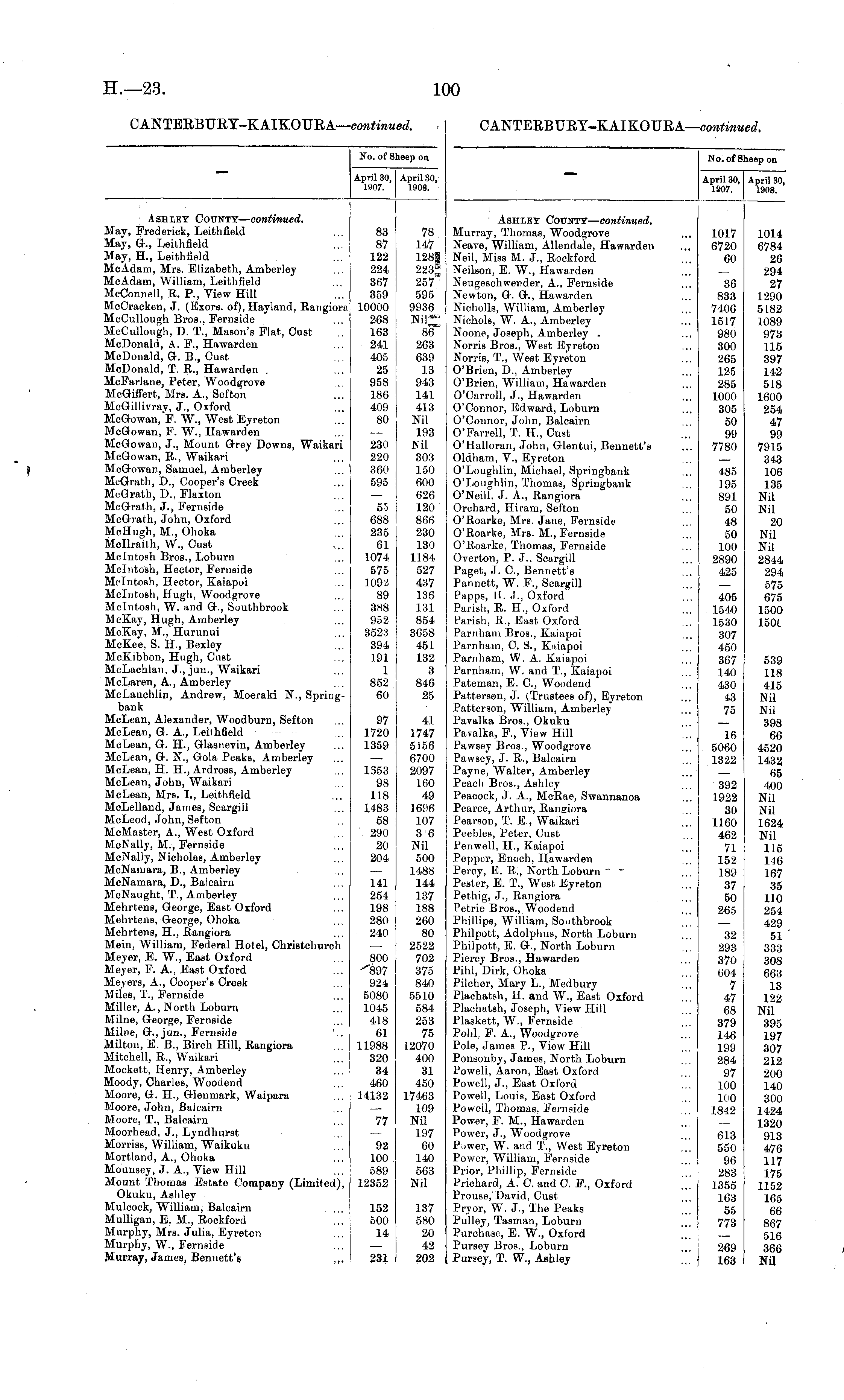 No. of Sheep on April 30, 1907. April 30, 1908. Ashley County— continued. Murray, Thomas, Woodgrove Neave, William, Allendale, Hawarden Neil, Miss M. J., Rockford Neilson, E. W., Hawarden Neugeschwender, A., Fernside Newton, G. G., Hawarden Nicholls, William, Amberley Nichols, W. A., Amberley Noone, Joseph, Amberley , Norris Bros., West Eyreton Norris, T., West Eyreton O'Brien, D., Amberley O'Brien, William, Hawarden O'Carroll, J., Hawarden O'Connor, Edward, Loburn O'Connor, John, Balcairn O'Farrell, T. H., Cust O'Halloran, John, Glentui, Bennett's Oldham, V., Eyreton O'Loughlin, Michael, Springbank O'Loughlin, Thomas, Springbank O'Neill. J. A., Rangiora Orchard, Hiram, Sefton O'Roarke, Mrs. Jane, Fernside O'Roarke, Mrs. M., Fernside O'Roarke, Thomas, Fernside Overton, P. J., Seargill Paget, .T. ft, Bennett's Pannett, W. F., Seargill Papps, H. ,)., Oxford Parish, R. H, Oxford Parish, R., East Oxford Parnham Bros., Kaiapoi Parnham, ft S., Kaiapoi Parnham, W. A. Kaiapoi Parnham, W. and T\, Kaiapoi Pateman, E. ft, Woodend Patterson, J. (Trustees of), Eyreton Patterson, William, Amberley Pavalka Bros., Okuku Pavalka, F., View Hill Pawsey Bros., Woodgrove Pawsey, J. R., Balcairn Payne, Walter, Amberley Peach Bros., Ashley Peacock, J. A., McRae, Swannanoa Pearce, Arthur, Rangiora Pearson, T. E., Waikari Peebles, Peter, Cust Penwell, H., Kaiapoi Pepper, Enoch, Hawarden Percy, E. R., North Loburn Pester, B. T., West Eyreton Pethig, J., Rangiora Petrie Bros., Woodend Phillips, William, Southbrook Philpott, Adolphus, North Loburn Philpott, E. G., North Loburn Piercy Bros., Hawarden Pihl, Dirk, Ohoka Pilcher, Mary L., Medbury Plaehatsh, H. and W., East Oxford Plachatsh, Joseph, View Hill Plaskett, W., Fernside Pohl, F. A., Woodgrove Pole, James P., View Hill Ponsonby, James, North Loburn Poweli, Aaron, East Oxford Powell, J., East Oxford Powell, Louis, East Oxford Powell, Thomas, Fernside Power, F. M., Hawarden Power, J., Woodgrove P<iwer, W. and T., West Eyreton Power, William, Fernside Prior, Phillip, Fernside Prichard, A. C. and C. F., Oxford Prouse,'David, Cust Pryor, W. J., The Peaks Pulley, Tasman, Loburn Purchase, E. W., Oxford Pursey Bros., Loburn Pursey, T. W., Ashley 1017 6720 60 36 833 7406 1517 980 300 265 125 285 1000 305 50 99 7780 485 195 891 50 48 50 100 2890 425 405 1540 1530 307 450 367 140 430 43 75 16 5060 1322 1014 6784 26 294 27 1290 5182 1089 973 115 397 142 518 1600 254 47 99 7915 343 106 135 Nil Nil 20 Nil Nil 2844 294 575 675 1500 150t 539 118 415 Nil Nil 398 66 4520 1432 65 400 Nil Nil 1624 Nil 115 146 167 35 110 254 429 51 333 308 663 13 122 Nil 395 197 307 212 200 140 300 1424 1320 913 476 117 175 1152 165 66 867 516 366 Nil 392 1922 30 1160 462 71 152 189 37 50 265 32 293 370 604 7 47 68 379 146 199 284 97 100 ioo 1842 613 550 96 283 1355 163 55 773 269 163