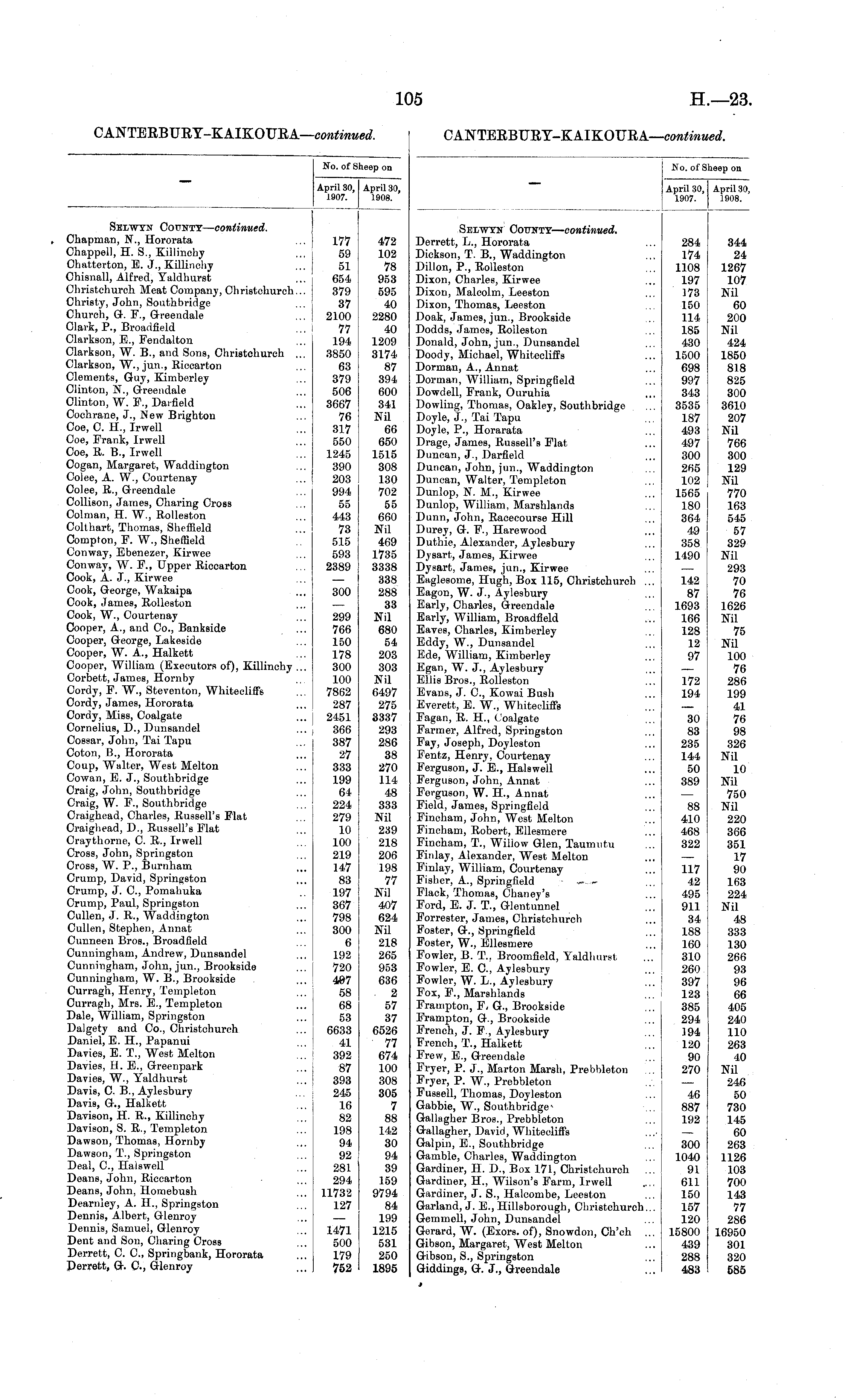 No. of Sheep on April 30, 1907. April 30, 1908. Selwyn County— continued. Chapman, N., Hororata Chappell, H. S., Killinchy Chatterton, E. J., Killinchy Chisnall, Alfred, Yaldhurst Christchurch Meat Company, Christchurch... Christy, John, Southbridge Church, G. F., Greendale Clark, P., Broadfield Clarkson, E., Fendalton Clarkson, W. B., and Sons, Christchurch ... Clarkson, W., jun., Riccarton Clements, Guy, Kimberley Clinton, N., Greendale Clinton, W. F., Darfield Cochrane, J., New Brighton Coe, C. H, Irwell Coe, Frank, Irwell Coe, R. B., Irwell Cogan, Margaret, Waddington Colee, A. W., Courtenay Colee, R., Greendale Collison, James, Charing Cross ... Colman, H. W., Rolleston Colthart, Thomas, Sheffield Compton, F. W., Sheffield Conway, Ebenezer, Kirwee Conway, W. F., Upper Riccarton Cook, A. J., Kirwee Cook, George, Wakaipa Cook, James, Rolleston Cook, W., Courtenay Cooper, A., and Co., Bankside Cooper, George, Lakeside Cooper, W. A., Halkett Cooper, William (Executors of), Killinchy ... Corbett, James, Hornby Cordy, F. W., Steventon, Whitecliffs Cordy, James, Hororata Cordy, Miss, Coalgate Cornelius, D., Dunsandel Cossar, John, Tai Tapu Coton, B., Hororata Coup, Walter, WeBt Melton Cowan, E. J., Southbridge Craig, John, Southbridge Craig, W. F., Southbridge Craighead, Charles, Russell's Flat Craighead, D., Russell's Flat Craythorne, C. R., Irwell Cross, John, Springston Cross, W. P., Burnham Crump, David, Springston Crump, J. ft, Pomahuka Crump, Paul, Springston Cullen, J. R., Waddington Cullen, Stephen, Annat Cunneen Bros., Broadfield Cunningham, Andrew, Dunsandel Cunningham, John, jun., Brookside Cunningham, W. B., Brookside Curragh, Henry, Templeton Curragh, Mrs. E., Templeton Dale, William, Springston Dalgety and Co., Christchurch Daniel, E. H., Papanui Davies, E. T., West Melton Davies, H. E., Greenpark Davies, W., Yaldhurst Davis, C. B., Aylesbury Davis, G., Halkett Davison, H. R., Killinchy Davison, S. R., Templeton Dawson, Thomas, Hornby Dawson, T., Springston Deal, ft, Halswell '.', Deans, John, Riccarton Deans, John, Homebush Dearnley, A. H., Springston Dennis, Albert, Glenroy Dennis, Samuel, Glenroy Dent and Son, Charing Cross Derrett, C. ft, Springbank, Hororata Derrett, Or. ft, Glenroy 177 59 51 654 379 37 2100 77 194 3850 63 379 506 3667 76 317 550 1245 390 203 994 55 443 73 515 593 2389 300 299 766 150 178 300 100 7862 287 2451 366 387 27 333 199 64 224 279 10 100 219 147 83 197 367 798 300 6 192 720 497 58 68 53 6633 41 392 87 393 245 16 82 198 94 92 281 294 11732 127 472 102 78 953 595 40 2280 40 1209 3174 87 394 600 341 Nil 66 650 1515 308 130 702 55 660 Nil 469 1735 3338 338 288 33 Nil 680 54 203 303 Nil 6497 275 3337 293 286 38 270 114 48 333 Nil 239 218 206 198 77 Nil 407 624 Nil 218 265 953 636 . 2 57 37 6526 ' 77 674 100 308 305 7 88 142 30 94 39 159 9794 84 199 1215 531 250 1895 1471 500 179 752
