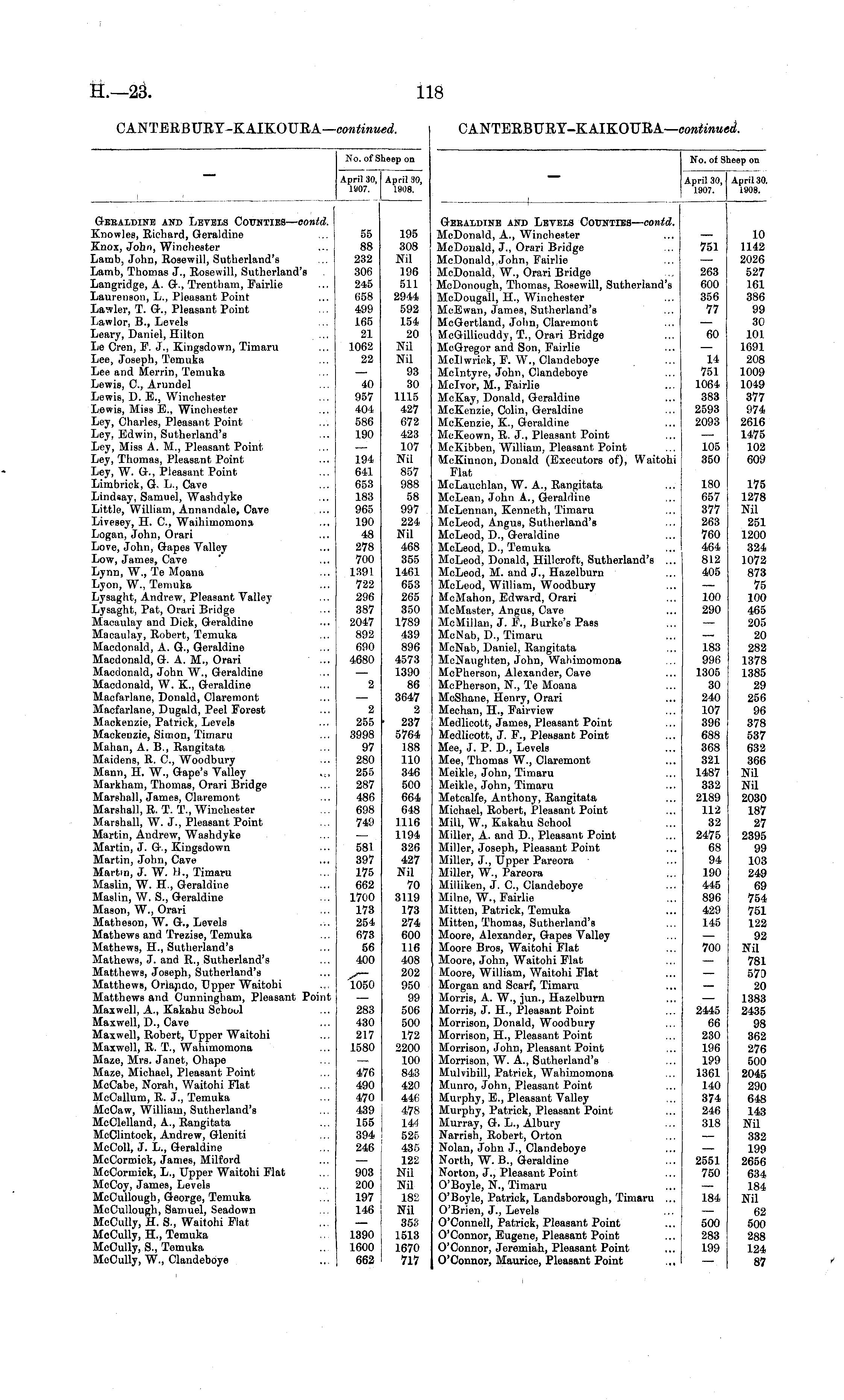 No. of Sheep on April 30, 1907. April 30, 1908. Geealdine and Levels Counties— contd. Knowles, Richard, Geraldine Knox, John, Winchester Lamb, John, Rosewill, Sutherland's Lamb, Thomas J., Rosewill, Sutherland's Langridge, A. G., Trentham, Fairlie Laurenson, L., Pleasant Point Lawler, T. &., Pleasant Point Lawlor, B., Levels Leary, Daniel, Hilton .... Le Cren, F. J., Kingsdown, Timaru Lee, Joseph, Temuka Lee and Merrin, Temuka Lewis, ft, Arundel Lewis, D. B., Winchester Lewis, Miss E., Winchester Ley, Charles, Pleasant Point Ley, Edwin, Sutherland's Ley, Miss A. M., Pleasant Point Ley, Thomas, Pleasant Point Ley, W. G., Pleasant Point Limbrick, G, L., Cave Lindsay, Samuel, Washdyke Little, William, Annandale, Cave ... Livesey, H. ft, Waihimomona Logan, John, Orari Love, John, Gapes Valley Low, James, Cave Lynn, W., Te Moana Lyon, W., Temuka Lysaght, Andrew, Pleasant Valley Lysaght, Pat, Orari Bridge Macaulay and Dick, Geraldine Macaulay, Robert, Temuka Macdonald, A. G., Geraldine Macdonald, G. A. M., Orari Macdonald, John W., Geraldine Macdonald, W. K., Geraldine Macfarlane, Donald, Claremont Macfarlane, Dugald, Peel Forest Mackenzie, Patrick, Levels Mackenzie, Simon, Timaru Mahan, A. B., Rangitata Maidens, R. ft, Woodbury Mann, H. W., Gape's Valley Markham, Thomas, Orari Bridge Marshall, James, Claremont Marshall, R. T. T., Winchester Marshall, W. J., Pleasant Point Martin, Andrew, Washdyke Martin, J. G., Kingsdown Martin, John, Cave Martin, J. W. H., Timaru Maslin, W. H., Geraldine Maslin, W. S., Geraldine Mason, W., Orari Matheson, W. G., Levels MathewB and Trezise, Temuka Mathews, H., Sutherland's Mathews, J. and R., Sutherland's MatthewB, Joseph, Sutherland's Matthews, Orlando, Upper Waitohi Matthews and Cunningham, Pleasant Point Maxwell, A., Kakahu School Maxwell, D., Cave Maxwell, Robert, Upper Waitohi Maxwell, R. T, Wahimomona Maze, Mrs. Janet, Ohape Maze, Michael, Pleasant Point MeCabe, Norah, Waitohi Flat McCallum, R. J., Temuka McCaw, William, Sutherland's McClelland, A., Rangitata McClintock, Andrew, Gleniti McColl, J. L., Geraldine McCormick, James, Milford McCormick, L., Upper Waitohi Flat McCoy, James, Levels McCullough, George, Temuka McCullough, Samuel, Seadown McCully, H. S., Waitohi Flat McCully, H., Temuka McCully, S., Temuka McCully, W., Clandeboye 55 88 232 306 245 658 499 165 21 1062 22 40 957 404 586 190 194 641 653 183 965 190 48 278 700 1391 722 296 387 2047 892 690 4680 2 2 255 3998 97 280 255 287 486 698 749 195 308 Nil 196 511 2944 592 154 20 Nil Nil 93 30 1115 427 672 423 107 Nil 857 988 58 997 224 Nil 468 355 1461 653 265 350 1789 439 896 4573 1390 86 3647 2 237 5764 188 110 346 500 664 648 1116 1194 326 427 Nil 70 3119 173 274 600 116 408 202 950 99 506 500 172 2200 100 843 420 446 478 144 525 435 122 Nil Nil 182 Nil 358 1513 1670 717 581 397 175 662 1700 173 254 673 56 400 1050 283 430 217 1580 476 490 470 439 155 394 246 903 200 197 146 1390 1600 662