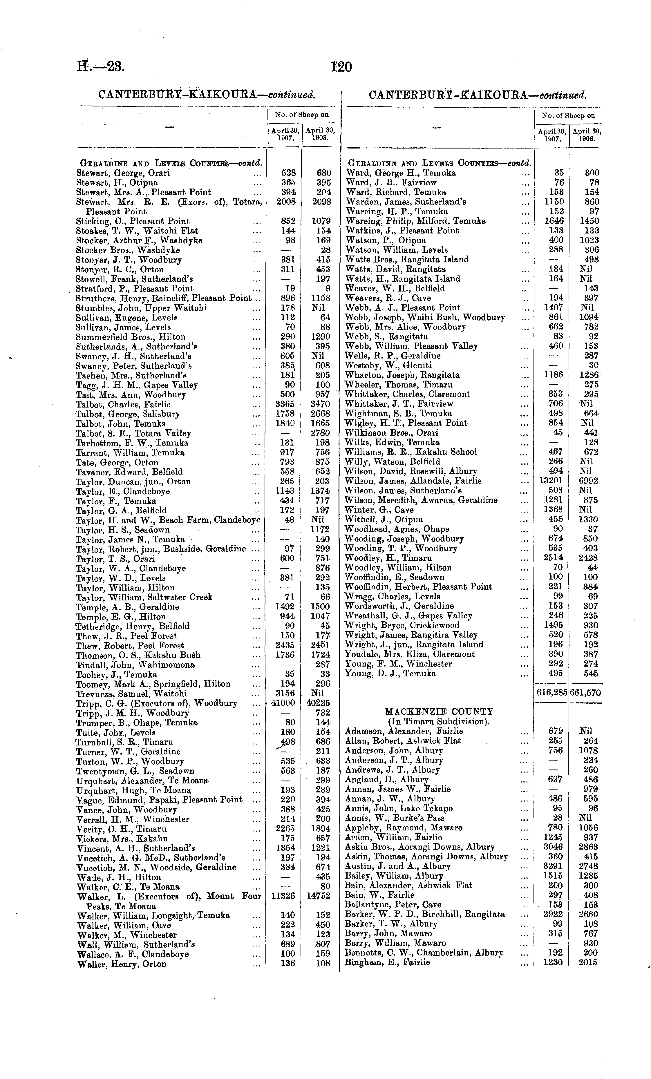 No. of Sheep on April 30, April 30, 1907. 1908. Geealdine and Levels Counties— contd. Ward, George H., Temuka Ward, J. B.. Fairview Ward, Richard, Temuka Warden, James, Sutherland's Wareing, H. P., Temuka Wareing, Philip, Milford, Temuka Watkins, J., Pleasant Point Watson, P., Otipua Watson, William, Levels Watts Bros., Rangitata Island Watts, David, Rangitata Watts, H., Rangitata Island Weaver, W. H., Belfield Weavers, R. J., Cave Webb, A. J., Pleasant Point Webb, Joseph, Waihi Bush, Woodbury Webb, Mrs. Alice, Woodbury Webb, S., Rangitata Webb, William, Pleasant Valley Wells, R. P., Geraldine Westoby, W., Gleniti Wharton, Joseph, Rangitata Wheeler, Thomas, Timaru Whittaker, Charles, Claremont Whittaker, J. T., Fairview Wightman, S. B., Temuka Wigley, H. _., Pleasant Point Wilkinson Bros., Orari Wilks, Edwin, Temuka Williams, R. R., Kakahu School Willy, Watson, Belfield Wilson, David, Rosewill, Albury Wilson, James, Allandale, Fairlie Wilson, James, Sutherland's Wilson, Meredith, Awarua, Geraldine Winter, G., Cave Withell, J., Otipua Woodhead, Agnes, Ohape Wooding, JoBeph, Woodbury Wooding, T. P., Woodbury Woodley, H., Timaru Woodley, William, Hilton Wooflindin, E., Seadown Wooflindin, Herbert, Pleasant Point Wragg, Charles, Levels Wordsworth, J., Geraldine Wreathall, G. J., Gapes Valley Wright, Bryce, Cricklewood Wright, James, Rangitira Valley Wright, J., jun., Rangitata Island Youdale, Mrs. Eliza, Claremont Young, F. M., Winchester Young, D. J., Temuka 35 76 153 1150 152 1646 133 400 288 184 164 194 1407 861 662 83 460 1186 353 706 498 854 45 300 78 154 860 97 1450 133 1023 306 498 Nil Nil 143 397 Nil 1094 782 92 153 287 30 1286 275 295 Nil 664 Nil 441 128 672 Nil Nil 6992 Nil 875 Nil 1330 37 850 403 2428 44 100 384 69 307 225 930 578 192 387 274 545 467 266 494 13201 508 1281 1368 455 90 674 535 2514 70 100 221 99 153 246 1495 520 196 390 292 495 MACKENZIE COUNTY (In Timaru Subdivision). Adamson, Alexander, Fairlie Allan, Robert, Ashwick Flat Anderson, John, Albury Anderson, J. T., Albury Andrews, J. T., Albury Angland, D., Albury Annan, James W., Fairlie Annan, J. W., Albury Annis, John, Lake Tekapo Annis, W., Burke's Pass Appleby, Raymond, Mawaro Arden, William, Fairlie Askin Bros., Aorangi Downs, Albury Askin, Thomas, Aorangi Downs, Albury Austin, J. and A., Albury Bailey, William, Albury Bain, Alexander, Ashwick Flat Bain, W., Fairlie Ballantyne, Peter, Cave Barker, W. P. D., Birchhill, Rangitata Barker, T. W., Albury Barry, John, Mawaro Barry, William, Mawaro Bennetts, C. W., Chamberlain, Albury Bingham, E., Fairlie 616,285 661,570 679 255 756 Nil 264 1078 224 260 486 979 595 96 Nil 1056 937 2863 415 2748 1285 300 408 153 2660 108 767 930 200 2015 697 486 95 28 780 1245 3046 360 3291 1515 200 297 153 2922 99 315 192 1230