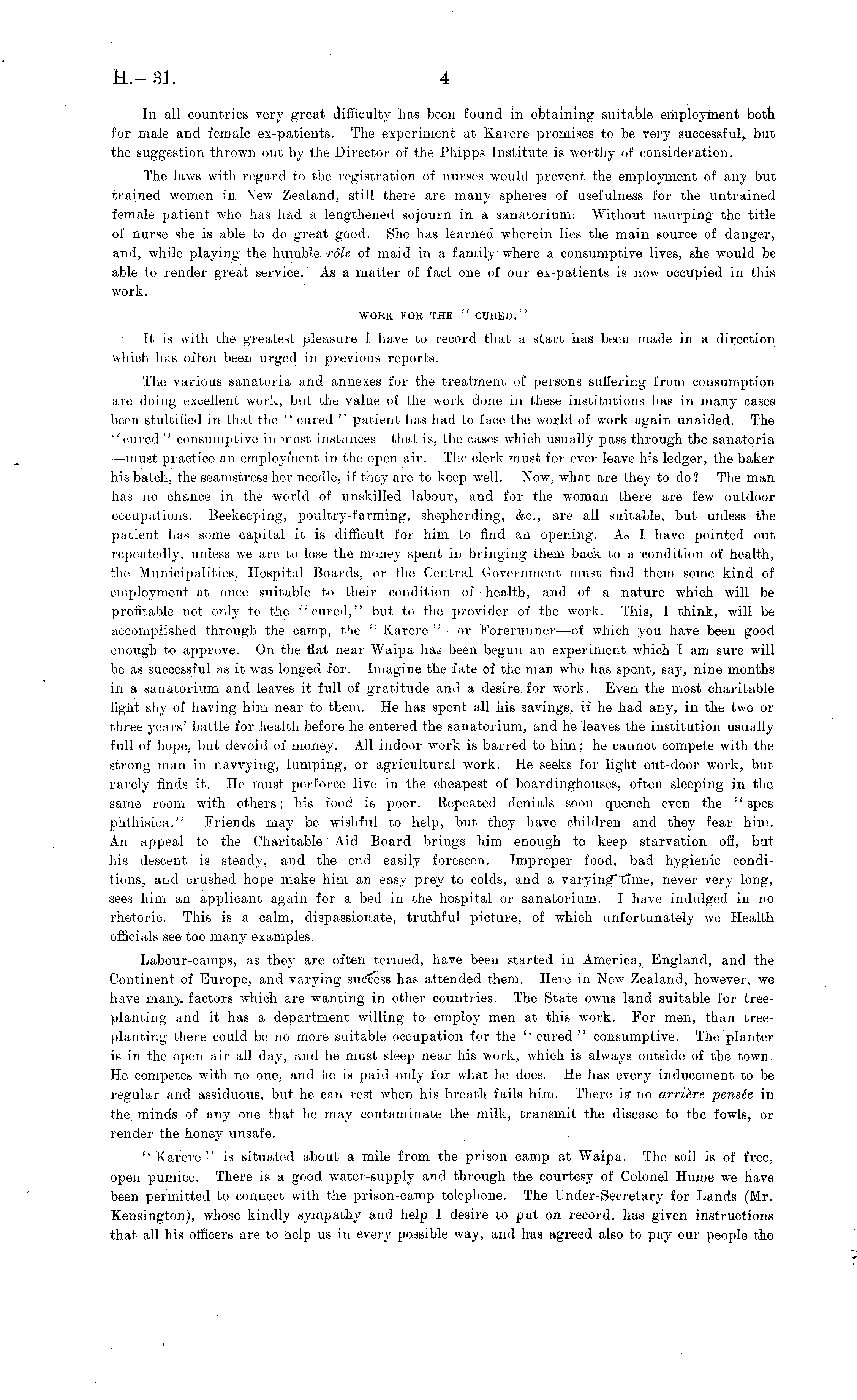 In all countries very great difficulty has been found in obtaining suitable employment both for male and female ex-patients. The experiment at Karere promises to be very successful, but the suggestion thrown out by the Director of the Phipps Institute is worthy of consideration. The laws with regard to the registration of nurses would prevent the employment of any but trained women in New Zealand, still there are many spheres of usefulness for the untrained female patient who has had a lengthened sojourn in a sanatorium: Without usurping the title of nurse she is able to do great good. She has learned wherein lies the main source of danger, and, while playing the humble role of maid in a family where a consumptive lives, she would be able to render great service. As a matter of fact one of our ex-patients is now occupied in this work. WORK FOR THE " CURED." It is with the greatest pleasure 1 have to record that a start has been made in a direction which has often been urged in previous reports. The various sanatoria and annexes for the treatment of persons suffering from consumption are doing excellent work, but the value of the work done in these institutions has in many cases been stultified in that the " cured " patient has had to face the world of work again unaided. The ''cured" consumptive in most instances —that is, the cases which usually pass through the sanatoria —must practice an employment in the open air. The clerk must for ever leave his ledger, the baker his batch, the seamstress her needle, if they are to keep well. Now, what are they to do? The man has no chance in the world of unskilled labour, and for the woman there are few outdoor occupations. Beekeeping, poultry-farming, shepherding, &c, are all suitable, but unless the patient has some capital it is difficult for him to find an opening. As I have pointed out repeatedly, unless we are to lose the money spent in bringing them back to a condition of health, the Municipalities, Hospital Boards, or the Central Government must find them some kind of employment at once suitable to their condition of health, and of a nature which will be profitable not only to the ''cured," but to the provider of the work. This, I think, will be accomplished through the camp, the "Karere"—or Forerunner—of which you have been good enough to approve. On the flat near Waipa has been begun an experiment which I am sure will be as successful as it was longed for. Imagine the fate of the man who has spent, say, nine months in a sanatorium and leaves it full of gratitude and a desire for work. Even the most charitable tight shy of having him near to them. He has spent all his savings, if he had any, in the two or three years' battle for health before he entered the sanatorium, and he leaves the institution usually full of hope, but devoid of money. All indoor work is barred to him; he cannot compete with the strong man in navvying, lumping, or agricultural work. He seeks for light out-door work, but rarely finds it. He must perforce live in the cheapest of boardinghouses, often sleeping in the same room with others; his food is poor. Repeated denials soon quench even the " spes phthisica." Friends may be wishful to help, but they have children and they fear him. An appeal to the Charitable Aid Board brings him enough to keep starvation off, but his descent is steady, and the end easily foreseen. Improper food, bad hygienic conditions, and crushed hope make him an easy prey to colds, and a varying time, never very long, sees him an applicant again for a bed in the hospital or sanatorium. I have indulged in no rhetoric. This is a calm, dispassionate, truthful picture, of which unfortunately we Health officials see too many examples Labour-camps, as they are often termed, have been started in America, England, and the Continent of Europe, and varying success has attended them. Here in New Zealand, however, we have many, factors which are wanting in other countries. The State owns land suitable for treeplanting and it has a department willing to employ men at this work. For men, than treeplanting there could be no more suitable occupation for the "cured " consumptive. The planter is in the open air all day, and he must sleep near his work, which is always outside of the town. He competes with no one, and he is paid only for what he does. He has every inducement to be regular and assiduous, but he can rest when his breath fails him. There is no arriere pensee in the minds of any one that he may contaminate the milk, transmit the disease to the fowls, or render the honey unsafe. "Karere" is situated about a mile from the prison camp at Waipa. The soil is of free, open pumice. There is a good water-supply and through the courtesy of Colonel Hume we have been permitted to connect with the prison-camp telephone. The Under-Secretary for Lands (Mr. Kensington), whose kindly sympathy and help I desire to put on record, has given instructions that all his officers are to help us in every possible way, and has agreed also to pay our people the