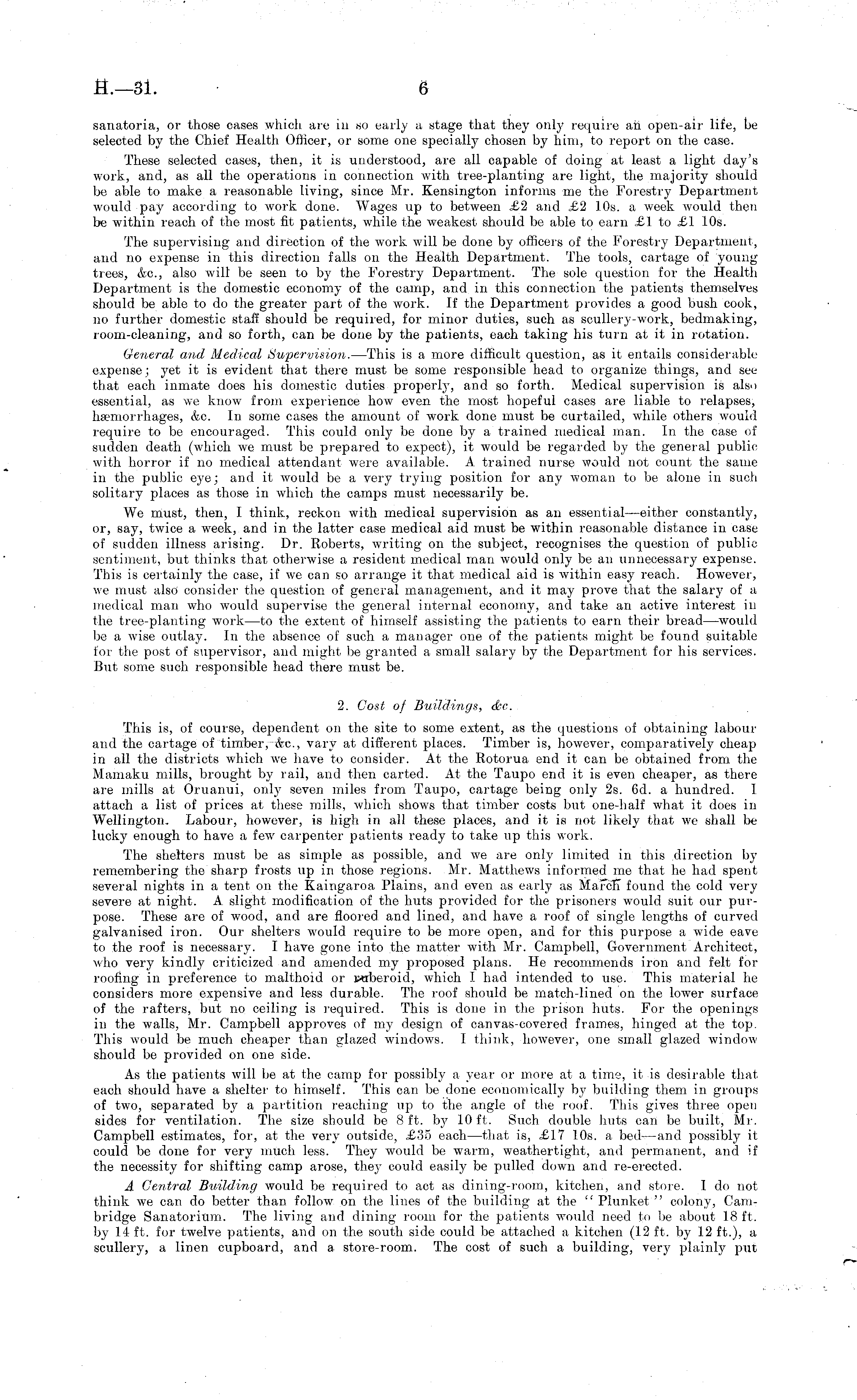 sanatoria, or those cases which are in so early a stage that they only require ah open-air life, be selected by the Chief Health Officer, or some one specialty chosen by him, to report on the case. These selected cases, then, it is understood, are all capable of doing at least a light day's work, and, as all the operations in connection with tree-planting are light, the majority should be able to make a reasonable living, since Mr. Kensington informs me the Forestry Department would pay according to work done. Wages up to between £2 and £2 10s. a week would then be within reach of the most fit patients, while the weakest should be able to earn £1 to £1 10s. The supervising and direction of the work will be done by officers of the Forestry Department, and no expense in this direction falls on the Health Department. The tools, cartage of young trees, &c, also will be seen to by the Forestry Department. The sole question for the Health Department is the domestic economy of the camp, and in this connection the patients themselves should be able to do the greater part of the work. If the Department provides a good bush cook, no further domestic staff should be required, for minor duties, such as scullery-work, bedmaking, room-cleaning, and so forth, can be done by the patients, each taking his turn at it in rotation. General and Medical Supervision. —This is a more difficult question, as it entails considerable expense; yet it is evident that there must be some responsible head to organize things, and see that each inmate does his domestic duties properly, and so forth. Medical supervision is also essential, as we know from experience how even the most hopeful cases are liable to relapses, haemorrhages, &c. In some cases the amount of work done must be curtailed, while others would require to be encouraged. This could only be done by a trained medical man. In the case of sudden death (which we must be prepared to expect), it would be regarded by the general public with horror if no medical attendant ware available. A trained nurse would not count the same in the public eye; and it would be a very trying position for any woman to be alone in such solitary places as those in which the camps must necessarily be. We must, then, I think, reckon with medical supervision as an essential—either constantly, or, say, twice a week, and in the latter case medical aid must be within reasonable distance in case of sudden illness arising. Dr. Roberts, writing on the subject, recognises the question of public sentiment, but thinks that otherwise a resident medical man would only be an unnecessary expense. This is certainly the case, if we can so arrange it that medical aid is within easy reach. However, we must also consider the question of general management, and it may prove that the salary of a medical man who would supervise the general internal economy, and take an active interest in the tree-planting work—to the extent of himself assisting the patients to earn their bread—would be a wise outlay. In the absence of such a manager one of the patients might be found suitable for the post of supervisor, and might be granted a small salary by the Department for his services. But some such responsible head there must be. 2. Cost of Buildings, &c. This is, of course, dependent on the site to some extent, as the questions of obtaining labour and the cartage of timber, &c, vary at different places. Timber is, however, comparatively cheap in all the districts which we have to consider. At the Rotorua end it can be obtained from the Mamaku mills, brought by rail, and then carted. At the Taupo end it is even cheaper, as there are mills at Oruanui, only seven miles from Taupo, cartage being only 2s. 6d. a hundred. I attach a list of prices at these mills, which shows that timber costs but one-half what it does in Wellington. Labour, however, is high in all these places, and it is not likely that we shall be lucky enough to have a few carpenter patients ready to take up this work. The shelters must be as simple as possible, and we are only limited in this direction by remembering the sharp frosts up in those regions. Mr. Matthews informed me that he had spent several nights in a tent on the Kaingaroa Plains, and even as early as March found the cold very severe at night. A slight modification of the huts provided for the prisoners would suit our purpose. These are of wood, and are floored and lined, and have a roof of single lengths of curved galvanised iron. Our shelters would require to be more open, and for this purpose a wide cave to the roof is necessary. I have gone into the matter with Mr. Campbell, Government Architect, who very kindly criticized and amended my proposed plans. He recommends iron and felt for roofing in preference to malthoid or »«beroid, which I had intended to use. This material he considers more expensive and less durable. The roof should be match-lined on the lower surface of the rafters, but no ceiling is required. This is done in the prison huts. For the openings in the walls, Mr. Campbell approves of my design of canvas-covered frames, hinged at the top. This would be much cheaper than glazed windows. I think, however, one small glazed window should be provided on one side. As the patients will be at the camp for possibly a year or more at a time, it is desirable that each should have a shelter to himself. This can be done economically by building them in groups of two, separated by a partition reaching up to the angle of the roof. This gives three open sides for ventilation. The size should be 8 ft. by 10 ft. Such double huts can be built, Mr. Campbell estimates, for, at the very outside, £35 each—that is, £17 10s. a bed —and possibly it could be done for very much less. They would be warm, weathertight, and permanent, and if the necessity for shifting camp arose, they could easily be pulled down and re-erected. A Central Building would be required to act as dining-