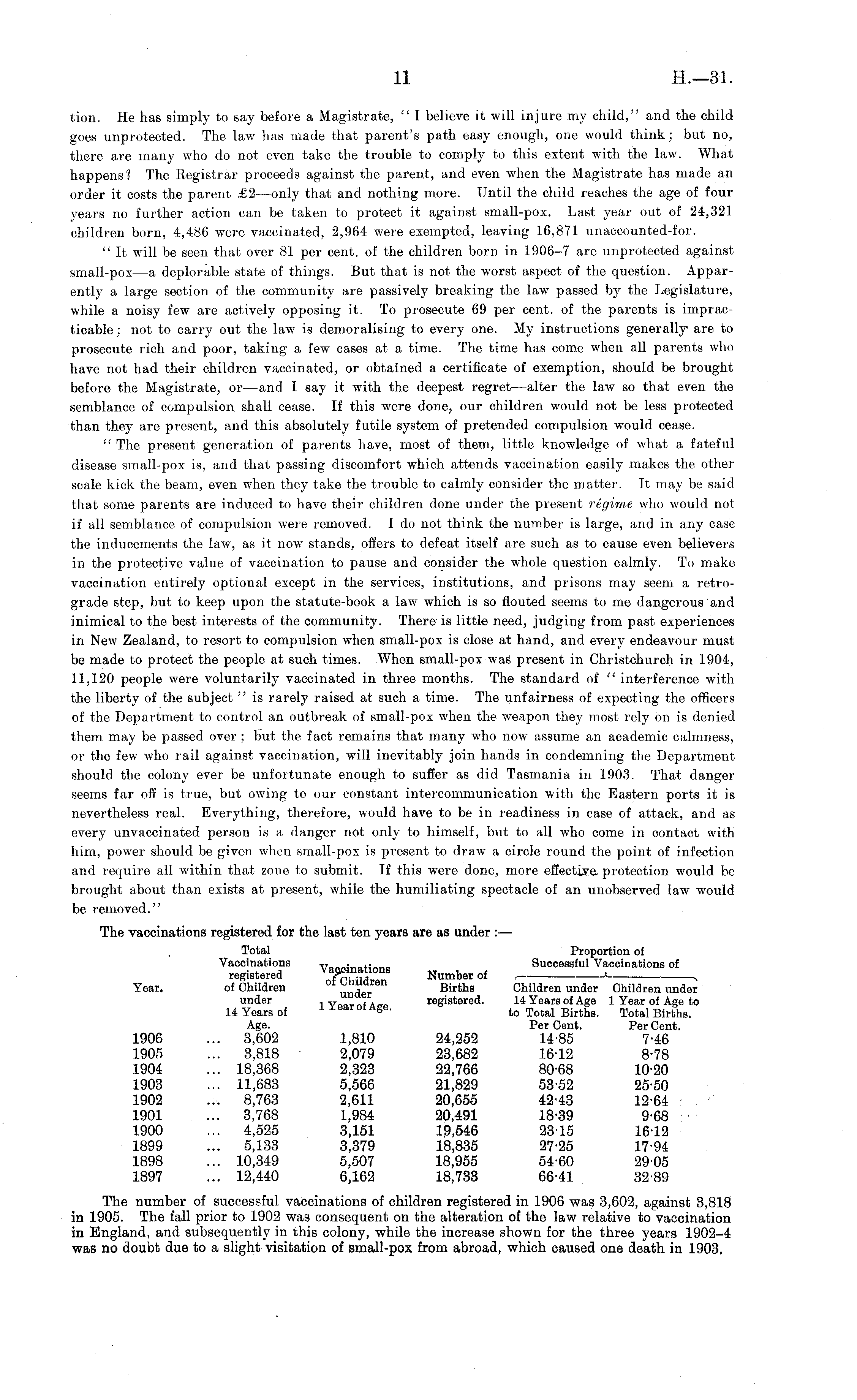 tion. He has simply to say before a Magistrate, " I believe it will injure my child," and the child goes unprotected. The law has made that parent's path easy enough, one would think; but no, there are many who do not even take the trouble to comply to this extent with the law. What happens? The Registrar proceeds against the parent, and even when the Magistrate has made an order it costs the parent £2—only that and nothing more. Until the child reaches the age of four years no further action can be taken to protect it against small-pox. Last year out of 24,321 children born, 4,486 were vaccinated, 2,964 were exempted, leaving 16,871 unaccounted-for. "It will be seen that over 81 per cent, of the children born in 1906-7 are unprotected against small-pox—a deplorable state of things. But that is not the worst aspect of the question. Apparently a large section of the community are passively breaking the law passed by the Legislature, while a noisy few are actively opposing it. To prosecute 69 per cent, of the parents is impracticable; not to carry out the law is demoralising to every one. My instructions generally are to prosecute rich and poor, taking a few cases at a time. The time has come when all parents who have not had their children vaccinated, or obtained a certificate of exemption, should be brought before the Magistrate, or —and I say it with the deepest regrets—alter the law so that even the semblance of compulsion shall cease. If this were done, our children would not be less protected than they are present, and this absolutely futile system of pretended compulsion would cease. " The present generation of parents have, most of them, little knowledge of what a fateful disease small-pox is, and that passing discomfort which attends vaccination easily makes the other scale kick the beam, even when they take the trouble to calmly consider the matter. It may be said that some parents are induced to have their children done under the present regime who would not if all semblance of compulsion were removed. Ido not think the number is large, and in any case the inducements the law, as it now stands, offers to defeat itself are such as to cause even believers in the protective value of vaccination to pause and consider the whole question calmly. To make vaccination entirely optional except in the services, institutions, and prisons may seem a retrograde step, but to keep upon the statute-book a law which is so flouted seems to me dangerous and inimical to the best interests of the community. There is little need, judging from past experiences in New Zealand, to resort to compulsion when small-pox is close at hand, and every endeavour must be made to protect the people at such times. When small-pox was present in Christchurch in 1904, 11,120 people were voluntarily vaccinated in three months. The standard of " interference with the liberty of the subject "is rarely raised at such a time. The unfairness of expecting the officers of the Department to control an outbreak of small-pox when the weapon they most rely on is denied them may be passed over; but the fact remains that many who now assume an academic calmness, or the few who rail against vaccination, will inevitably join hands in condemning the Department should the colony ever be unfortunate enough to suffer as did Tasmania in 1903. That danger seems far off is true, but owing to our constant intercommunication with the Eastern ports it is nevertheless real. Everything, therefore, would have to be in readiness in case of attack, and as every unvaccinated person is a danger not only to himself, but to all who come in contact with him, power should be given when small-pox is present to draw a circle round the point of infection and require all within that zone to submit. If this were done, more effective protection would be brought about than exists at present, while the humiliating spectacle of an unobserved law would be removed." The vaccinations registered for the last ten years are as under : — Total Proportion of Vaccinations T7„„,,t_„n„_„ Successful Vaccinations of registered T™ Number of , ' < Year. of Children 0I Births Children under Children under under IVAomUm registered. 14 Years of Age 1 Year of Age to 14 Years of x xearoiage. to Total Births. Total Births. Age. Per Cent. Per Cent. 1906 ... 3,602 1,810 24,252 14-85 7-46 1905 ... 3,818 2,079 23,682 16-12 8-78 1904 ... 18,368 2,323 22,766 80-68 10-20 1903 ... 11,683 5,566 21,829 5352 25-50 1902 ... 8,763 2,611 20,655 42-43 12-64 1901 ... 3,768 1,984 20,491 18-39 9-68 1900 ... 4,525 3,151 19,546 23-15 16-12 1899 ... 5,133 3,379 18,835 27-25 1794 1898 ... 10,349 5,507 18,955 54-60 2905 1897 ... 12,440 6,162 18,733 66-41 32-89 The number of successful vaccinations of children registered in 1906 was 3,602, against 3,818 in 1905. The fall prior to 1902 was consequent on the alteration of the law relative to vaccination in England, and subsequently in this colony, while the increase shown for the three years 1902-4 was no doubt due to a slight visitation of small-pox from abroad, which caused one death in 1903.