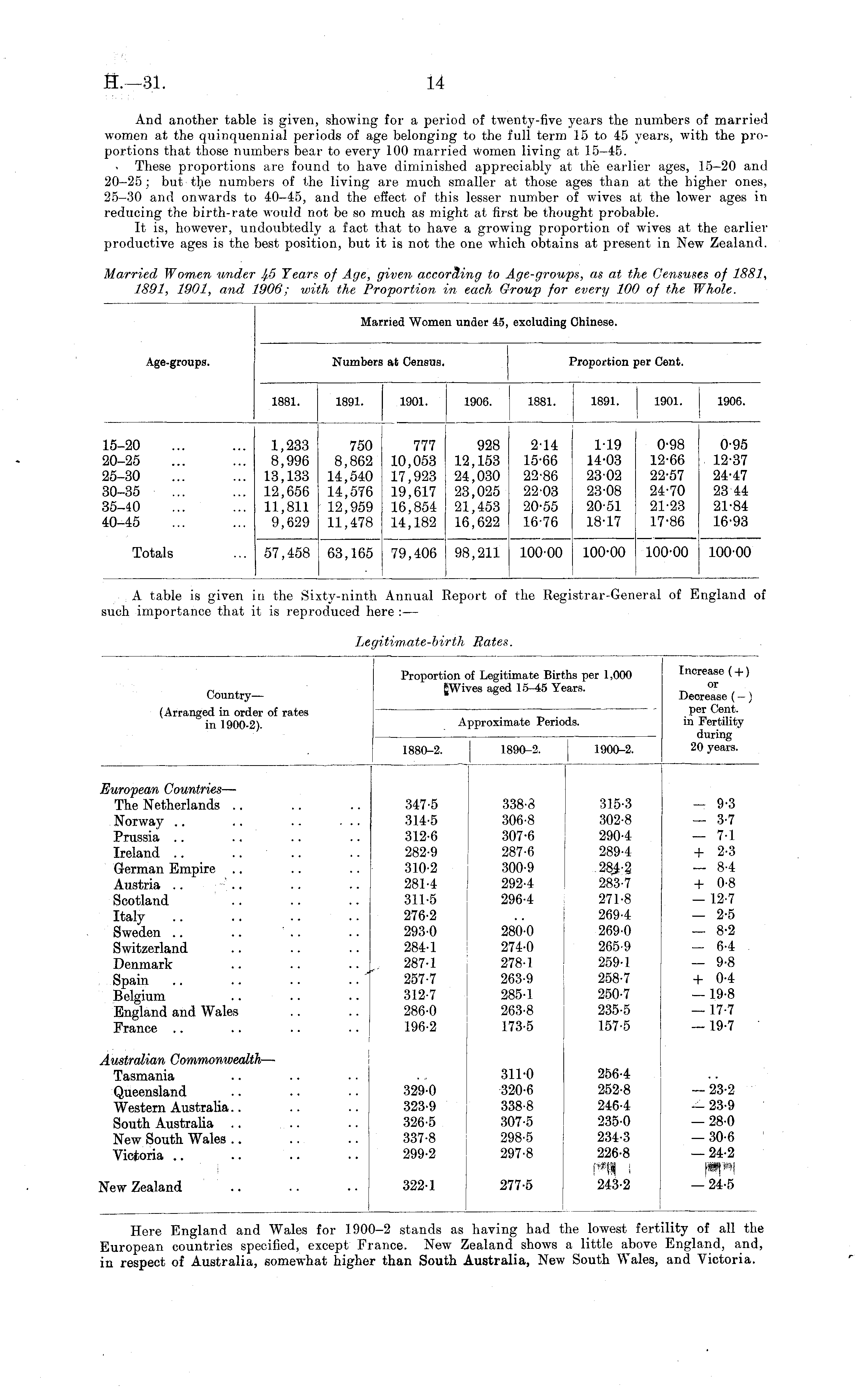 Proportion of Legitimate Births per 1,000 JWives aged 15—45 Years. Increase (+) or Country— (Arranged in order of rates in 1900-2). Decrease (-) per Cent. in Fertility during 20 years. Approximate Periods. 1880-2. 1890-2. 1900-2. European Countries — The Netherlands .. Norway Prussia Ireland .. German Empire .. Austria Scotland Italy Sweden Switzerland Denmark Spain Belgium England and Wales France 347-5 314-5 312-6 282-9 310-2 281-4 311-5 276-2 293-0 284-1 287-1 257-7 312-7 286-0 196-2 338-8 306-8 307-6 287-6 300-9 292-4 296-4 280-0 274-0 278-1 263-9 285-1 263-8 173-5 315-3 302-8 290-4 289-4 284-2 283-7 271-8 269-4 269-0 265-9 259-1 258-7 250-7 235-5 157-5 — 9-3 — 3-7 — 7-1 + 2-3 — 84 + 0-8 — 12-7 — 2-5 — 8-2 — 64 — 9-8 + 04 — 19-8 — 17-7 — 19-7 Australian Commonwealth — Tasmania Queensland Western Australia.. South Australia .. New South Wales .. Victoria 329-0 323-9 326-5 337-8 299-2 311-0 320-6 338-8 307-5 298-5 297-8 256-4 252-8 246-4 235-0 234-3 226-8 243-2 -23-2 — 23-9 — 280 — 30-6 -24-2 — 24-5 New Zealand 322-1 277-5 Here England and Wales for 190' European countries specified, except Fi in respect of Australia, somewhat highe 0—2 stands as ranee. New 5 :r than South . having had tl iealand shows i Australia, New ie lowest fert , little above South Wales, ;ility of all the England, and, and Victoria.