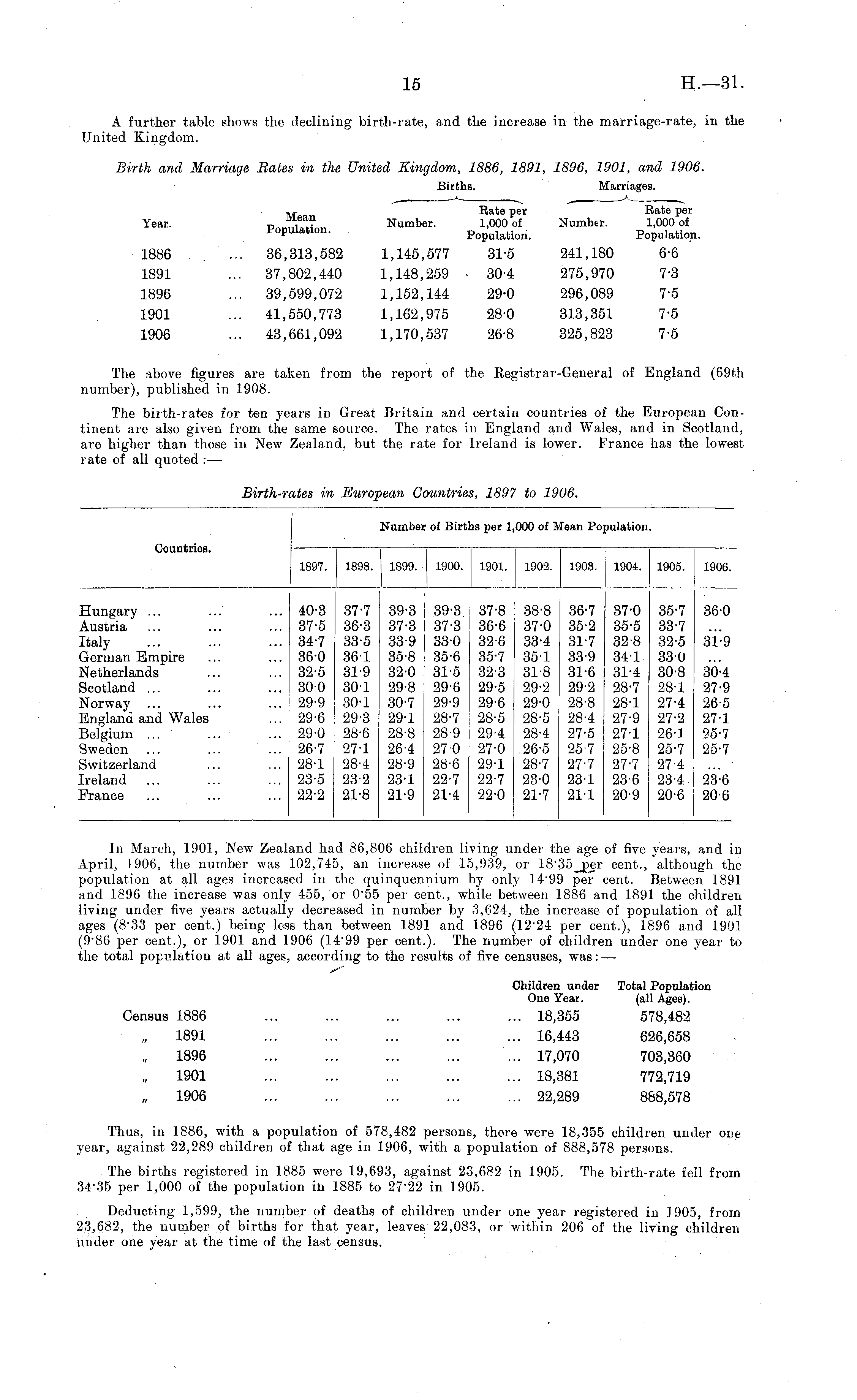 A further table shows the declining birth-rate, and the Increase in the marriage-rate, in the United Kingdom. Birth and Marriage Rates in the United Kingdom, 1886, 1891, 1896, 1901, and 1906. Births. Marriages. M Eate per Rate per Year. D ,*? Number. 1,000 of Number. 1,000 of P °P ulatlon - Population. Population. 1886 ... 36,313,582 1,145,577 31-5 241,180 6-6 1891 ... 37,802,440 1,148,259 30-4 275,970 7-3 1896 ... 39,599,072 1,152,144 29-0 296,089 7-5 1901 ... 41,550,773 1,162,975 280 313,351 7-5 1906 ... 43,661,092 1,170,537 26-8 325,823 7-5 The above figures are taken from the report of the Registrar-General of England (69th number), published in 1908. The birth-rates for ten years in Great Britain and certain countries of the European Continent are also given from the same source. The rates in England and Wales, and in Scotland, are higher than those in New Zealand, but the rate for Ireland is lower. France has the lowest rate of all quoted : —