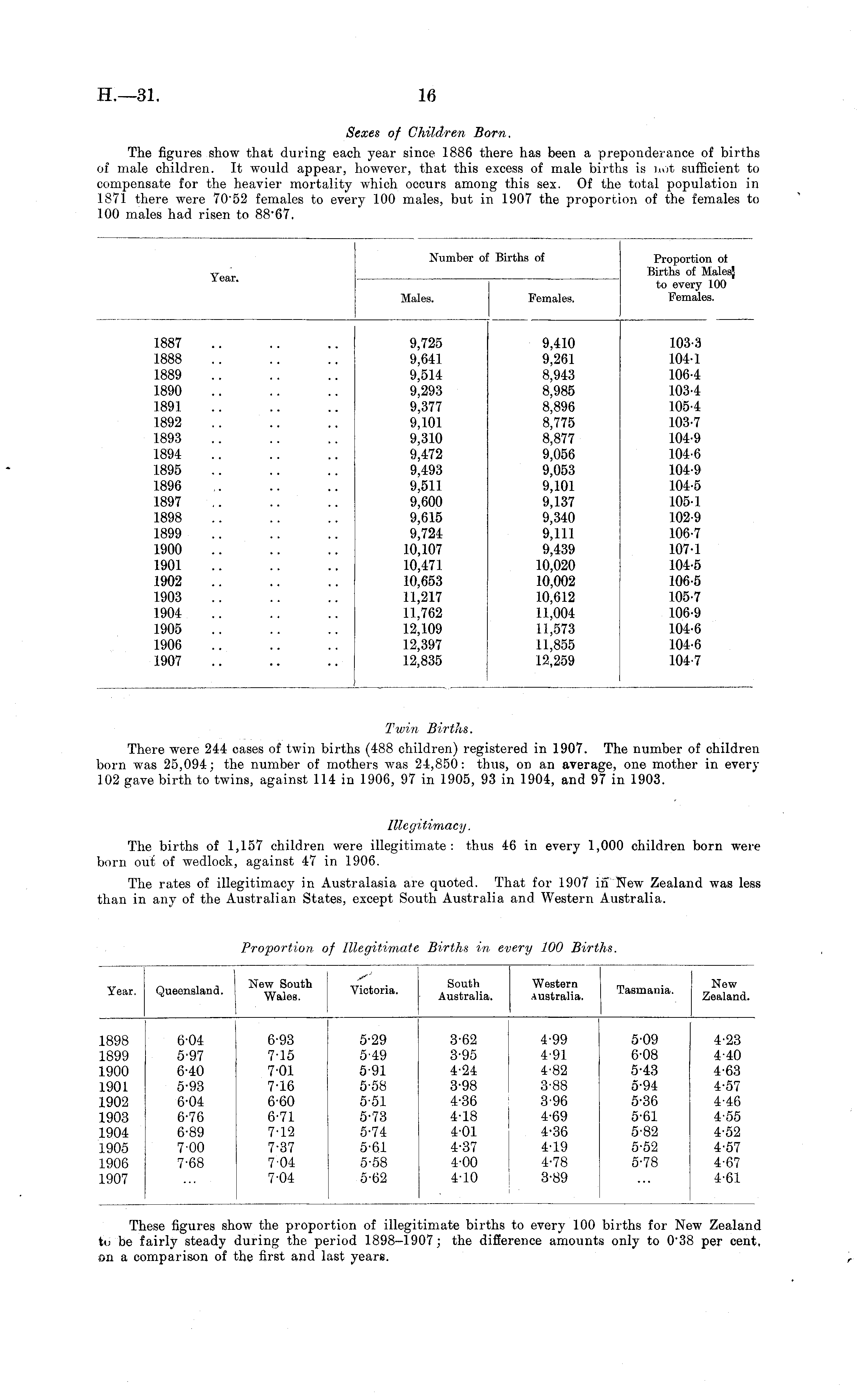 Twin Births. There were 244 cases of twin births (488 children) registered in 1907. The number of children born was 25,094; the number of mothers was 24,850: thus, on an average, one mother in every 102 gave birth to twins, against 114 in 1906, 97 in 1905, 93 in 1904, and 97 in 1903. Illegitimacy. The births of 1,157 children were illegitimate: thus 46 in every 1,000 children born were born out of wedlock, against 47 in 1906. The rates of illegitimacy in Australasia are quoted. That for 1907 in New Zealand was less than in any of the Australian States, except South Australia and Western Australia.